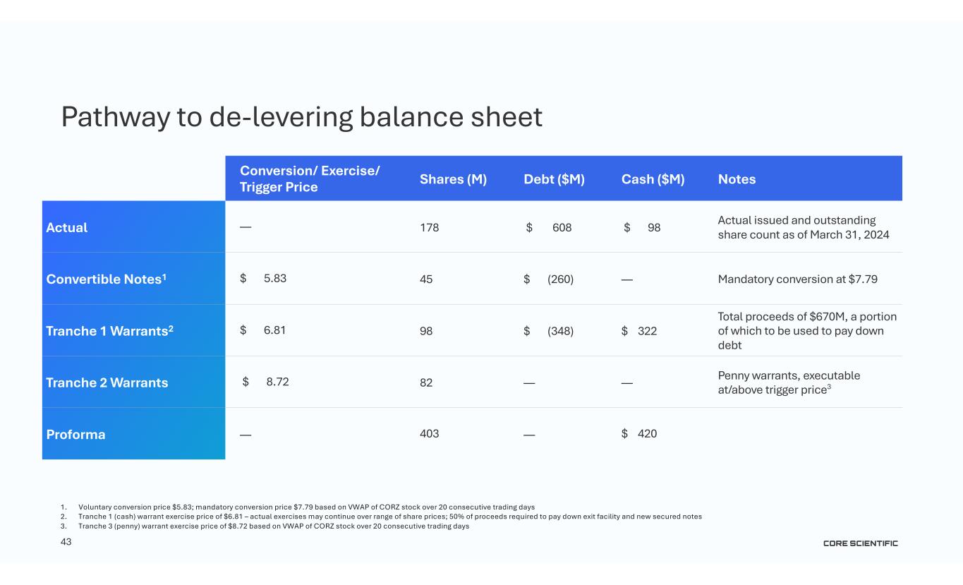 43 Conversion/ Exercise/ Trigger Price Shares (M) Debt ($M) Cash ($M) Notes Actual — 178 $ 608 $ 98 Actual issued and outstanding share count as of March 31, 2024 Convertible Notes1 $ 5.83 45 $ (260) — Mandatory conversion at $7.79 Tranche 1 Warrants2 $ 6.81 98 $ (348) $ 322 Total proceeds of $670M, a portion of which to be used to pay down debt Tranche 2 Warrants $ 8.72 82 — — Penny warrants, executable at/above trigger price3 Proforma — 403 — $ 420 Pathway to de-levering balance sheet 1. Voluntary conversion price $5.83; mandatory conversion price $7.79 based on VWAP of CORZ stock over 20 consecutive trading days 2. Tranche 1 (cash) warrant exercise price of $6.81 – actual exercises may continue over range of share prices; 50% of proceeds required to pay down exit facility and new secured notes 3. Tranche 3 (penny) warrant exercise price of $8.72 based on VWAP of CORZ stock over 20 consecutive trading days