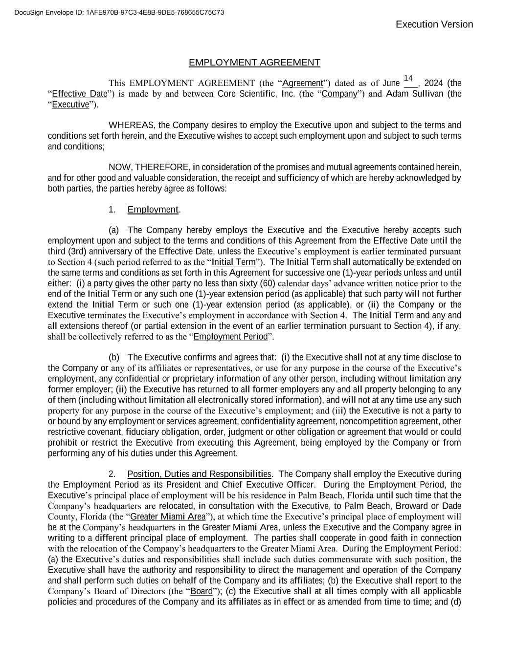 Execution Version EMPLOYMENT AGREEMENT This EMPLOYMENT AGREEMENT (the “Agreement”) dated as of June ___, 2024 (the “Effective Date”) is made by and between Core Scientific, Inc. (the “Company”) and Adam Sullivan (the “Executive”). WHEREAS, the Company desires to employ the Executive upon and subject to the terms and conditions set forth herein, and the Executive wishes to accept such employment upon and subject to such terms and conditions; NOW, THEREFORE, in consideration of the promises and mutual agreements contained herein, and for other good and valuable consideration, the receipt and sufficiency of which are hereby acknowledged by both parties, the parties hereby agree as follows: 1. Employment. (a) The Company hereby employs the Executive and the Executive hereby accepts such employment upon and subject to the terms and conditions of this Agreement from the Effective Date until the third (3rd) anniversary of the Effective Date, unless the Executive’s employment is earlier terminated pursuant to Section 4 (such period referred to as the “Initial Term”). The Initial Term shall automatically be extended on the same terms and conditions as set forth in this Agreement for successive one (1)-year periods unless and until either: (i) a party gives the other party no less than sixty (60) calendar days’ advance written notice prior to the end of the Initial Term or any such one (1)-year extension period (as applicable) that such party will not further extend the Initial Term or such one (1)-year extension period (as applicable), or (ii) the Company or the Executive terminates the Executive’s employment in accordance with Section 4. The Initial Term and any and all extensions thereof (or partial extension in the event of an earlier termination pursuant to Section 4), if any, shall be collectively referred to as the “Employment Period”. (b) The Executive confirms and agrees that: (i) the Executive shall not at any time disclose to the Company or any of its affiliates or representatives, or use for any purpose in the course of the Executive’s employment, any confidential or proprietary information of any other person, including without limitation any former employer; (ii) the Executive has returned to all former employers any and all property belonging to any of them (including without limitation all electronically stored information), and will not at any time use any such property for any purpose in the course of the Executive’s employment; and (iii) the Executive is not a party to or bound by any employment or services agreement, confidentiality agreement, noncompetition agreement, other restrictive covenant, fiduciary obligation, order, judgment or other obligation or agreement that would or could prohibit or restrict the Executive from executing this Agreement, being employed by the Company or from performing any of his duties under this Agreement. 2. Position, Duties and Responsibilities. The Company shall employ the Executive during the Employment Period as its President and Chief Executive Officer. During the Employment Period, the Executive’s principal place of employment will be his residence in Palm Beach, Florida until such time that the Company’s headquarters are relocated, in consultation with the Executive, to Palm Beach, Broward or Dade County, Florida (the “Greater Miami Area”), at which time the Executive’s principal place of employment will be at the Company’s headquarters in the Greater Miami Area, unless the Executive and the Company agree in writing to a different principal place of employment. The parties shall cooperate in good faith in connection with the relocation of the Company’s headquarters to the Greater Miami Area. During the Employment Period: (a) the Executive’s duties and responsibilities shall include such duties commensurate with such position, the Executive shall have the authority and responsibility to direct the management and operation of the Company and shall perform such duties on behalf of the Company and its affiliates; (b) the Executive shall report to the Company’s Board of Directors (the “Board”); (c) the Executive shall at all times comply with all applicable policies and procedures of the Company and its affiliates as in effect or as amended from time to time; and (d) DocuSign Envelope ID: 30433199-F39C-4410-84F6-189535485E6B1AFE970B-97 3-4E8B-9DE5-768655C75C73 14