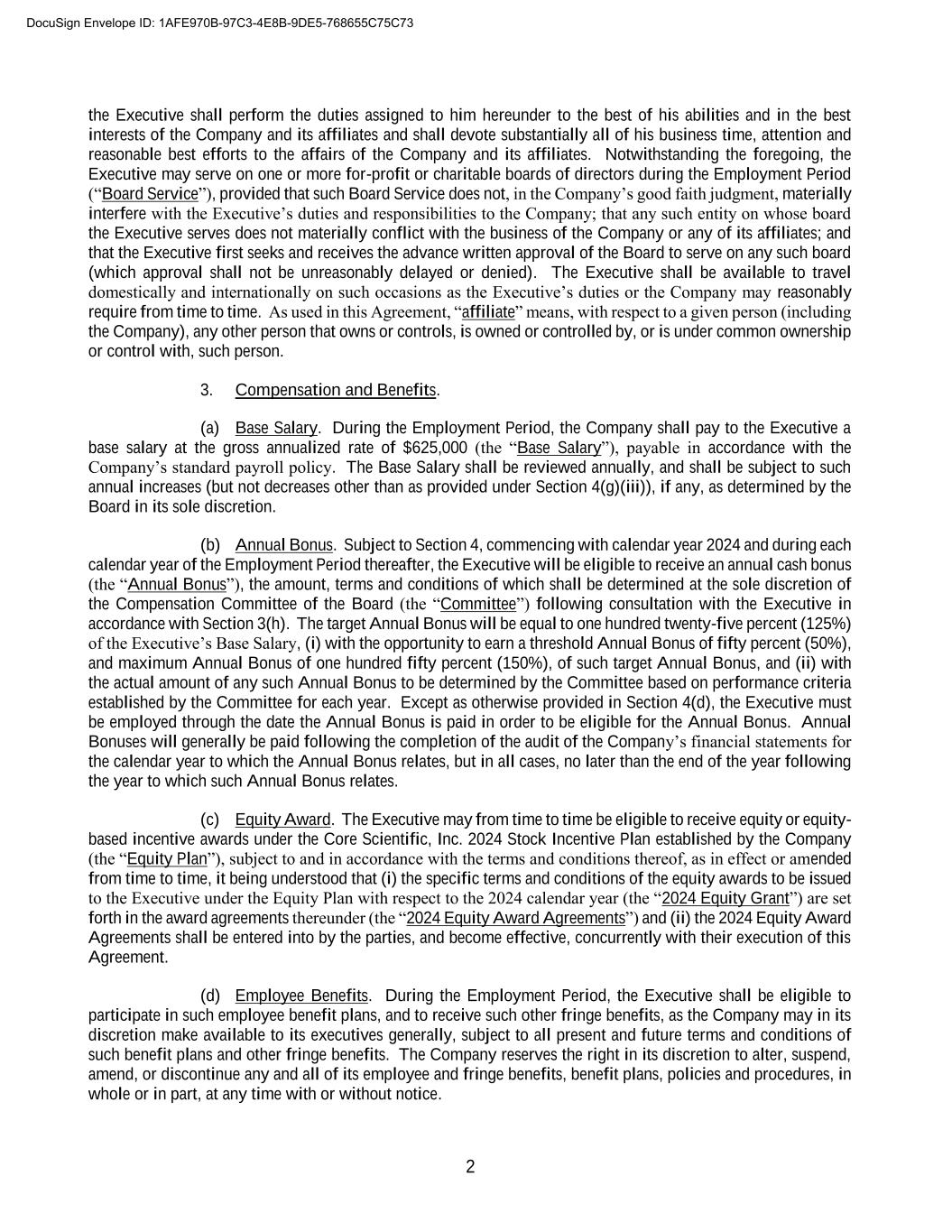2 the Executive shall perform the duties assigned to him hereunder to the best of his abilities and in the best interests of the Company and its affiliates and shall devote substantially all of his business time, attention and reasonable best efforts to the affairs of the Company and its affiliates. Notwithstanding the foregoing, the Executive may serve on one or more for-profit or charitable boards of directors during the Employment Period (“Board Service”), provided that such Board Service does not, in the Company’s good faith judgment, materially interfere with the Executive’s duties and responsibilities to the Company; that any such entity on whose board the Executive serves does not materially conflict with the business of the Company or any of its affiliates; and that the Executive first seeks and receives the advance written approval of the Board to serve on any such board (which approval shall not be unreasonably delayed or denied). The Executive shall be available to travel domestically and internationally on such occasions as the Executive’s duties or the Company may reasonably require from time to time. As used in this Agreement, “affiliate” means, with respect to a given person (including the Company), any other person that owns or controls, is owned or controlled by, or is under common ownership or control with, such person. 3. Compensation and Benefits. (a) Base Salary. During the Employment Period, the Company shall pay to the Executive a base salary at the gross annualized rate of $625,000 (the “Base Salary”), payable in accordance with the Company’s standard payroll policy. The Base Salary shall be reviewed annually, and shall be subject to such annual increases (but not decreases other than as provided under Section 4(g)(iii)), if any, as determined by the Board in its sole discretion. (b) Annual Bonus. Subject to Section 4, commencing with calendar year 2024 and during each calendar year of the Employment Period thereafter, the Executive will be eligible to receive an annual cash bonus (the “Annual Bonus”), the amount, terms and conditions of which shall be determined at the sole discretion of the Compensation Committee of the Board (the “Committee”) following consultation with the Executive in accordance with Section 3(h). The target Annual Bonus will be equal to one hundred twenty-five percent (125%) of the Executive’s Base Salary, (i) with the opportunity to earn a threshold Annual Bonus of fifty percent (50%), and maximum Annual Bonus of one hundred fifty percent (150%), of such target Annual Bonus, and (ii) with the actual amount of any such Annual Bonus to be determined by the Committee based on performance criteria established by the Committee for each year. Except as otherwise provided in Section 4(d), the Executive must be employed through the date the Annual Bonus is paid in order to be eligible for the Annual Bonus. Annual Bonuses will generally be paid following the completion of the audit of the Company’s financial statements for the calendar year to which the Annual Bonus relates, but in all cases, no later than the end of the year following the year to which such Annual Bonus relates. (c) Equity Award. The Executive may from time to time be eligible to receive equity or equity- based incentive awards under the Core Scientific, Inc. 2024 Stock Incentive Plan established by the Company (the “Equity Plan”), subject to and in accordance with the terms and conditions thereof, as in effect or amended from time to time, it being understood that (i) the specific terms and conditions of the equity awards to be issued to the Executive under the Equity Plan with respect to the 2024 calendar year (the “2024 Equity Grant”) are set forth in the award agreements thereunder (the “2024 Equity Award Agreements”) and (ii) the 2024 Equity Award Agreements shall be entered into by the parties, and become effective, concurrently with their execution of this Agreement. (d) Employee Benefits. During the Employment Period, the Executive shall be eligible to participate in such employee benefit plans, and to receive such other fringe benefits, as the Company may in its discretion make available to its executives generally, subject to all present and future terms and conditions of such benefit plans and other fringe benefits. The Company reserves the right in its discretion to alter, suspend, amend, or discontinue any and all of its employee and fringe benefits, benefit plans, policies and procedures, in whole or in part, at any time with or without notice. DocuSign Envelope ID: 30433199-F39C-4410-84F6-189535485E6B1AFE970B-97 3-4E8B-9DE5-768655C75C73