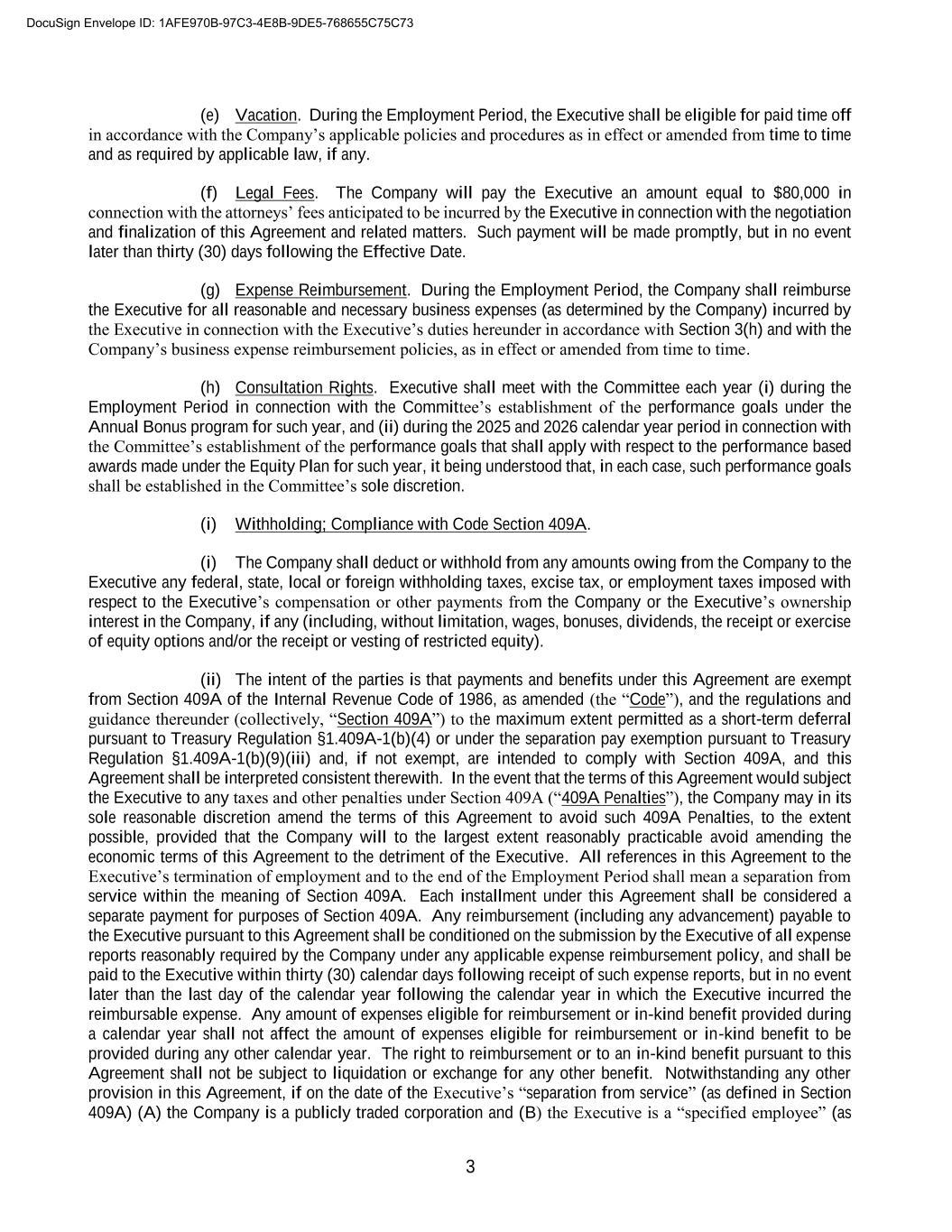3 (e) Vacation. During the Employment Period, the Executive shall be eligible for paid time off in accordance with the Company’s applicable policies and procedures as in effect or amended from time to time and as required by applicable law, if any. (f) Legal Fees. The Company will pay the Executive an amount equal to $80,000 in connection with the attorneys’ fees anticipated to be incurred by the Executive in connection with the negotiation and finalization of this Agreement and related matters. Such payment will be made promptly, but in no event later than thirty (30) days following the Effective Date. (g) Expense Reimbursement. During the Employment Period, the Company shall reimburse the Executive for all reasonable and necessary business expenses (as determined by the Company) incurred by the Executive in connection with the Executive’s duties hereunder in accordance with Section 3(h) and with the Company’s business expense reimbursement policies, as in effect or amended from time to time. (h) Consultation Rights. Executive shall meet with the Committee each year (i) during the Employment Period in connection with the Committee’s establishment of the performance goals under the Annual Bonus program for such year, and (ii) during the 2025 and 2026 calendar year period in connection with the Committee’s establishment of the performance goals that shall apply with respect to the performance based awards made under the Equity Plan for such year, it being understood that, in each case, such performance goals shall be established in the Committee’s sole discretion. (i) Withholding; Compliance with Code Section 409A. (i) The Company shall deduct or withhold from any amounts owing from the Company to the Executive any federal, state, local or foreign withholding taxes, excise tax, or employment taxes imposed with respect to the Executive’s compensation or other payments from the Company or the Executive’s ownership interest in the Company, if any (including, without limitation, wages, bonuses, dividends, the receipt or exercise of equity options and/or the receipt or vesting of restricted equity). (ii) The intent of the parties is that payments and benefits under this Agreement are exempt from Section 409A of the Internal Revenue Code of 1986, as amended (the “Code”), and the regulations and guidance thereunder (collectively, “Section 409A”) to the maximum extent permitted as a short-term deferral pursuant to Treasury Regulation §1.409A-1(b)(4) or under the separation pay exemption pursuant to Treasury Regulation §1.409A-1(b)(9)(iii) and, if not exempt, are intended to comply with Section 409A, and this Agreement shall be interpreted consistent therewith. In the event that the terms of this Agreement would subject the Executive to any taxes and other penalties under Section 409A (“409A Penalties”), the Company may in its sole reasonable discretion amend the terms of this Agreement to avoid such 409A Penalties, to the extent possible, provided that the Company will to the largest extent reasonably practicable avoid amending the economic terms of this Agreement to the detriment of the Executive. All references in this Agreement to the Executive’s termination of employment and to the end of the Employment Period shall mean a separation from service within the meaning of Section 409A. Each installment under this Agreement shall be considered a separate payment for purposes of Section 409A. Any reimbursement (including any advancement) payable to the Executive pursuant to this Agreement shall be conditioned on the submission by the Executive of all expense reports reasonably required by the Company under any applicable expense reimbursement policy, and shall be paid to the Executive within thirty (30) calendar days following receipt of such expense reports, but in no event later than the last day of the calendar year following the calendar year in which the Executive incurred the reimbursable expense. Any amount of expenses eligible for reimbursement or in-kind benefit provided during a calendar year shall not affect the amount of expenses eligible for reimbursement or in-kind benefit to be provided during any other calendar year. The right to reimbursement or to an in-kind benefit pursuant to this Agreement shall not be subject to liquidation or exchange for any other benefit. Notwithstanding any other provision in this Agreement, if on the date of the Executive’s “separation from service” (as defined in Section 409A) (A) the Company is a publicly traded corporation and (B) the Executive is a “specified employee” (as DocuSign Envelope ID: 30433199-F39C-4410-84F6-189535485E6B1AFE970B-97 3-4E8B-9DE5-768655C75C73