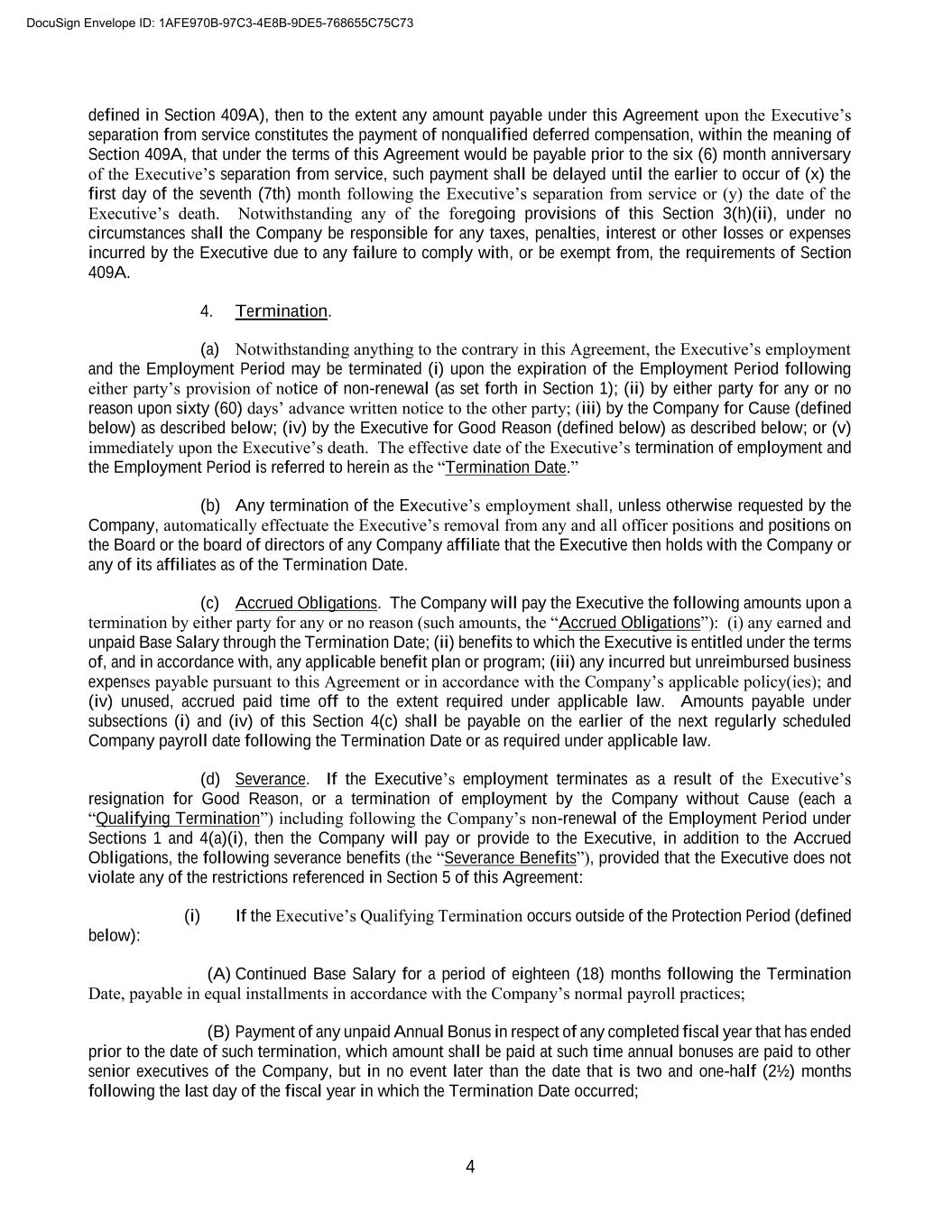 4 defined in Section 409A), then to the extent any amount payable under this Agreement upon the Executive’s separation from service constitutes the payment of nonqualified deferred compensation, within the meaning of Section 409A, that under the terms of this Agreement would be payable prior to the six (6) month anniversary of the Executive’s separation from service, such payment shall be delayed until the earlier to occur of (x) the first day of the seventh (7th) month following the Executive’s separation from service or (y) the date of the Executive’s death. Notwithstanding any of the foregoing provisions of this Section 3(h)(ii), under no circumstances shall the Company be responsible for any taxes, penalties, interest or other losses or expenses incurred by the Executive due to any failure to comply with, or be exempt from, the requirements of Section 409A. 4. Termination. (a) Notwithstanding anything to the contrary in this Agreement, the Executive’s employment and the Employment Period may be terminated (i) upon the expiration of the Employment Period following either party’s provision of notice of non-renewal (as set forth in Section 1); (ii) by either party for any or no reason upon sixty (60) days’ advance written notice to the other party; (iii) by the Company for Cause (defined below) as described below; (iv) by the Executive for Good Reason (defined below) as described below; or (v) immediately upon the Executive’s death. The effective date of the Executive’s termination of employment and the Employment Period is referred to herein as the “Termination Date.” (b) Any termination of the Executive’s employment shall, unless otherwise requested by the Company, automatically effectuate the Executive’s removal from any and all officer positions and positions on the Board or the board of directors of any Company affiliate that the Executive then holds with the Company or any of its affiliates as of the Termination Date. (c) Accrued Obligations. The Company will pay the Executive the following amounts upon a termination by either party for any or no reason (such amounts, the “Accrued Obligations”): (i) any earned and unpaid Base Salary through the Termination Date; (ii) benefits to which the Executive is entitled under the terms of, and in accordance with, any applicable benefit plan or program; (iii) any incurred but unreimbursed business expenses payable pursuant to this Agreement or in accordance with the Company’s applicable policy(ies); and (iv) unused, accrued paid time off to the extent required under applicable law. Amounts payable under subsections (i) and (iv) of this Section 4(c) shall be payable on the earlier of the next regularly scheduled Company payroll date following the Termination Date or as required under applicable law. (d) Severance. If the Executive’s employment terminates as a result of the Executive’s resignation for Good Reason, or a termination of employment by the Company without Cause (each a “Qualifying Termination”) including following the Company’s non-renewal of the Employment Period under Sections 1 and 4(a)(i), then the Company will pay or provide to the Executive, in addition to the Accrued Obligations, the following severance benefits (the “Severance Benefits”), provided that the Executive does not violate any of the restrictions referenced in Section 5 of this Agreement: (i) If the Executive’s Qualifying Termination occurs outside of the Protection Period (defined below): (A) Continued Base Salary for a period of eighteen (18) months following the Termination Date, payable in equal installments in accordance with the Company’s normal payroll practices; (B) Payment of any unpaid Annual Bonus in respect of any completed fiscal year that has ended prior to the date of such termination, which amount shall be paid at such time annual bonuses are paid to other senior executives of the Company, but in no event later than the date that is two and one-half (2½) months following the last day of the fiscal year in which the Termination Date occurred; DocuSign Envelope ID: 30433199-F39C-4410-84F6-189535485E6B1AFE970B-97 3-4E8B-9DE5-768655C75C73
