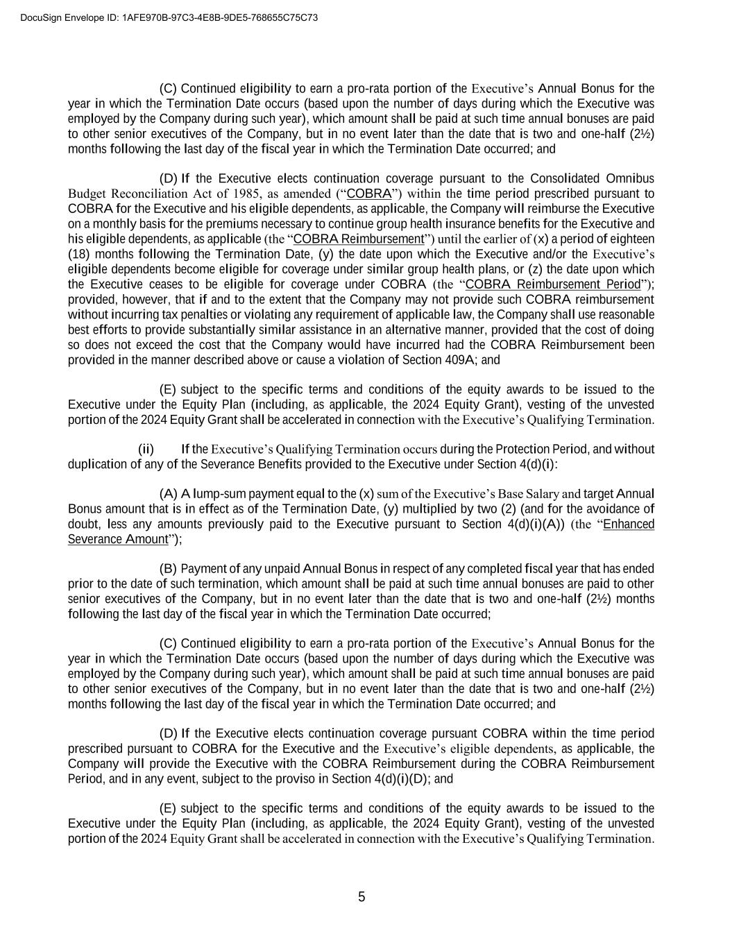 5 (C) Continued eligibility to earn a pro-rata portion of the Executive’s Annual Bonus for the year in which the Termination Date occurs (based upon the number of days during which the Executive was employed by the Company during such year), which amount shall be paid at such time annual bonuses are paid to other senior executives of the Company, but in no event later than the date that is two and one-half (2½) months following the last day of the fiscal year in which the Termination Date occurred; and (D) If the Executive elects continuation coverage pursuant to the Consolidated Omnibus Budget Reconciliation Act of 1985, as amended (“COBRA”) within the time period prescribed pursuant to COBRA for the Executive and his eligible dependents, as applicable, the Company will reimburse the Executive on a monthly basis for the premiums necessary to continue group health insurance benefits for the Executive and his eligible dependents, as applicable (the “COBRA Reimbursement”) until the earlier of (x) a period of eighteen (18) months following the Termination Date, (y) the date upon which the Executive and/or the Executive’s eligible dependents become eligible for coverage under similar group health plans, or (z) the date upon which the Executive ceases to be eligible for coverage under COBRA (the “COBRA Reimbursement Period”); provided, however, that if and to the extent that the Company may not provide such COBRA reimbursement without incurring tax penalties or violating any requirement of applicable law, the Company shall use reasonable best efforts to provide substantially similar assistance in an alternative manner, provided that the cost of doing so does not exceed the cost that the Company would have incurred had the COBRA Reimbursement been provided in the manner described above or cause a violation of Section 409A; and (E) subject to the specific terms and conditions of the equity awards to be issued to the Executive under the Equity Plan (including, as applicable, the 2024 Equity Grant), vesting of the unvested portion of the 2024 Equity Grant shall be accelerated in connection with the Executive’s Qualifying Termination. (ii) If the Executive’s Qualifying Termination occurs during the Protection Period, and without duplication of any of the Severance Benefits provided to the Executive under Section 4(d)(i): (A) A lump-sum payment equal to the (x) sum of the Executive’s Base Salary and target Annual Bonus amount that is in effect as of the Termination Date, (y) multiplied by two (2) (and for the avoidance of doubt, less any amounts previously paid to the Executive pursuant to Section 4(d)(i)(A)) (the “Enhanced Severance Amount”); (B) Payment of any unpaid Annual Bonus in respect of any completed fiscal year that has ended prior to the date of such termination, which amount shall be paid at such time annual bonuses are paid to other senior executives of the Company, but in no event later than the date that is two and one-half (2½) months following the last day of the fiscal year in which the Termination Date occurred; (C) Continued eligibility to earn a pro-rata portion of the Executive’s Annual Bonus for the year in which the Termination Date occurs (based upon the number of days during which the Executive was employed by the Company during such year), which amount shall be paid at such time annual bonuses are paid to other senior executives of the Company, but in no event later than the date that is two and one-half (2½) months following the last day of the fiscal year in which the Termination Date occurred; and (D) If the Executive elects continuation coverage pursuant COBRA within the time period prescribed pursuant to COBRA for the Executive and the Executive’s eligible dependents, as applicable, the Company will provide the Executive with the COBRA Reimbursement during the COBRA Reimbursement Period, and in any event, subject to the proviso in Section 4(d)(i)(D); and (E) subject to the specific terms and conditions of the equity awards to be issued to the Executive under the Equity Plan (including, as applicable, the 2024 Equity Grant), vesting of the unvested portion of the 2024 Equity Grant shall be accelerated in connection with the Executive’s Qualifying Termination. DocuSign Envelope ID: 30433199-F39C-4410-84F6-189535485E6B1AFE970B-97 3-4E8B-9DE5-768655C75C73