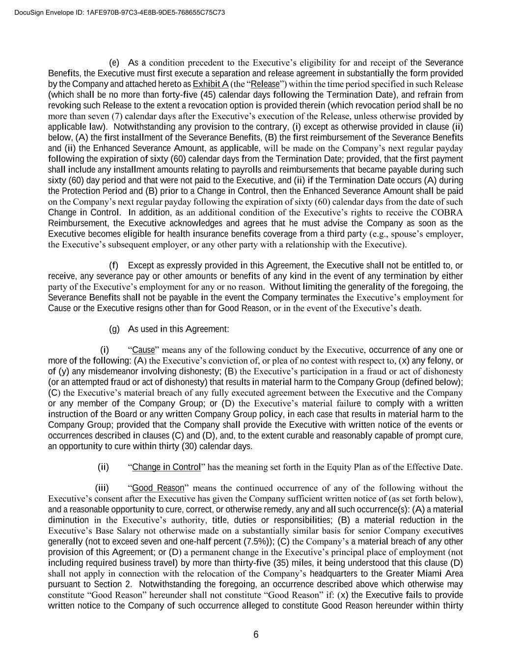 6 (e) As a condition precedent to the Executive’s eligibility for and receipt of the Severance Benefits, the Executive must first execute a separation and release agreement in substantially the form provided by the Company and attached hereto as Exhibit A (the “Release”) within the time period specified in such Release (which shall be no more than forty-five (45) calendar days following the Termination Date), and refrain from revoking such Release to the extent a revocation option is provided therein (which revocation period shall be no more than seven (7) calendar days after the Executive’s execution of the Release, unless otherwise provided by applicable law). Notwithstanding any provision to the contrary, (i) except as otherwise provided in clause (ii) below, (A) the first installment of the Severance Benefits, (B) the first reimbursement of the Severance Benefits and (ii) the Enhanced Severance Amount, as applicable, will be made on the Company’s next regular payday following the expiration of sixty (60) calendar days from the Termination Date; provided, that the first payment shall include any installment amounts relating to payrolls and reimbursements that became payable during such sixty (60) day period and that were not paid to the Executive, and (ii) if the Termination Date occurs (A) during the Protection Period and (B) prior to a Change in Control, then the Enhanced Severance Amount shall be paid on the Company’s next regular payday following the expiration of sixty (60) calendar days from the date of such Change in Control. In addition, as an additional condition of the Executive’s rights to receive the COBRA Reimbursement, the Executive acknowledges and agrees that he must advise the Company as soon as the Executive becomes eligible for health insurance benefits coverage from a third party (e.g., spouse’s employer, the Executive’s subsequent employer, or any other party with a relationship with the Executive). (f) Except as expressly provided in this Agreement, the Executive shall not be entitled to, or receive, any severance pay or other amounts or benefits of any kind in the event of any termination by either party of the Executive’s employment for any or no reason. Without limiting the generality of the foregoing, the Severance Benefits shall not be payable in the event the Company terminates the Executive’s employment for Cause or the Executive resigns other than for Good Reason, or in the event of the Executive’s death. (g) As used in this Agreement: (i) “Cause” means any of the following conduct by the Executive, occurrence of any one or more of the following: (A) the Executive’s conviction of, or plea of no contest with respect to, (x) any felony, or of (y) any misdemeanor involving dishonesty; (B) the Executive’s participation in a fraud or act of dishonesty (or an attempted fraud or act of dishonesty) that results in material harm to the Company Group (defined below); (C) the Executive’s material breach of any fully executed agreement between the Executive and the Company or any member of the Company Group; or (D) the Executive’s material failure to comply with a written instruction of the Board or any written Company Group policy, in each case that results in material harm to the Company Group; provided that the Company shall provide the Executive with written notice of the events or occurrences described in clauses (C) and (D), and, to the extent curable and reasonably capable of prompt cure, an opportunity to cure within thirty (30) calendar days. (ii) “Change in Control” has the meaning set forth in the Equity Plan as of the Effective Date. (iii) “Good Reason” means the continued occurrence of any of the following without the Executive’s consent after the Executive has given the Company sufficient written notice of (as set forth below), and a reasonable opportunity to cure, correct, or otherwise remedy, any and all such occurrence(s): (A) a material diminution in the Executive’s authority, title, duties or responsibilities; (B) a material reduction in the Executive’s Base Salary not otherwise made on a substantially similar basis for senior Company executives generally (not to exceed seven and one-half percent (7.5%)); (C) the Company’s a material breach of any other provision of this Agreement; or (D) a permanent change in the Executive’s principal place of employment (not including required business travel) by more than thirty-five (35) miles, it being understood that this clause (D) shall not apply in connection with the relocation of the Company’s headquarters to the Greater Miami Area pursuant to Section 2. Notwithstanding the foregoing, an occurrence described above which otherwise may constitute “Good Reason” hereunder shall not constitute “Good Reason” if: (x) the Executive fails to provide written notice to the Company of such occurrence alleged to constitute Good Reason hereunder within thirty DocuSign Envelope ID: 30433199-F39C-4410-84F6-189535485E6B1AFE970B-97 3-4E8B-9DE5-768655C75C73