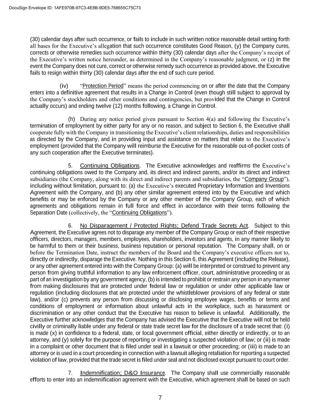 7 (30) calendar days after such occurrence, or fails to include in such written notice reasonable detail setting forth all bases for the Executive’s allegation that such occurrence constitutes Good Reason, (y) the Company cures, corrects or otherwise remedies such occurrence within thirty (30) calendar days after the Company’s receipt of the Executive’s written notice hereunder, as determined in the Company’s reasonable judgment, or (z) in the event the Company does not cure, correct or otherwise remedy such occurrence as provided above, the Executive fails to resign within thirty (30) calendar days after the end of such cure period. (iv) “Protection Period” means the period commencing on or after the date that the Company enters into a definitive agreement that results in a Change in Control (even though still subject to approval by the Company’s stockholders and other conditions and contingencies, but provided that the Change in Control actually occurs) and ending twelve (12) months following, a Change in Control. (h) During any notice period given pursuant to Section 4(a) and following the Executive’s termination of employment by either party for any or no reason, and subject to Section 6, the Executive shall cooperate fully with the Company in transitioning the Executive’s client relationships, duties and responsibilities as directed by the Company, and in providing input and assistance on matters that relate to the Executive’s employment (provided that the Company will reimburse the Executive for the reasonable out-of-pocket costs of any such cooperation after the Executive terminates). 5. Continuing Obligations. The Executive acknowledges and reaffirms the Executive’s continuing obligations owed to the Company and, its direct and indirect parents, and/or its direct and indirect subsidiaries (the Company, along with its direct and indirect parents and subsidiaries, the “Company Group”), including without limitation, pursuant to: (a) the Executive’s executed Proprietary Information and Inventions Agreement with the Company, and (b) any other similar agreement entered into by the Executive and which benefits or may be enforced by the Company or any other member of the Company Group, each of which agreements and obligations remain in full force and effect in accordance with their terms following the Separation Date (collectively, the “Continuing Obligations”). 6. No Disparagement / Protected Rights; Defend Trade Secrets Act. Subject to this Agreement, the Executive agrees not to disparage any member of the Company Group or each of their respective officers, directors, managers, members, employees, shareholders, investors and agents, in any manner likely to be harmful to them or their business, business reputation or personal reputation. The Company shall, on or before the Termination Date, instruct the members of the Board and the Company’s executive officers not to, directly or indirectly, disparage the Executive. Nothing in this Section 6, this Agreement (including the Release), or any other agreement entered into with the Company Group: (a) will be interpreted or construed to prevent any person from giving truthful information to any law enforcement officer, court, administrative proceeding or as part of an investigation by any government agency, (b) is intended to prohibit or restrain any person in any manner from making disclosures that are protected under federal law or regulation or under other applicable law or regulation (including disclosures that are protected under the whistleblower provisions of any federal or state law), and/or (c) prevents any person from discussing or disclosing employee wages, benefits or terms and conditions of employment or information about unlawful acts in the workplace, such as harassment or discrimination or any other conduct that the Executive has reason to believe is unlawful. Additionally, the Executive further acknowledges that the Company has advised the Executive that the Executive will not be held civilly or criminally liable under any federal or state trade secret law for the disclosure of a trade secret that: (i) is made (x) in confidence to a federal, state, or local government official, either directly or indirectly, or to an attorney, and (y) solely for the purpose of reporting or investigating a suspected violation of law; or (ii) is made in a complaint or other document that is filed under seal in a lawsuit or other proceeding; or (iii) is made to an attorney or is used in a court proceeding in connection with a lawsuit alleging retaliation for reporting a suspected violation of law, provided that the trade secret is filed under seal and not disclosed except pursuant to court order. 7. Indemnification; D&O Insurance. The Company shall use commercially reasonable efforts to enter into an indemnification agreement with the Executive, which agreement shall be based on such DocuSign Envelope ID: 30433199-F39C-4410-84F6-189535485E6B1AFE970B-97 3-4E8B-9DE5-768655C75C73
