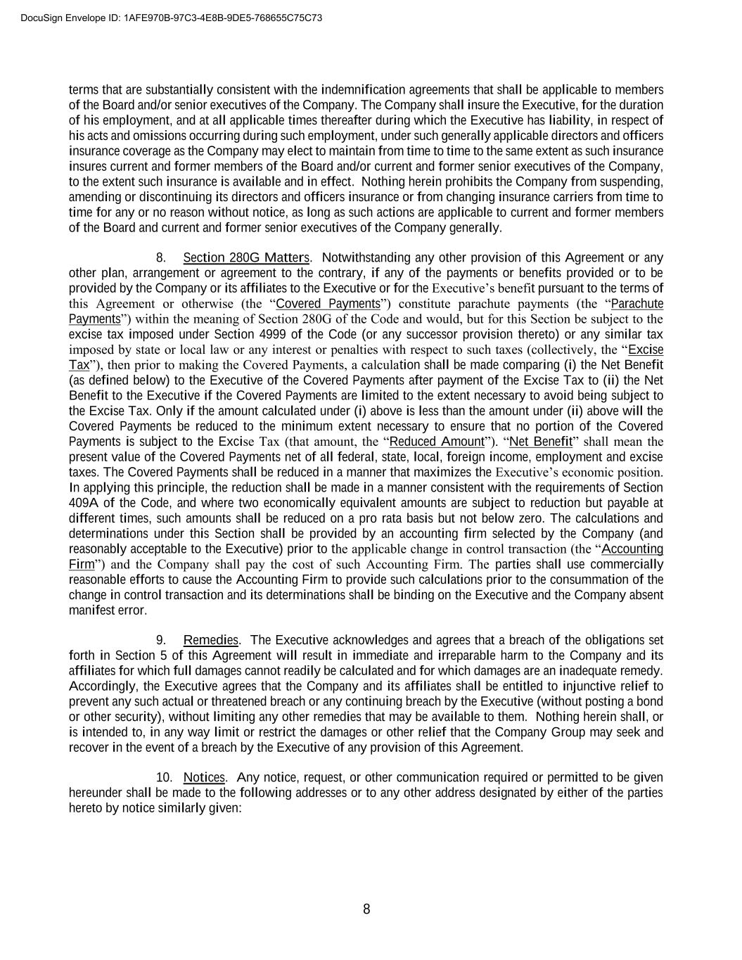 8 terms that are substantially consistent with the indemnification agreements that shall be applicable to members of the Board and/or senior executives of the Company. The Company shall insure the Executive, for the duration of his employment, and at all applicable times thereafter during which the Executive has liability, in respect of his acts and omissions occurring during such employment, under such generally applicable directors and officers insurance coverage as the Company may elect to maintain from time to time to the same extent as such insurance insures current and former members of the Board and/or current and former senior executives of the Company, to the extent such insurance is available and in effect. Nothing herein prohibits the Company from suspending, amending or discontinuing its directors and officers insurance or from changing insurance carriers from time to time for any or no reason without notice, as long as such actions are applicable to current and former members of the Board and current and former senior executives of the Company generally. 8. Section 280G Matters. Notwithstanding any other provision of this Agreement or any other plan, arrangement or agreement to the contrary, if any of the payments or benefits provided or to be provided by the Company or its affiliates to the Executive or for the Executive’s benefit pursuant to the terms of this Agreement or otherwise (the “Covered Payments”) constitute parachute payments (the “Parachute Payments”) within the meaning of Section 280G of the Code and would, but for this Section be subject to the excise tax imposed under Section 4999 of the Code (or any successor provision thereto) or any similar tax imposed by state or local law or any interest or penalties with respect to such taxes (collectively, the “Excise Tax”), then prior to making the Covered Payments, a calculation shall be made comparing (i) the Net Benefit (as defined below) to the Executive of the Covered Payments after payment of the Excise Tax to (ii) the Net Benefit to the Executive if the Covered Payments are limited to the extent necessary to avoid being subject to the Excise Tax. Only if the amount calculated under (i) above is less than the amount under (ii) above will the Covered Payments be reduced to the minimum extent necessary to ensure that no portion of the Covered Payments is subject to the Excise Tax (that amount, the “Reduced Amount”). “Net Benefit” shall mean the present value of the Covered Payments net of all federal, state, local, foreign income, employment and excise taxes. The Covered Payments shall be reduced in a manner that maximizes the Executive’s economic position. In applying this principle, the reduction shall be made in a manner consistent with the requirements of Section 409A of the Code, and where two economically equivalent amounts are subject to reduction but payable at different times, such amounts shall be reduced on a pro rata basis but not below zero. The calculations and determinations under this Section shall be provided by an accounting firm selected by the Company (and reasonably acceptable to the Executive) prior to the applicable change in control transaction (the “Accounting Firm”) and the Company shall pay the cost of such Accounting Firm. The parties shall use commercially reasonable efforts to cause the Accounting Firm to provide such calculations prior to the consummation of the change in control transaction and its determinations shall be binding on the Executive and the Company absent manifest error. 9. Remedies. The Executive acknowledges and agrees that a breach of the obligations set forth in Section 5 of this Agreement will result in immediate and irreparable harm to the Company and its affiliates for which full damages cannot readily be calculated and for which damages are an inadequate remedy. Accordingly, the Executive agrees that the Company and its affiliates shall be entitled to injunctive relief to prevent any such actual or threatened breach or any continuing breach by the Executive (without posting a bond or other security), without limiting any other remedies that may be available to them. Nothing herein shall, or is intended to, in any way limit or restrict the damages or other relief that the Company Group may seek and recover in the event of a breach by the Executive of any provision of this Agreement. 10. Notices. Any notice, request, or other communication required or permitted to be given hereunder shall be made to the following addresses or to any other address designated by either of the parties hereto by notice similarly given: DocuSign Envelope ID: 30433199-F39C-4410-84F6-189535485E6B1AFE970B-97 3-4E8B-9DE5-768655C75C73