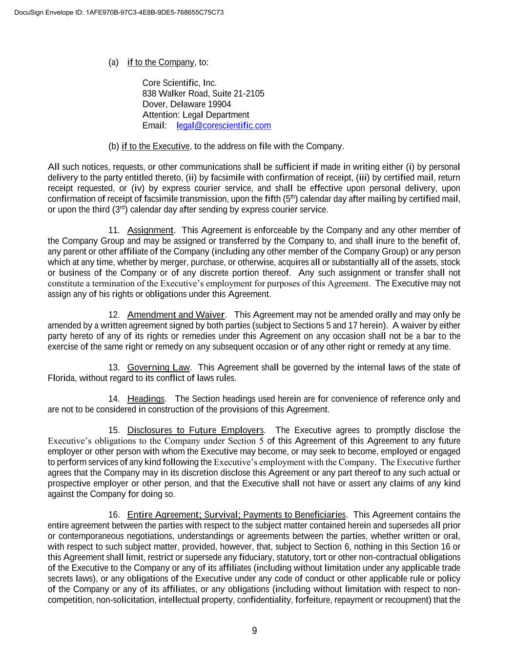 9 (a) if to the Company, to: Core Scientific, Inc. 838 Walker Road, Suite 21-2105 Dover, Delaware 19904 Attention: Legal Department Email: legal@corescientific.com (b) if to the Executive, to the address on file with the Company. All such notices, requests, or other communications shall be sufficient if made in writing either (i) by personal delivery to the party entitled thereto, (ii) by facsimile with confirmation of receipt, (iii) by certified mail, return receipt requested, or (iv) by express courier service, and shall be effective upon personal delivery, upon confirmation of receipt of facsimile transmission, upon the fifth (5th) calendar day after mailing by certified mail, or upon the third (3rd) calendar day after sending by express courier service. 11. Assignment. This Agreement is enforceable by the Company and any other member of the Company Group and may be assigned or transferred by the Company to, and shall inure to the benefit of, any parent or other affiliate of the Company (including any other member of the Company Group) or any person which at any time, whether by merger, purchase, or otherwise, acquires all or substantially all of the assets, stock or business of the Company or of any discrete portion thereof. Any such assignment or transfer shall not constitute a termination of the Executive’s employment for purposes of this Agreement. The Executive may not assign any of his rights or obligations under this Agreement. 12. Amendment and Waiver. This Agreement may not be amended orally and may only be amended by a written agreement signed by both parties (subject to Sections 5 and 17 herein). A waiver by either party hereto of any of its rights or remedies under this Agreement on any occasion shall not be a bar to the exercise of the same right or remedy on any subsequent occasion or of any other right or remedy at any time. 13. Governing Law. This Agreement shall be governed by the internal laws of the state of Florida, without regard to its conflict of laws rules. 14. Headings. The Section headings used herein are for convenience of reference only and are not to be considered in construction of the provisions of this Agreement. 15. Disclosures to Future Employers. The Executive agrees to promptly disclose the Executive’s obligations to the Company under Section 5 of this Agreement of this Agreement to any future employer or other person with whom the Executive may become, or may seek to become, employed or engaged to perform services of any kind following the Executive’s employment with the Company. The Executive further agrees that the Company may in its discretion disclose this Agreement or any part thereof to any such actual or prospective employer or other person, and that the Executive shall not have or assert any claims of any kind against the Company for doing so. 16. Entire Agreement; Survival; Payments to Beneficiaries. This Agreement contains the entire agreement between the parties with respect to the subject matter contained herein and supersedes all prior or contemporaneous negotiations, understandings or agreements between the parties, whether written or oral, with respect to such subject matter, provided, however, that, subject to Section 6, nothing in this Section 16 or this Agreement shall limit, restrict or supersede any fiduciary, statutory, tort or other non-contractual obligations of the Executive to the Company or any of its affiliates (including without limitation under any applicable trade secrets laws), or any obligations of the Executive under any code of conduct or other applicable rule or policy of the Company or any of its affiliates, or any obligations (including without limitation with respect to non- competition, non-solicitation, intellectual property, confidentiality, forfeiture, repayment or recoupment) that the DocuSign Envelope ID: 30433199-F39C-4410-84F6-189535485E6B1AFE970B-97 3-4E8B-9DE5-768655C75C73