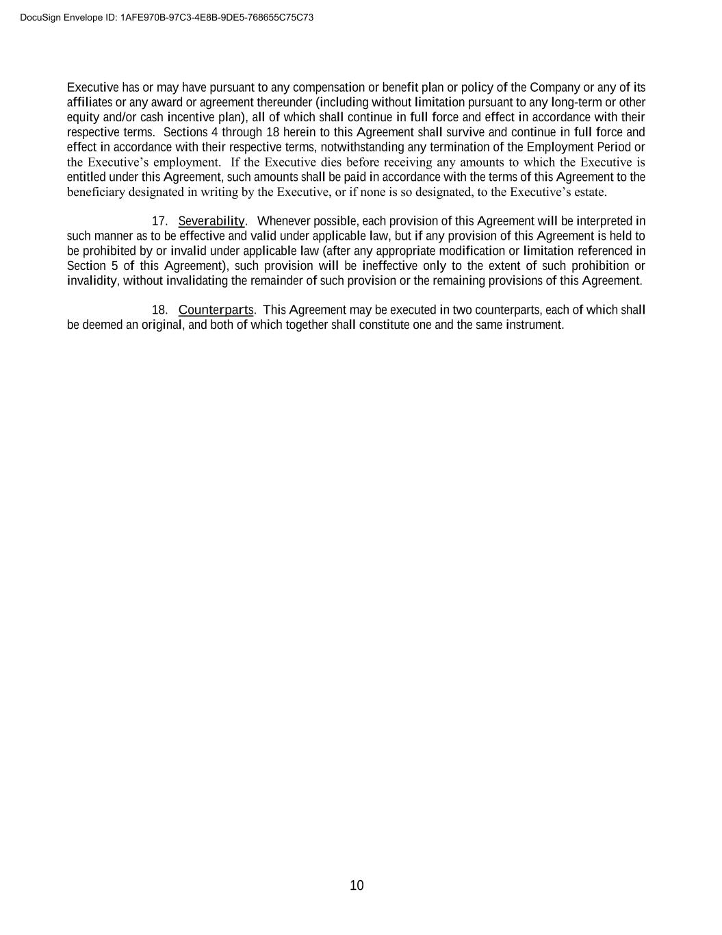 10 Executive has or may have pursuant to any compensation or benefit plan or policy of the Company or any of its affiliates or any award or agreement thereunder (including without limitation pursuant to any long-term or other equity and/or cash incentive plan), all of which shall continue in full force and effect in accordance with their respective terms. Sections 4 through 18 herein to this Agreement shall survive and continue in full force and effect in accordance with their respective terms, notwithstanding any termination of the Employment Period or the Executive’s employment. If the Executive dies before receiving any amounts to which the Executive is entitled under this Agreement, such amounts shall be paid in accordance with the terms of this Agreement to the beneficiary designated in writing by the Executive, or if none is so designated, to the Executive’s estate. 17. Severability. Whenever possible, each provision of this Agreement will be interpreted in such manner as to be effective and valid under applicable law, but if any provision of this Agreement is held to be prohibited by or invalid under applicable law (after any appropriate modification or limitation referenced in Section 5 of this Agreement), such provision will be ineffective only to the extent of such prohibition or invalidity, without invalidating the remainder of such provision or the remaining provisions of this Agreement. 18. Counterparts. This Agreement may be executed in two counterparts, each of which shall be deemed an original, and both of which together shall constitute one and the same instrument. DocuSign Envelope ID: 30433199-F39C-4410-84F6-189535485E6B1AFE970B-97 3-4E8B-9DE5-768655C75C73