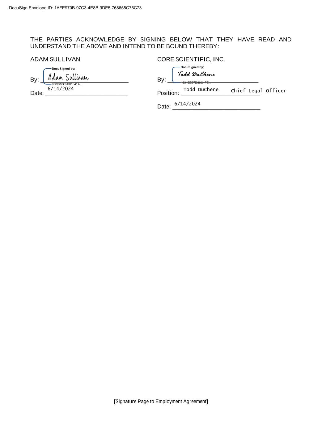 [Signature Page to Employment Agreement] THE PARTIES ACKNOWLEDGE BY SIGNING BELOW THAT THEY HAVE READ AND UNDERSTAND THE ABOVE AND INTEND TO BE BOUND THEREBY: ADAM SULLIVAN CORE SCIENTIFIC, INC. By: ______________________________ By: _______________________________ Date: ____________________________ Position: ___________________________ Date: ______________________________ DocuSign Envelope ID: 30433199-F39C-4410-84F6-189535485E6B1AFE970B-97 3-4E8B-9DE5-768655C75C73 6/14/2024 6/14/2024 Chief Legal OfficerTodd DuChene