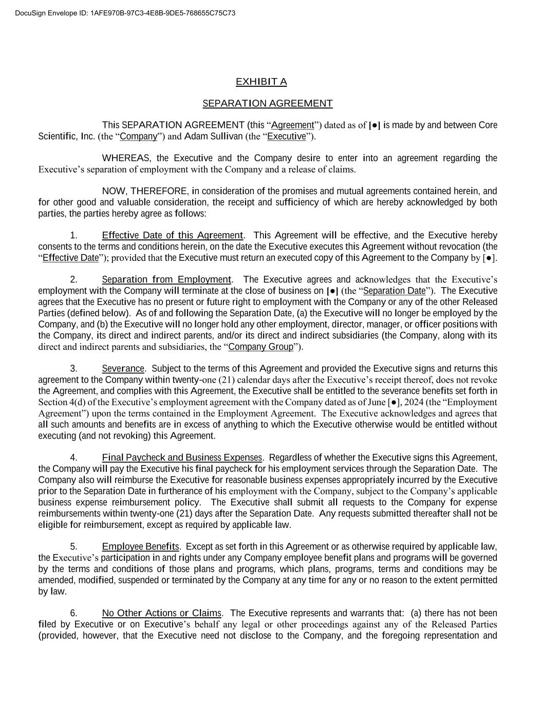 EXHIBIT A SEPARATION AGREEMENT This SEPARATION AGREEMENT (this “Agreement”) dated as of [●] is made by and between Core Scientific, Inc. (the “Company”) and Adam Sullivan (the “Executive”). WHEREAS, the Executive and the Company desire to enter into an agreement regarding the Executive’s separation of employment with the Company and a release of claims. NOW, THEREFORE, in consideration of the promises and mutual agreements contained herein, and for other good and valuable consideration, the receipt and sufficiency of which are hereby acknowledged by both parties, the parties hereby agree as follows: 1. Effective Date of this Agreement. This Agreement will be effective, and the Executive hereby consents to the terms and conditions herein, on the date the Executive executes this Agreement without revocation (the “Effective Date”); provided that the Executive must return an executed copy of this Agreement to the Company by [●]. 2. Separation from Employment. The Executive agrees and acknowledges that the Executive’s employment with the Company will terminate at the close of business on [●] (the “Separation Date”). The Executive agrees that the Executive has no present or future right to employment with the Company or any of the other Released Parties (defined below). As of and following the Separation Date, (a) the Executive will no longer be employed by the Company, and (b) the Executive will no longer hold any other employment, director, manager, or officer positions with the Company, its direct and indirect parents, and/or its direct and indirect subsidiaries (the Company, along with its direct and indirect parents and subsidiaries, the “Company Group”). 3. Severance. Subject to the terms of this Agreement and provided the Executive signs and returns this agreement to the Company within twenty-one (21) calendar days after the Executive’s receipt thereof, does not revoke the Agreement, and complies with this Agreement, the Executive shall be entitled to the severance benefits set forth in Section 4(d) of the Executive’s employment agreement with the Company dated as of June [●], 2024 (the “Employment Agreement”) upon the terms contained in the Employment Agreement. The Executive acknowledges and agrees that all such amounts and benefits are in excess of anything to which the Executive otherwise would be entitled without executing (and not revoking) this Agreement. 4. Final Paycheck and Business Expenses. Regardless of whether the Executive signs this Agreement, the Company will pay the Executive his final paycheck for his employment services through the Separation Date. The Company also will reimburse the Executive for reasonable business expenses appropriately incurred by the Executive prior to the Separation Date in furtherance of his employment with the Company, subject to the Company’s applicable business expense reimbursement policy. The Executive shall submit all requests to the Company for expense reimbursements within twenty-one (21) days after the Separation Date. Any requests submitted thereafter shall not be eligible for reimbursement, except as required by applicable law. 5. Employee Benefits. Except as set forth in this Agreement or as otherwise required by applicable law, the Executive’s participation in and rights under any Company employee benefit plans and programs will be governed by the terms and conditions of those plans and programs, which plans, programs, terms and conditions may be amended, modified, suspended or terminated by the Company at any time for any or no reason to the extent permitted by law. 6. No Other Actions or Claims. The Executive represents and warrants that: (a) there has not been filed by Executive or on Executive’s behalf any legal or other proceedings against any of the Released Parties (provided, however, that the Executive need not disclose to the Company, and the foregoing representation and DocuSign Envelope ID: 30433199-F39C-4410-84F6-189535485E6B1AFE970B-97 3-4E8B-9DE5-768655C75C73