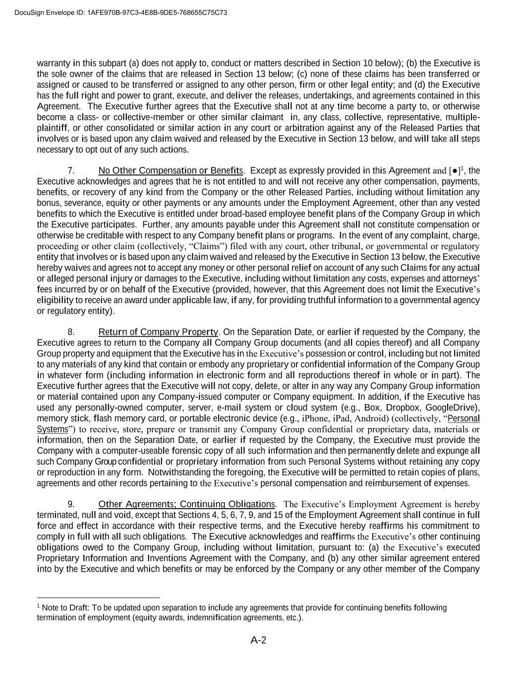 A-2 warranty in this subpart (a) does not apply to, conduct or matters described in Section 10 below); (b) the Executive is the sole owner of the claims that are released in Section 13 below; (c) none of these claims has been transferred or assigned or caused to be transferred or assigned to any other person, firm or other legal entity; and (d) the Executive has the full right and power to grant, execute, and deliver the releases, undertakings, and agreements contained in this Agreement. The Executive further agrees that the Executive shall not at any time become a party to, or otherwise become a class- or collective-member or other similar claimant in, any class, collective, representative, multiple- plaintiff, or other consolidated or similar action in any court or arbitration against any of the Released Parties that involves or is based upon any claim waived and released by the Executive in Section 13 below, and will take all steps necessary to opt out of any such actions. 7. No Other Compensation or Benefits. Except as expressly provided in this Agreement and [●]1, the Executive acknowledges and agrees that he is not entitled to and will not receive any other compensation, payments, benefits, or recovery of any kind from the Company or the other Released Parties, including without limitation any bonus, severance, equity or other payments or any amounts under the Employment Agreement, other than any vested benefits to which the Executive is entitled under broad-based employee benefit plans of the Company Group in which the Executive participates. Further, any amounts payable under this Agreement shall not constitute compensation or otherwise be creditable with respect to any Company benefit plans or programs. In the event of any complaint, charge, proceeding or other claim (collectively, “Claims”) filed with any court, other tribunal, or governmental or regulatory entity that involves or is based upon any claim waived and released by the Executive in Section 13 below, the Executive hereby waives and agrees not to accept any money or other personal relief on account of any such Claims for any actual or alleged personal injury or damages to the Executive, including without limitation any costs, expenses and attorneys’ fees incurred by or on behalf of the Executive (provided, however, that this Agreement does not limit the Executive’s eligibility to receive an award under applicable law, if any, for providing truthful information to a governmental agency or regulatory entity). 8. Return of Company Property. On the Separation Date, or earlier if requested by the Company, the Executive agrees to return to the Company all Company Group documents (and all copies thereof) and all Company Group property and equipment that the Executive has in the Executive’s possession or control, including but not limited to any materials of any kind that contain or embody any proprietary or confidential information of the Company Group in whatever form (including information in electronic form and all reproductions thereof in whole or in part). The Executive further agrees that the Executive will not copy, delete, or alter in any way any Company Group information or material contained upon any Company-issued computer or Company equipment. In addition, if the Executive has used any personally-owned computer, server, e-mail system or cloud system (e.g., Box, Dropbox, GoogleDrive), memory stick, flash memory card, or portable electronic device (e.g., iPhone, iPad, Android) (collectively, “Personal Systems”) to receive, store, prepare or transmit any Company Group confidential or proprietary data, materials or information, then on the Separation Date, or earlier if requested by the Company, the Executive must provide the Company with a computer-useable forensic copy of all such information and then permanently delete and expunge all such Company Group confidential or proprietary information from such Personal Systems without retaining any copy or reproduction in any form. Notwithstanding the foregoing, the Executive will be permitted to retain copies of plans, agreements and other records pertaining to the Executive’s personal compensation and reimbursement of expenses. 9. Other Agreements; Continuing Obligations. The Executive’s Employment Agreement is hereby terminated, null and void, except that Sections 4, 5, 6, 7, 9, and 15 of the Employment Agreement shall continue in full force and effect in accordance with their respective terms, and the Executive hereby reaffirms his commitment to comply in full with all such obligations. The Executive acknowledges and reaffirms the Executive’s other continuing obligations owed to the Company Group, including without limitation, pursuant to: (a) the Executive’s executed Proprietary Information and Inventions Agreement with the Company, and (b) any other similar agreement entered into by the Executive and which benefits or may be enforced by the Company or any other member of the Company 1 Note to Draft: To be updated upon separation to include any agreements that provide for continuing benefits following termination of employment (equity awards, indemnification agreements, etc.). DocuSign Envelope ID: 30433199-F39C-4410-84F6-189535485E6B1AFE970B-97 3-4E8B-9DE5-768655C75C73