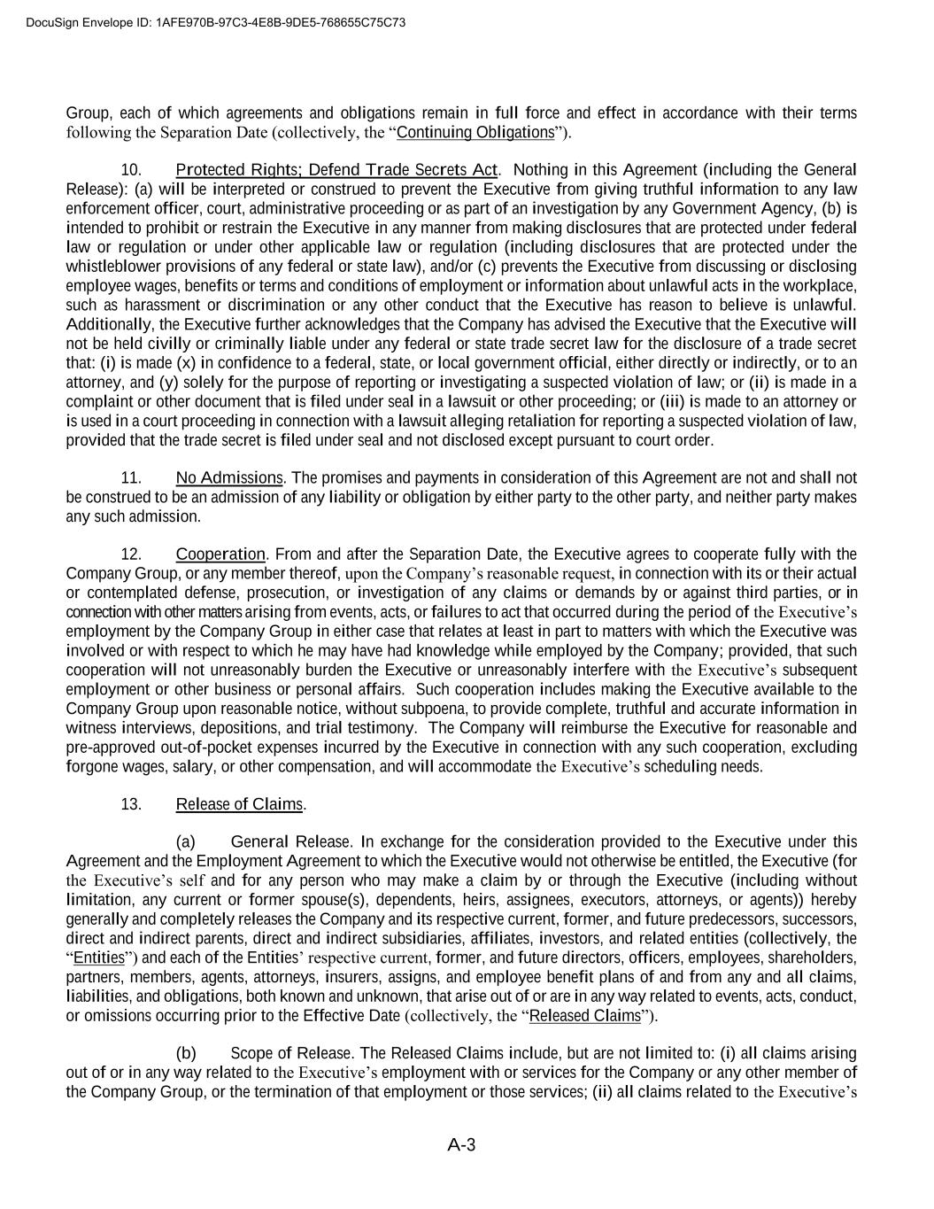 A-3 Group, each of which agreements and obligations remain in full force and effect in accordance with their terms following the Separation Date (collectively, the “Continuing Obligations”). 10. Protected Rights; Defend Trade Secrets Act. Nothing in this Agreement (including the General Release): (a) will be interpreted or construed to prevent the Executive from giving truthful information to any law enforcement officer, court, administrative proceeding or as part of an investigation by any Government Agency, (b) is intended to prohibit or restrain the Executive in any manner from making disclosures that are protected under federal law or regulation or under other applicable law or regulation (including disclosures that are protected under the whistleblower provisions of any federal or state law), and/or (c) prevents the Executive from discussing or disclosing employee wages, benefits or terms and conditions of employment or information about unlawful acts in the workplace, such as harassment or discrimination or any other conduct that the Executive has reason to believe is unlawful. Additionally, the Executive further acknowledges that the Company has advised the Executive that the Executive will not be held civilly or criminally liable under any federal or state trade secret law for the disclosure of a trade secret that: (i) is made (x) in confidence to a federal, state, or local government official, either directly or indirectly, or to an attorney, and (y) solely for the purpose of reporting or investigating a suspected violation of law; or (ii) is made in a complaint or other document that is filed under seal in a lawsuit or other proceeding; or (iii) is made to an attorney or is used in a court proceeding in connection with a lawsuit alleging retaliation for reporting a suspected violation of law, provided that the trade secret is filed under seal and not disclosed except pursuant to court order. 11. No Admissions. The promises and payments in consideration of this Agreement are not and shall not be construed to be an admission of any liability or obligation by either party to the other party, and neither party makes any such admission. 12. Cooperation. From and after the Separation Date, the Executive agrees to cooperate fully with the Company Group, or any member thereof, upon the Company’s reasonable request, in connection with its or their actual or contemplated defense, prosecution, or investigation of any claims or demands by or against third parties, or in connection with other matters arising from events, acts, or failures to act that occurred during the period of the Executive’s employment by the Company Group in either case that relates at least in part to matters with which the Executive was involved or with respect to which he may have had knowledge while employed by the Company; provided, that such cooperation will not unreasonably burden the Executive or unreasonably interfere with the Executive’s subsequent employment or other business or personal affairs. Such cooperation includes making the Executive available to the Company Group upon reasonable notice, without subpoena, to provide complete, truthful and accurate information in witness interviews, depositions, and trial testimony. The Company will reimburse the Executive for reasonable and pre-approved out-of-pocket expenses incurred by the Executive in connection with any such cooperation, excluding forgone wages, salary, or other compensation, and will accommodate the Executive’s scheduling needs. 13. Release of Claims. (a) General Release. In exchange for the consideration provided to the Executive under this Agreement and the Employment Agreement to which the Executive would not otherwise be entitled, the Executive (for the Executive’s self and for any person who may make a claim by or through the Executive (including without limitation, any current or former spouse(s), dependents, heirs, assignees, executors, attorneys, or agents)) hereby generally and completely releases the Company and its respective current, former, and future predecessors, successors, direct and indirect parents, direct and indirect subsidiaries, affiliates, investors, and related entities (collectively, the “Entities”) and each of the Entities’ respective current, former, and future directors, officers, employees, shareholders, partners, members, agents, attorneys, insurers, assigns, and employee benefit plans of and from any and all claims, liabilities, and obligations, both known and unknown, that arise out of or are in any way related to events, acts, conduct, or omissions occurring prior to the Effective Date (collectively, the “Released Claims”). (b) Scope of Release. The Released Claims include, but are not limited to: (i) all claims arising out of or in any way related to the Executive’s employment with or services for the Company or any other member of the Company Group, or the termination of that employment or those services; (ii) all claims related to the Executive’s DocuSign Envelope ID: 30433199-F39C-4410-84F6-189535485E6B1AFE970B-97 3-4E8B-9DE5-768655C75C73