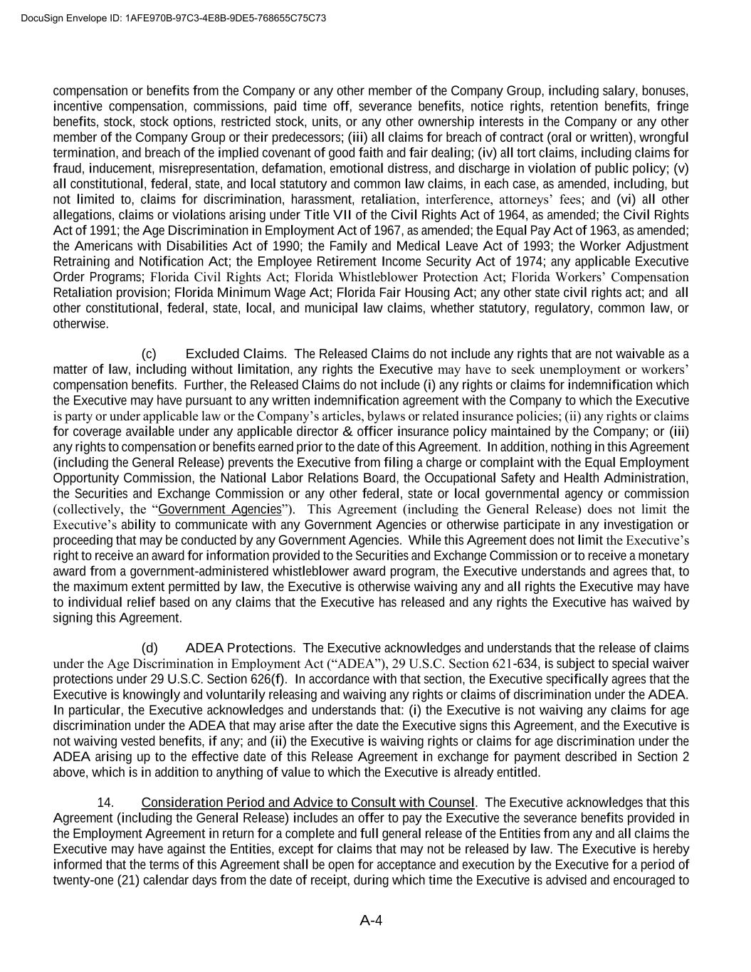 A-4 compensation or benefits from the Company or any other member of the Company Group, including salary, bonuses, incentive compensation, commissions, paid time off, severance benefits, notice rights, retention benefits, fringe benefits, stock, stock options, restricted stock, units, or any other ownership interests in the Company or any other member of the Company Group or their predecessors; (iii) all claims for breach of contract (oral or written), wrongful termination, and breach of the implied covenant of good faith and fair dealing; (iv) all tort claims, including claims for fraud, inducement, misrepresentation, defamation, emotional distress, and discharge in violation of public policy; (v) all constitutional, federal, state, and local statutory and common law claims, in each case, as amended, including, but not limited to, claims for discrimination, harassment, retaliation, interference, attorneys’ fees; and (vi) all other allegations, claims or violations arising under Title VII of the Civil Rights Act of 1964, as amended; the Civil Rights Act of 1991; the Age Discrimination in Employment Act of 1967, as amended; the Equal Pay Act of 1963, as amended; the Americans with Disabilities Act of 1990; the Family and Medical Leave Act of 1993; the Worker Adjustment Retraining and Notification Act; the Employee Retirement Income Security Act of 1974; any applicable Executive Order Programs; Florida Civil Rights Act; Florida Whistleblower Protection Act; Florida Workers’ Compensation Retaliation provision; Florida Minimum Wage Act; Florida Fair Housing Act; any other state civil rights act; and all other constitutional, federal, state, local, and municipal law claims, whether statutory, regulatory, common law, or otherwise. (c) Excluded Claims. The Released Claims do not include any rights that are not waivable as a matter of law, including without limitation, any rights the Executive may have to seek unemployment or workers’ compensation benefits. Further, the Released Claims do not include (i) any rights or claims for indemnification which the Executive may have pursuant to any written indemnification agreement with the Company to which the Executive is party or under applicable law or the Company’s articles, bylaws or related insurance policies; (ii) any rights or claims for coverage available under any applicable director & officer insurance policy maintained by the Company; or (iii) any rights to compensation or benefits earned prior to the date of this Agreement. In addition, nothing in this Agreement (including the General Release) prevents the Executive from filing a charge or complaint with the Equal Employment Opportunity Commission, the National Labor Relations Board, the Occupational Safety and Health Administration, the Securities and Exchange Commission or any other federal, state or local governmental agency or commission (collectively, the “Government Agencies”). This Agreement (including the General Release) does not limit the Executive’s ability to communicate with any Government Agencies or otherwise participate in any investigation or proceeding that may be conducted by any Government Agencies. While this Agreement does not limit the Executive’s right to receive an award for information provided to the Securities and Exchange Commission or to receive a monetary award from a government-administered whistleblower award program, the Executive understands and agrees that, to the maximum extent permitted by law, the Executive is otherwise waiving any and all rights the Executive may have to individual relief based on any claims that the Executive has released and any rights the Executive has waived by signing this Agreement. (d) ADEA Protections. The Executive acknowledges and understands that the release of claims under the Age Discrimination in Employment Act (“ADEA”), 29 U.S.C. Section 621-634, is subject to special waiver protections under 29 U.S.C. Section 626(f). In accordance with that section, the Executive specifically agrees that the Executive is knowingly and voluntarily releasing and waiving any rights or claims of discrimination under the ADEA. In particular, the Executive acknowledges and understands that: (i) the Executive is not waiving any claims for age discrimination under the ADEA that may arise after the date the Executive signs this Agreement, and the Executive is not waiving vested benefits, if any; and (ii) the Executive is waiving rights or claims for age discrimination under the ADEA arising up to the effective date of this Release Agreement in exchange for payment described in Section 2 above, which is in addition to anything of value to which the Executive is already entitled. 14. Consideration Period and Advice to Consult with Counsel. The Executive acknowledges that this Agreement (including the General Release) includes an offer to pay the Executive the severance benefits provided in the Employment Agreement in return for a complete and full general release of the Entities from any and all claims the Executive may have against the Entities, except for claims that may not be released by law. The Executive is hereby informed that the terms of this Agreement shall be open for acceptance and execution by the Executive for a period of twenty-one (21) calendar days from the date of receipt, during which time the Executive is advised and encouraged to DocuSign Envelope ID: 30433199-F39C-4410-84F6-189535485E6B1AFE970B-97 3-4E8B-9DE5-768655C75C73