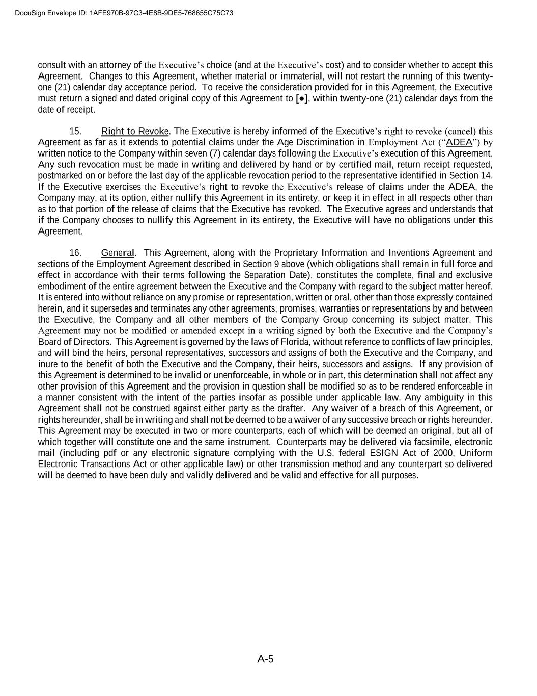 A-5 consult with an attorney of the Executive’s choice (and at the Executive’s cost) and to consider whether to accept this Agreement. Changes to this Agreement, whether material or immaterial, will not restart the running of this twenty- one (21) calendar day acceptance period. To receive the consideration provided for in this Agreement, the Executive must return a signed and dated original copy of this Agreement to [●], within twenty-one (21) calendar days from the date of receipt. 15. Right to Revoke. The Executive is hereby informed of the Executive’s right to revoke (cancel) this Agreement as far as it extends to potential claims under the Age Discrimination in Employment Act (“ADEA”) by written notice to the Company within seven (7) calendar days following the Executive’s execution of this Agreement. Any such revocation must be made in writing and delivered by hand or by certified mail, return receipt requested, postmarked on or before the last day of the applicable revocation period to the representative identified in Section 14. If the Executive exercises the Executive’s right to revoke the Executive’s release of claims under the ADEA, the Company may, at its option, either nullify this Agreement in its entirety, or keep it in effect in all respects other than as to that portion of the release of claims that the Executive has revoked. The Executive agrees and understands that if the Company chooses to nullify this Agreement in its entirety, the Executive will have no obligations under this Agreement. 16. General. This Agreement, along with the Proprietary Information and Inventions Agreement and sections of the Employment Agreement described in Section 9 above (which obligations shall remain in full force and effect in accordance with their terms following the Separation Date), constitutes the complete, final and exclusive embodiment of the entire agreement between the Executive and the Company with regard to the subject matter hereof. It is entered into without reliance on any promise or representation, written or oral, other than those expressly contained herein, and it supersedes and terminates any other agreements, promises, warranties or representations by and between the Executive, the Company and all other members of the Company Group concerning its subject matter. This Agreement may not be modified or amended except in a writing signed by both the Executive and the Company’s Board of Directors. This Agreement is governed by the laws of Florida, without reference to conflicts of law principles, and will bind the heirs, personal representatives, successors and assigns of both the Executive and the Company, and inure to the benefit of both the Executive and the Company, their heirs, successors and assigns. If any provision of this Agreement is determined to be invalid or unenforceable, in whole or in part, this determination shall not affect any other provision of this Agreement and the provision in question shall be modified so as to be rendered enforceable in a manner consistent with the intent of the parties insofar as possible under applicable law. Any ambiguity in this Agreement shall not be construed against either party as the drafter. Any waiver of a breach of this Agreement, or rights hereunder, shall be in writing and shall not be deemed to be a waiver of any successive breach or rights hereunder. This Agreement may be executed in two or more counterparts, each of which will be deemed an original, but all of which together will constitute one and the same instrument. Counterparts may be delivered via facsimile, electronic mail (including pdf or any electronic signature complying with the U.S. federal ESIGN Act of 2000, Uniform Electronic Transactions Act or other applicable law) or other transmission method and any counterpart so delivered will be deemed to have been duly and validly delivered and be valid and effective for all purposes. DocuSign Envelope ID: 30433199-F39C-4410-84F6-189535485E6B1AFE970B-97 3-4E8B-9DE5-768655C75C73