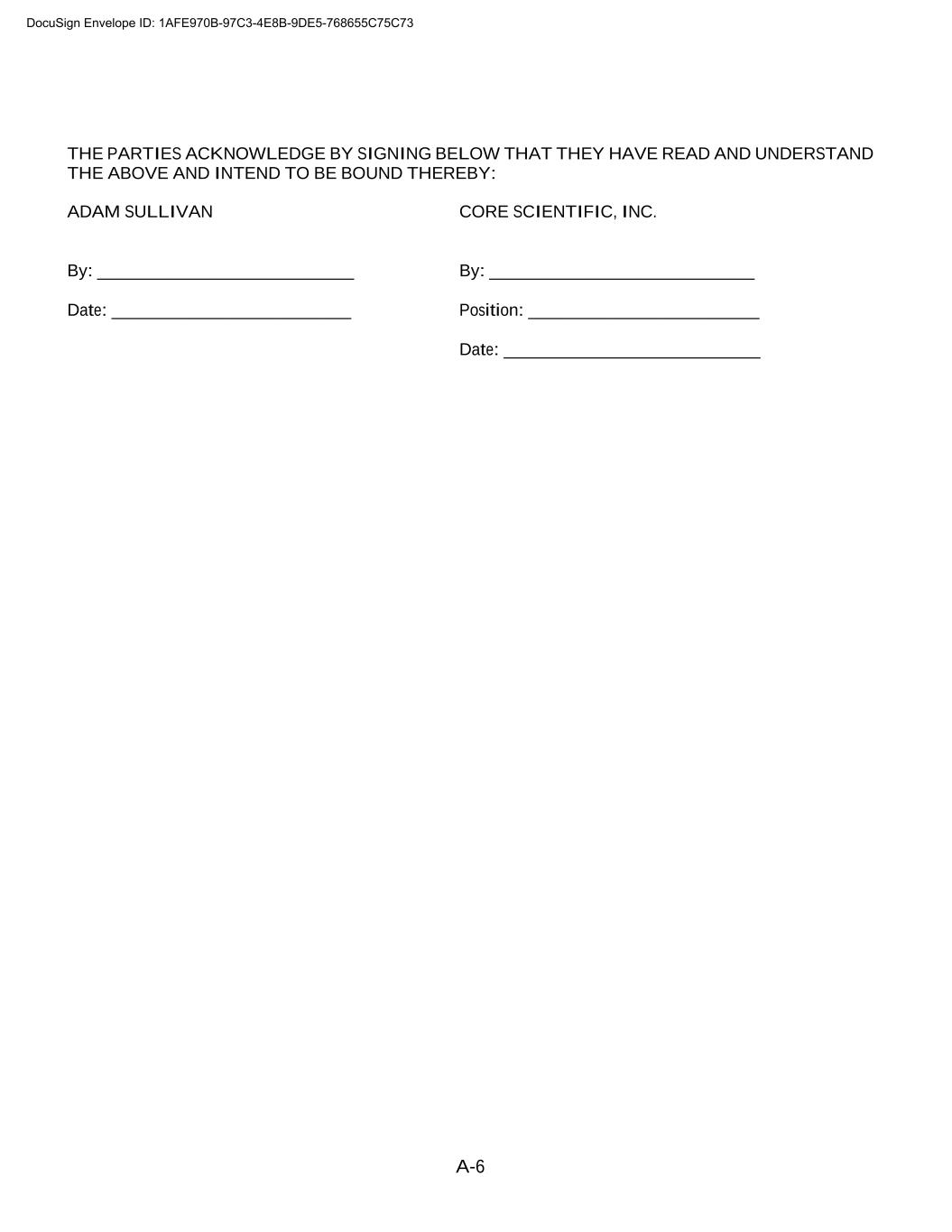 A-6 THE PARTIES ACKNOWLEDGE BY SIGNING BELOW THAT THEY HAVE READ AND UNDERSTAND THE ABOVE AND INTEND TO BE BOUND THEREBY: ADAM SULLIVAN CORE SCIENTIFIC, INC. By: ______________________________ By: _______________________________ Date: ____________________________ Position: ___________________________ Date: ______________________________ DocuSign Envelope ID: 30433199-F39C-4410-84F6-189535485E6B1AFE970B-97 3-4E8B-9DE5-768655C75C73