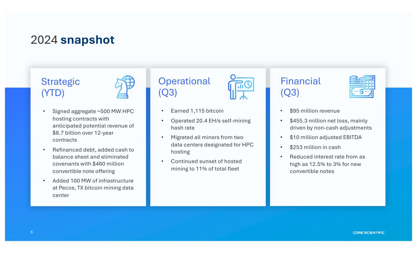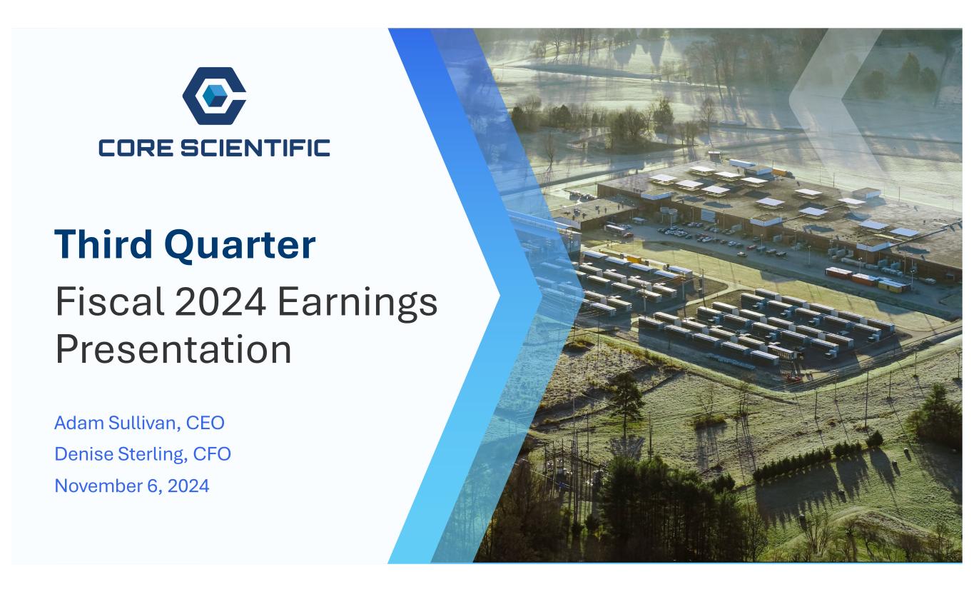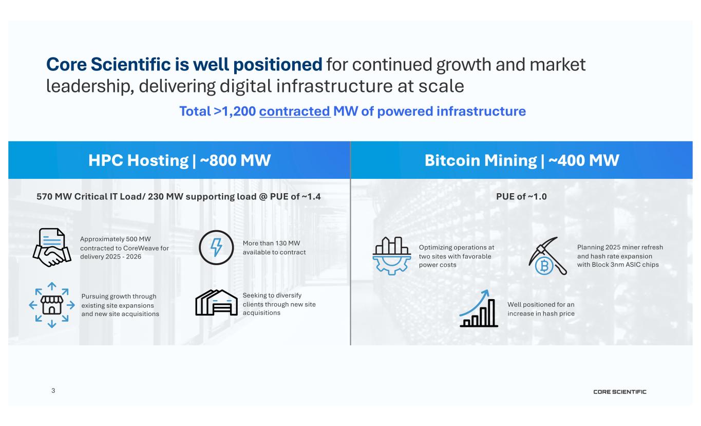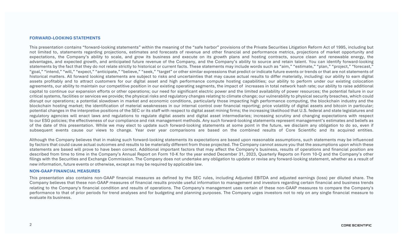 2 FORWARD-LOOKING STATEMENTS This presentation contains “forward-looking statements” within the meaning of the “safe harbor” provisions of the Private Securities Litigation Reform Act of 1995, including but not limited to, statements regarding projections, estimates and forecasts of revenue and other financial and performance metrics, projections of market opportunity and expectations, the Company’s ability to scale, and grow its business and execute on its growth plans and hosting contracts, source clean and renewable energy, the advantages, and expected growth, and anticipated future revenue of the Company, and the Company’s ability to source and retain talent. You can identify forward-looking statements by the fact that they do not relate strictly to historical or current facts. These statements may include words such as “aim,” “estimate,” “plan,” “project,” “forecast,” “goal,” “intend,” “will,” “expect,” “anticipate,” “believe,” “seek,” “target” or other similar expressions that predict or indicate future events or trends or that are not statements of historical matters. All forward looking statements are subject to risks and uncertainties that may cause actual results to differ materially, including: our ability to earn digital assets profitably and to attract customers for our digital asset and high performance compute hosting capabilities; our ability to perform under our existing colocation agreements, our ability to maintain our competitive position in our existing operating segments, the impact of increases in total network hash rate; our ability to raise additional capital to continue our expansion efforts or other operations; our need for significant electric power and the limited availability of power resources; the potential failure in our critical systems, facilities or services we provide; the physical risks and regulatory changes relating to climate change; our vulnerability to physical security breaches, which could disrupt our operations; a potential slowdown in market and economic conditions, particularly those impacting high performance computing, the blockchain industry and the blockchain hosting market; the identification of material weaknesses in our internal control over financial reporting; price volatility of digital assets and bitcoin in particular; potential changes in the interpretive positions of the SEC or its staff with respect to digital asset mining firms; the increasing likelihood that U.S. federal and state legislatures and regulatory agencies will enact laws and regulations to regulate digital assets and digital asset intermediaries; increasing scrutiny and changing expectations with respect to our ESG policies; the effectiveness of our compliance and risk management methods. Any such forward-looking statements represent management’s estimates and beliefs as of the date of this presentation. While we may elect to update such forward-looking statements at some point in the future, we disclaim any obligation to do so, even if subsequent events cause our views to change. Year over year comparisons are based on the combined results of Core Scientific and its acquired entities. Although the Company believes that in making such forward-looking statements its expectations are based upon reasonable assumptions, such statements may be influenced by factors that could cause actual outcomes and results to be materially different from those projected. The Company cannot assure you that the assumptions upon which these statements are based will prove to have been correct. Additional important factors that may affect the Company’s business, results of operations and financial position are described from time to time in the Company’s Annual Report on Form 10-K for the year ended December 31, 2023, Quarterly Reports on Form 10-Q and the Company’s other filings with the Securities and Exchange Commission. The Company does not undertake any obligation to update or revise any forward-looking statement, whether as a result of new information, future events or otherwise, except as may be required by applicable law. NON-GAAP FINANCIAL MEASURES This presentation also contains non-GAAP financial measures as defined by the SEC rules, including Adjusted EBITDA and adjusted earnings (loss) per diluted share. The Company believes that these non-GAAP measures of financial results provide useful information to management and investors regarding certain financial and business trends relating to the Company's financial condition and results of operations. The Company's management uses certain of these non-GAAP measures to compare the Company's performance to that of prior periods for trend analyses and for budgeting and planning purposes. The Company urges investors not to rely on any single financial measure to evaluate its business.
