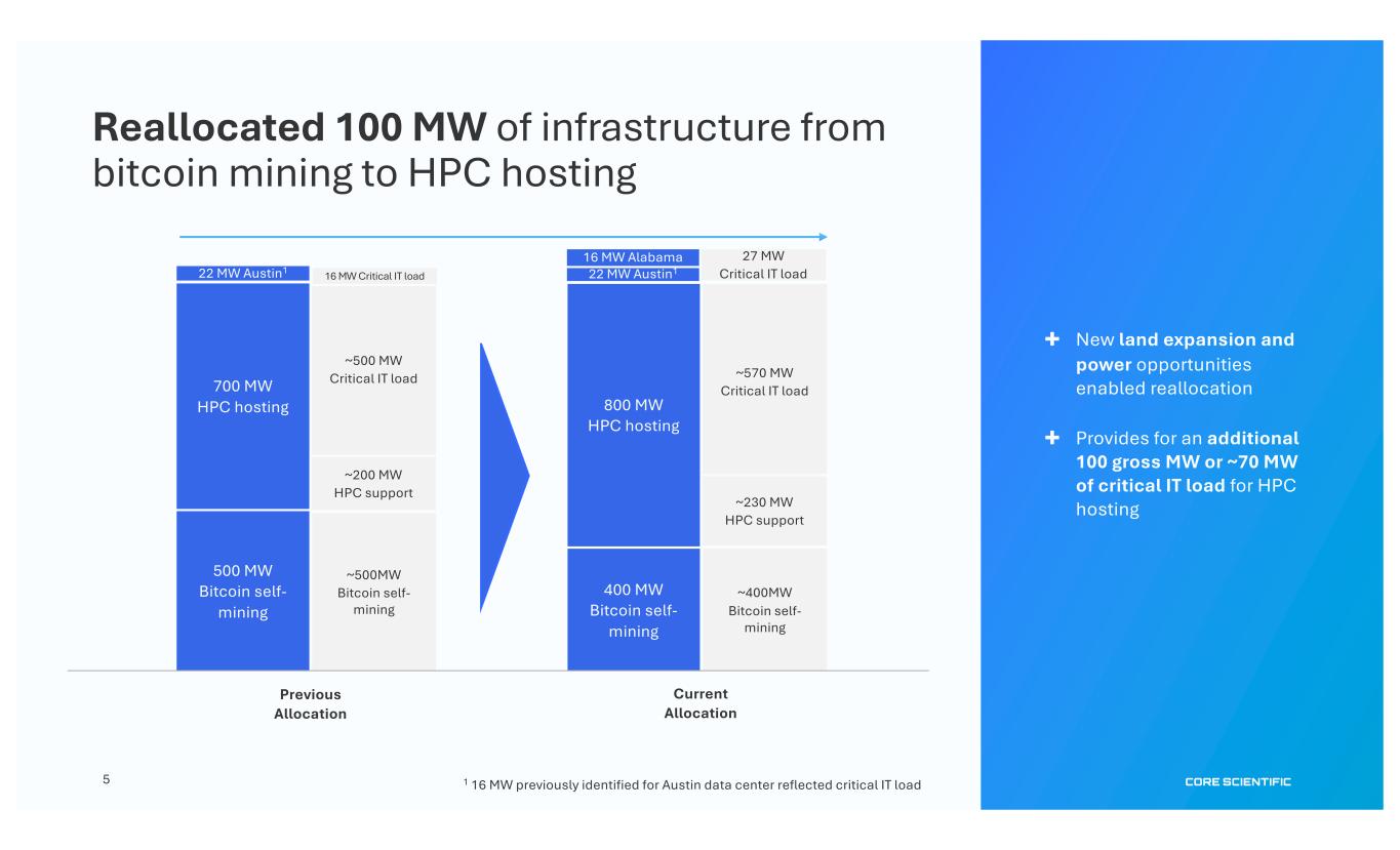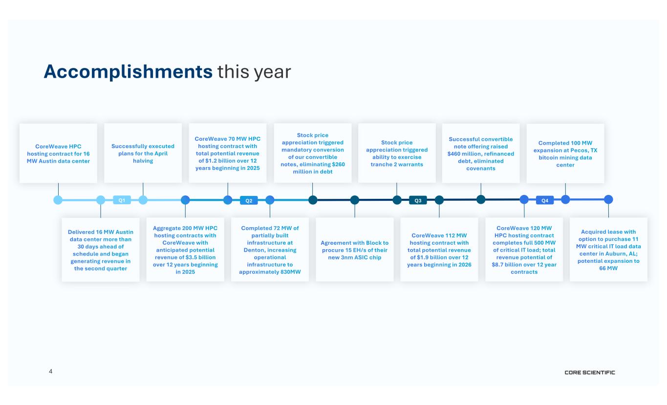 3 Total >1,200 contracted MW of powered infrastructure 570 MW Critical IT Load/ 230 MW supporting load @ PUE of ~1.4 PUE of ~1.0 Core Scientific is well positioned for continued growth and market leadership, delivering digital infrastructure at scale HPC Hosting | ~800 MW Bitcoin Mining | ~400 MW Planning 2025 miner refresh and hash rate expansion with Block 3nm ASIC chips Optimizing operations at two sites with favorable power costs More than 130 MW available to contract Pursuing growth through existing site expansions and new site acquisitions Approximately 500 MW contracted to CoreWeave for delivery 2025 - 2026 Well positioned for an increase in hash price Seeking to diversify clients through new site acquisitions
