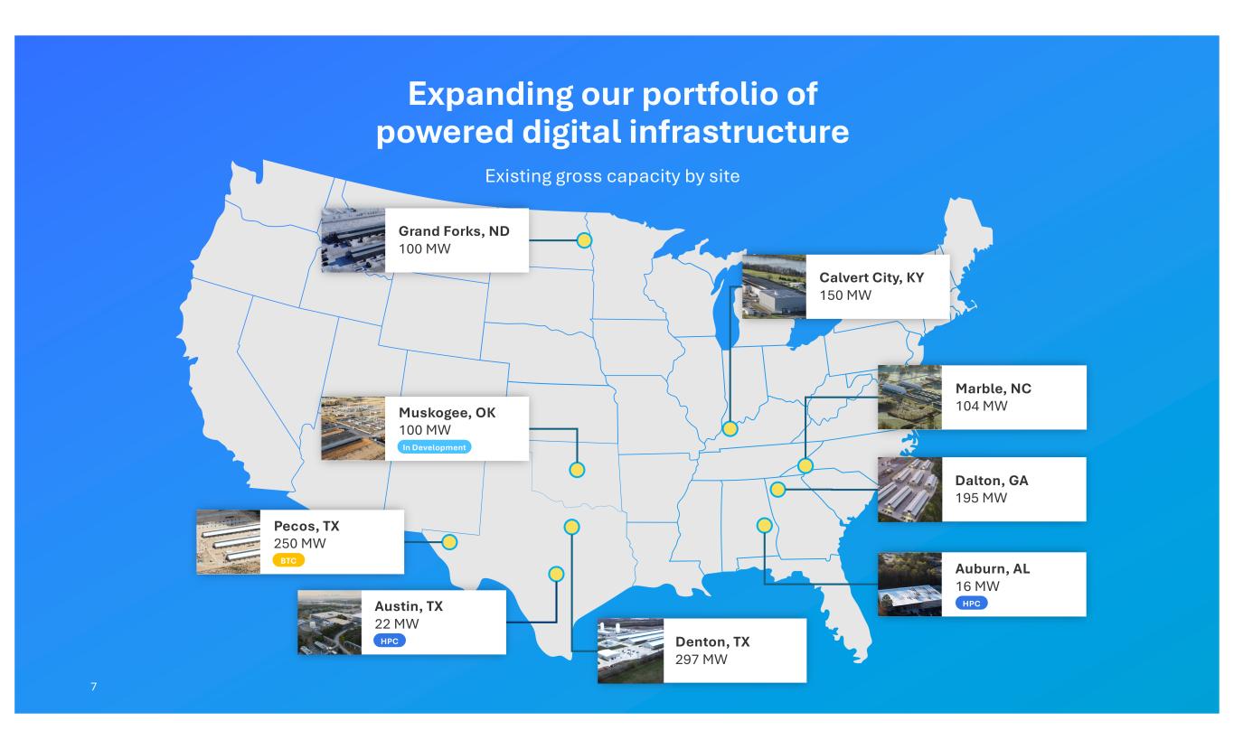 6 2024 snapshot Financial (Q3) • $95 million revenue • $455.3 million net loss, mainly driven by non-cash adjustments • $10 million adjusted EBITDA • $253 million in cash • Reduced interest rate from as high as 12.5% to 3% for new convertible notes Operational (Q3) • Earned 1,115 bitcoin • Operated 20.4 EH/s self-mining hash rate • Migrated all miners from two data centers designated for HPC hosting • Continued sunset of hosted mining to 11% of total fleet • Signed aggregate ~500 MW HPC hosting contracts with anticipated potential revenue of $8.7 billion over 12-year contracts • Refinanced debt, added cash to balance sheet and eliminated covenants with $460 million convertible note offering • Added 100 MW of infrastructure at Pecos, TX bitcoin mining data center Strategic (YTD)