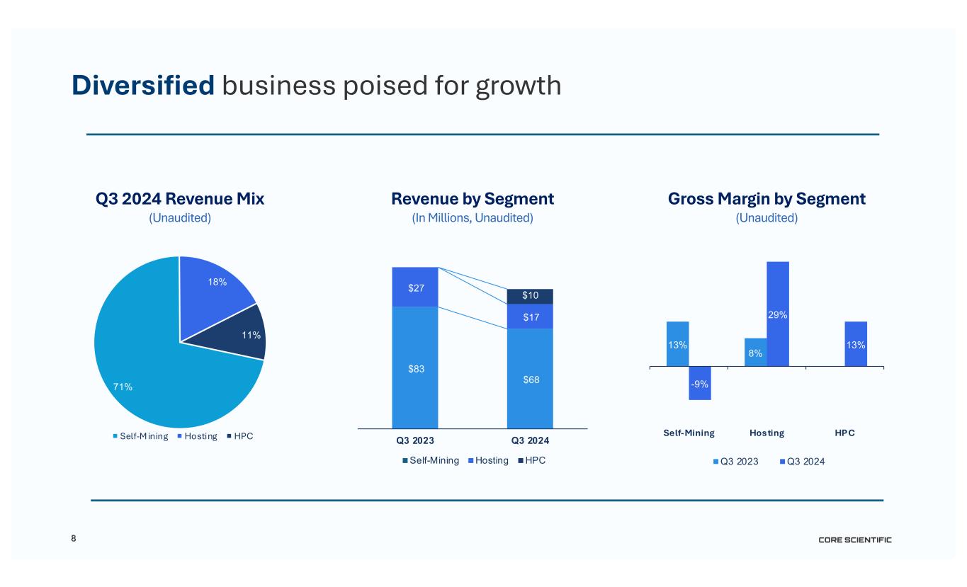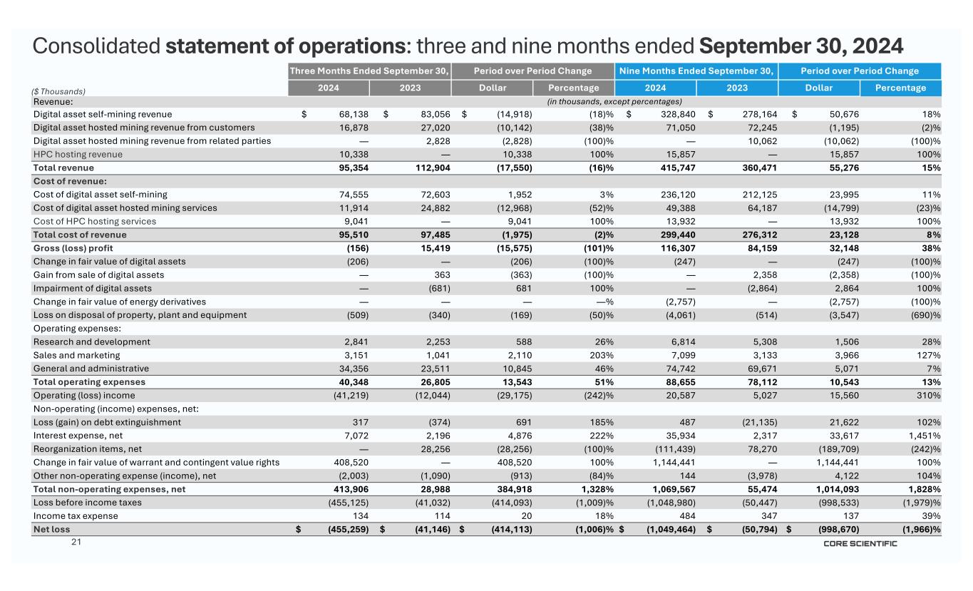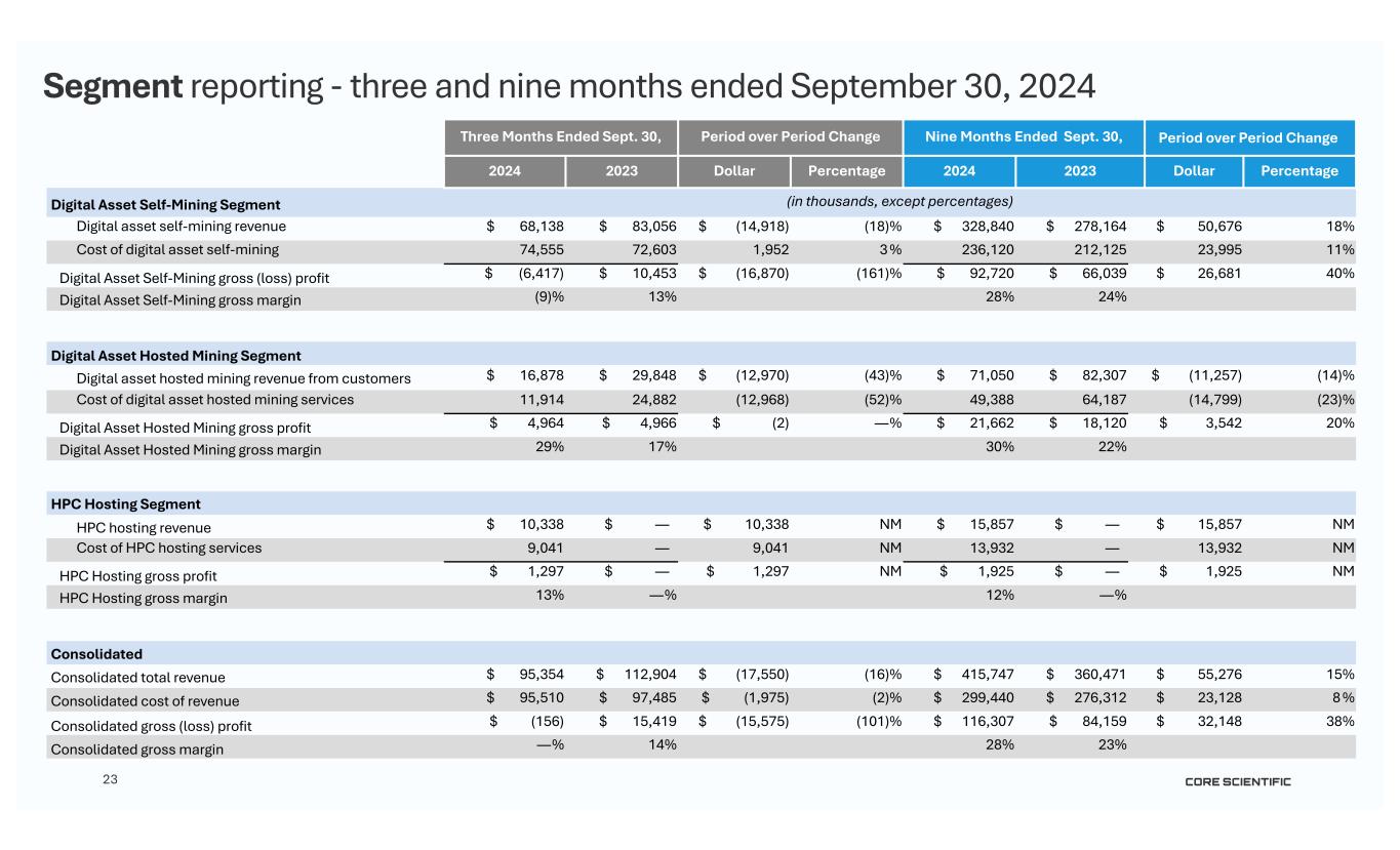 23 Three Months Ended Sept. 30, Period over Period Change Nine Months Ended Sept. 30, Period over Period Change 2024 2023 Dollar Percentage 2024 2023 Dollar Percentage Digital Asset Self-Mining Segment (in thousands, except percentages) Digital asset self-mining revenue $ 68,138 $ 83,056 $ (14,918) (18) % $ 328,840 $ 278,164 $ 50,676 18 % Cost of digital asset self-mining 74,555 72,603 1,952 3 % 236,120 212,125 23,995 11 % Digital Asset Self-Mining gross (loss) profit $ (6,417) $ 10,453 $ (16,870) (161) % $ 92,720 $ 66,039 $ 26,681 40 % Digital Asset Self-Mining gross margin (9) % 13 % 28 % 24 % Digital Asset Hosted Mining Segment Digital asset hosted mining revenue from customers $ 16,878 $ 29,848 $ (12,970) (43) % $ 71,050 $ 82,307 $ (11,257) (14) % Cost of digital asset hosted mining services 11,914 24,882 (12,968) (52) % 49,388 64,187 (14,799) (23) % Digital Asset Hosted Mining gross profit $ 4,964 $ 4,966 $ (2) — % $ 21,662 $ 18,120 $ 3,542 20 % Digital Asset Hosted Mining gross margin 29 % 17 % 30 % 22 % HPC Hosting Segment HPC hosting revenue $ 10,338 $ — $ 10,338 NM $ 15,857 $ — $ 15,857 NM Cost of HPC hosting services 9,041 — 9,041 NM 13,932 — 13,932 NM HPC Hosting gross profit $ 1,297 $ — $ 1,297 NM $ 1,925 $ — $ 1,925 NM HPC Hosting gross margin 13 % — % 12 % — % Consolidated Consolidated total revenue $ 95,354 $ 112,904 $ (17,550) (16) % $ 415,747 $ 360,471 $ 55,276 15 % Consolidated cost of revenue $ 95,510 $ 97,485 $ (1,975) (2) % $ 299,440 $ 276,312 $ 23,128 8 % Consolidated gross (loss) profit $ (156) $ 15,419 $ (15,575) (101) % $ 116,307 $ 84,159 $ 32,148 38 % Consolidated gross margin — % 14 % 28 % 23 % Segment reporting - three and nine months ended September 30, 2024