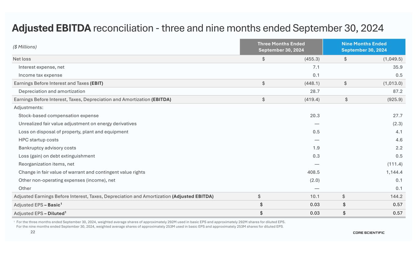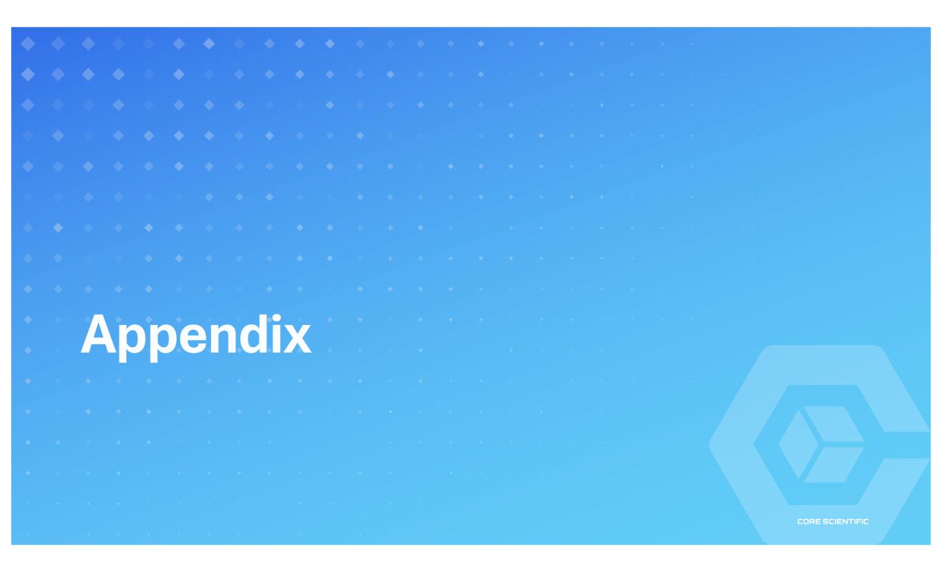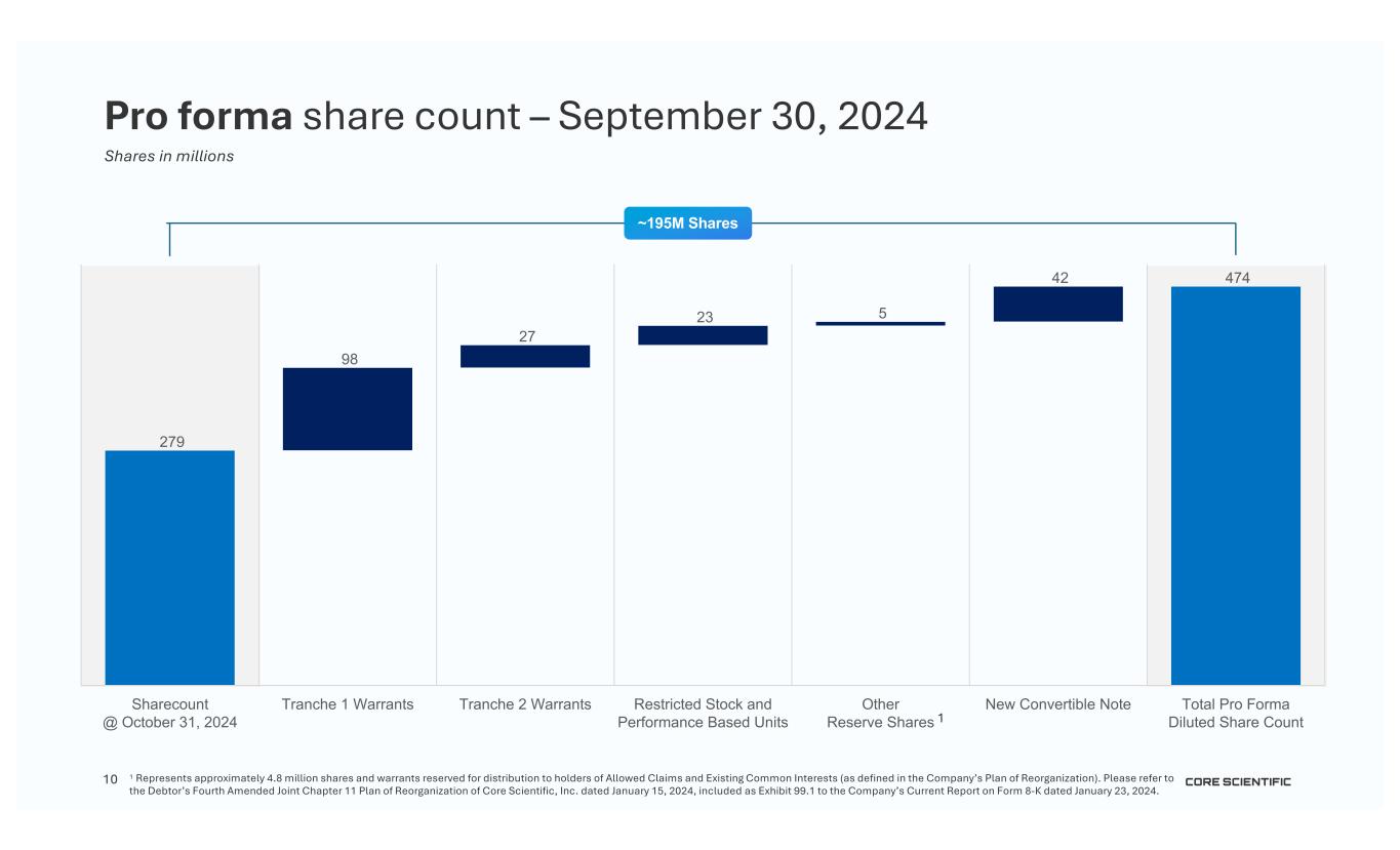 10 279 98 27 23 5 42 474 Sharecount @ October 31, 2024 Tranche 1 Warrants Tranche 2 Warrants Restricted Stock and Performance Based Units Other Reserve Shares New Convertible Note Total Pro Forma Diluted Share Count Pro forma share count – September 30, 2024 Shares in millions ~195M Shares 1 1 Represents approximately 4.8 million shares and warrants reserved for distribution to holders of Allowed Claims and Existing Common Interests (as defined in the Company’s Plan of Reorganization). Please refer to the Debtor’s Fourth Amended Joint Chapter 11 Plan of Reorganization of Core Scientific, Inc. dated January 15, 2024, included as Exhibit 99.1 to the Company’s Current Report on Form 8-K dated January 23, 2024.