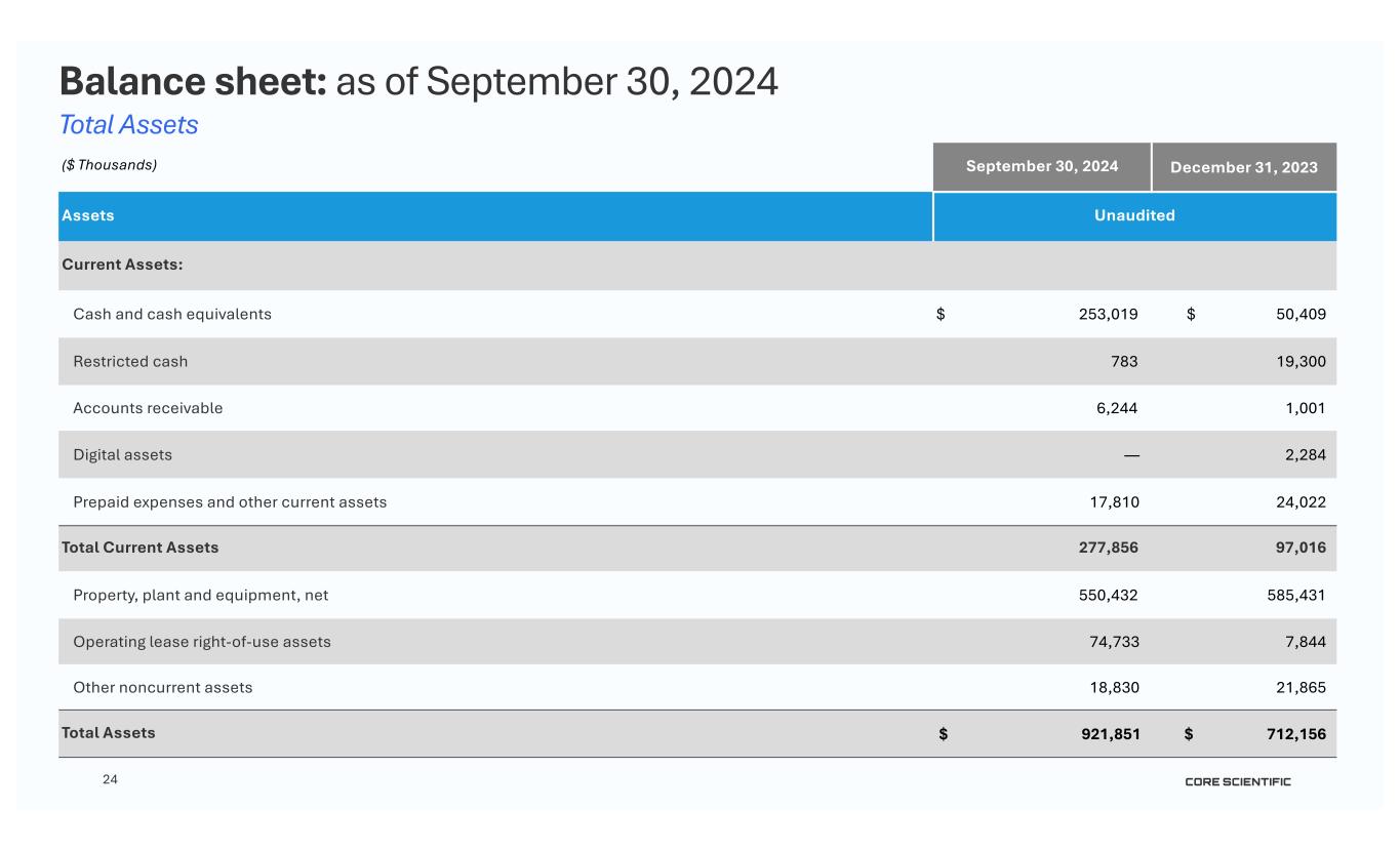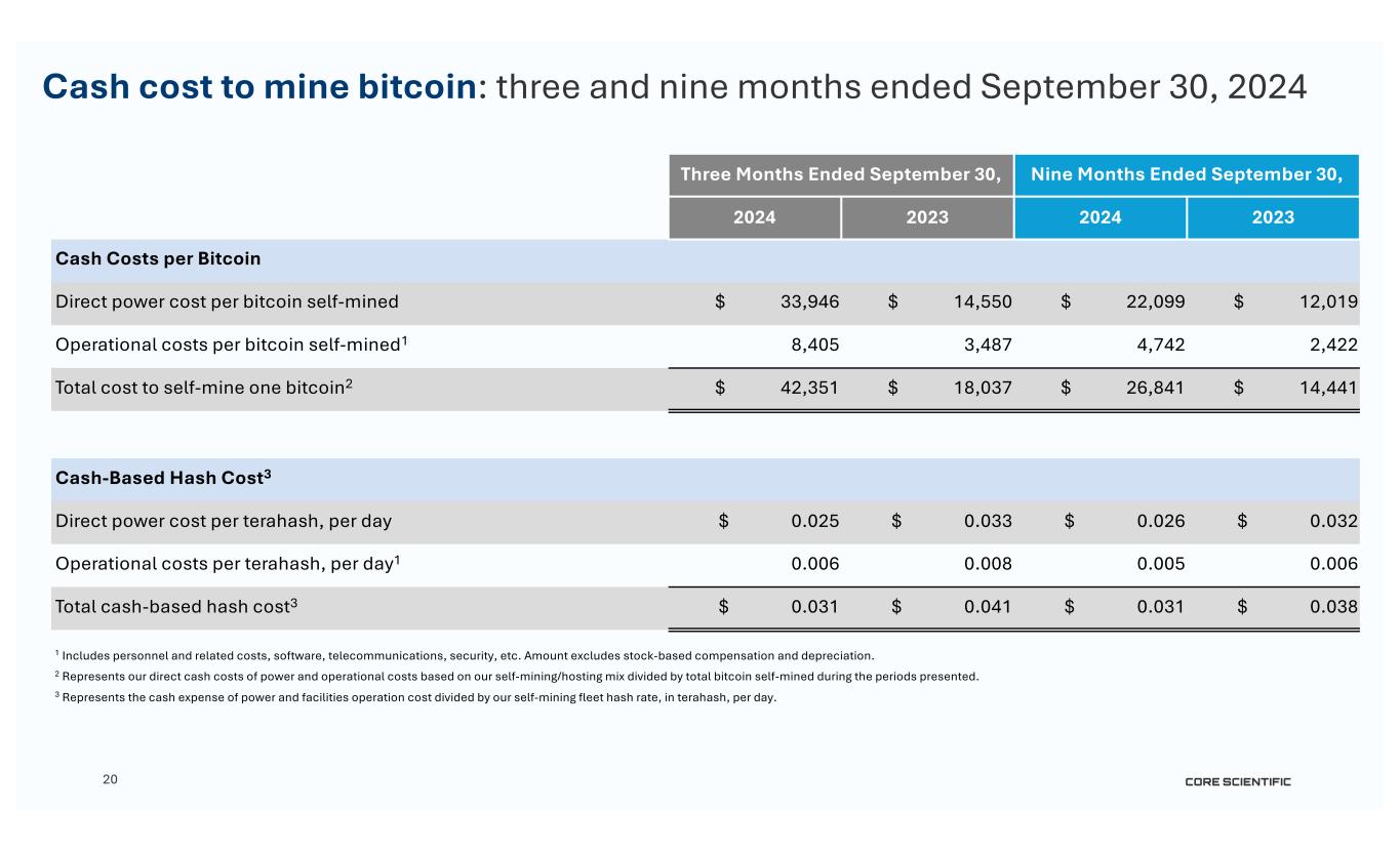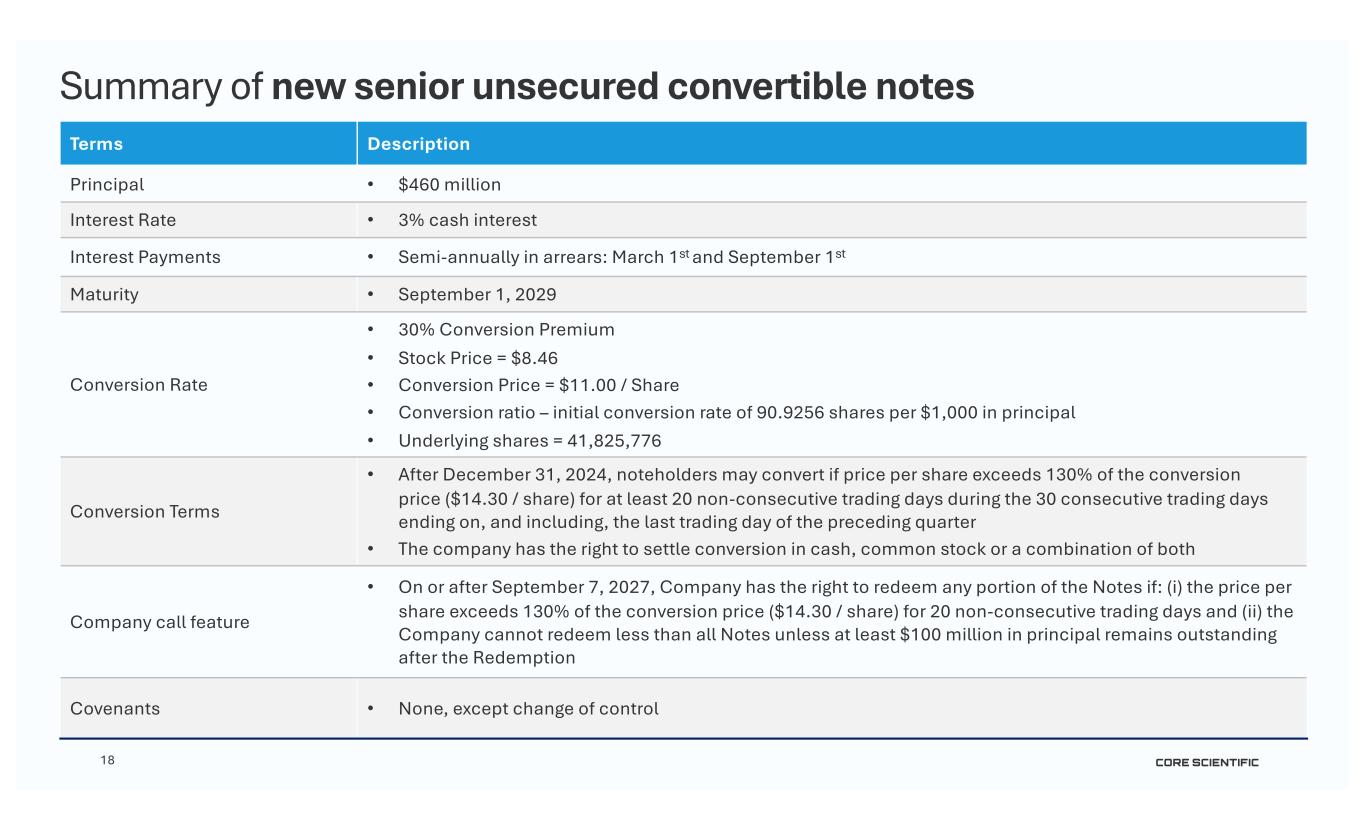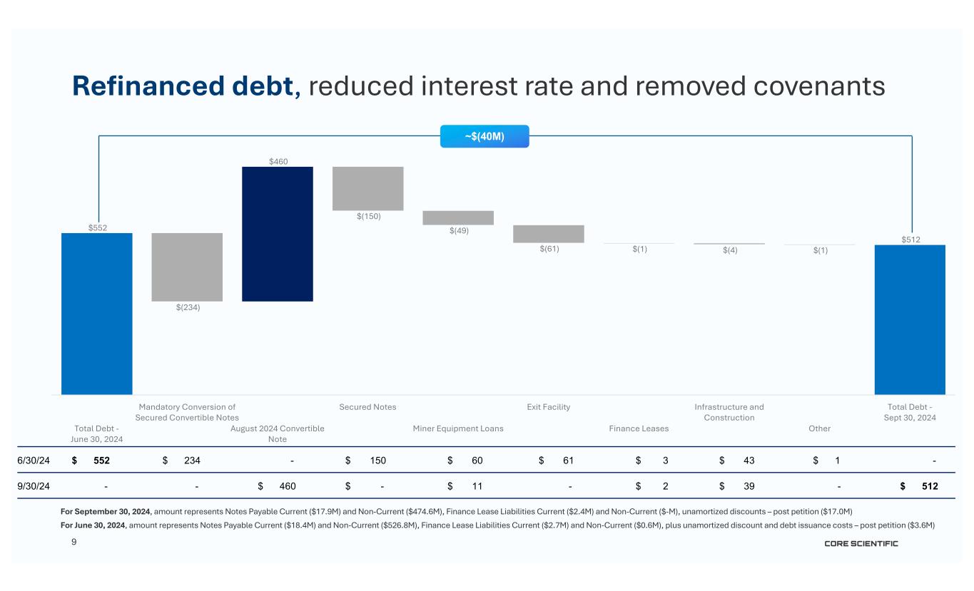 10 279 98 27 23 5 42 474 Sharecount @ October 31, 2024 Tranche 1 Warrants Tranche 2 Warrants Restricted Stock and Performance Based Units Other Reserve Shares New Convertible Note Total Pro Forma Diluted Share Count Pro forma share count – September 30, 2024 Shares in millions ~195M Shares 1 1 Represents approximately 4.8 million shares and warrants reserved for distribution to holders of Allowed Claims and Existing Common Interests (as defined in the Company’s Plan of Reorganization). Please refer to the Debtor’s Fourth Amended Joint Chapter 11 Plan of Reorganization of Core Scientific, Inc. dated January 15, 2024, included as Exhibit 99.1 to the Company’s Current Report on Form 8-K dated January 23, 2024.
