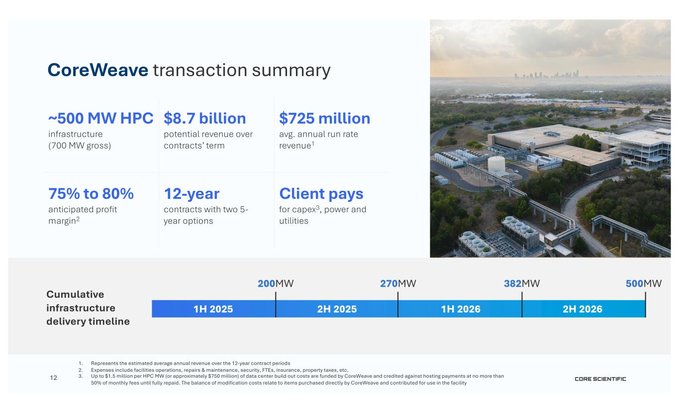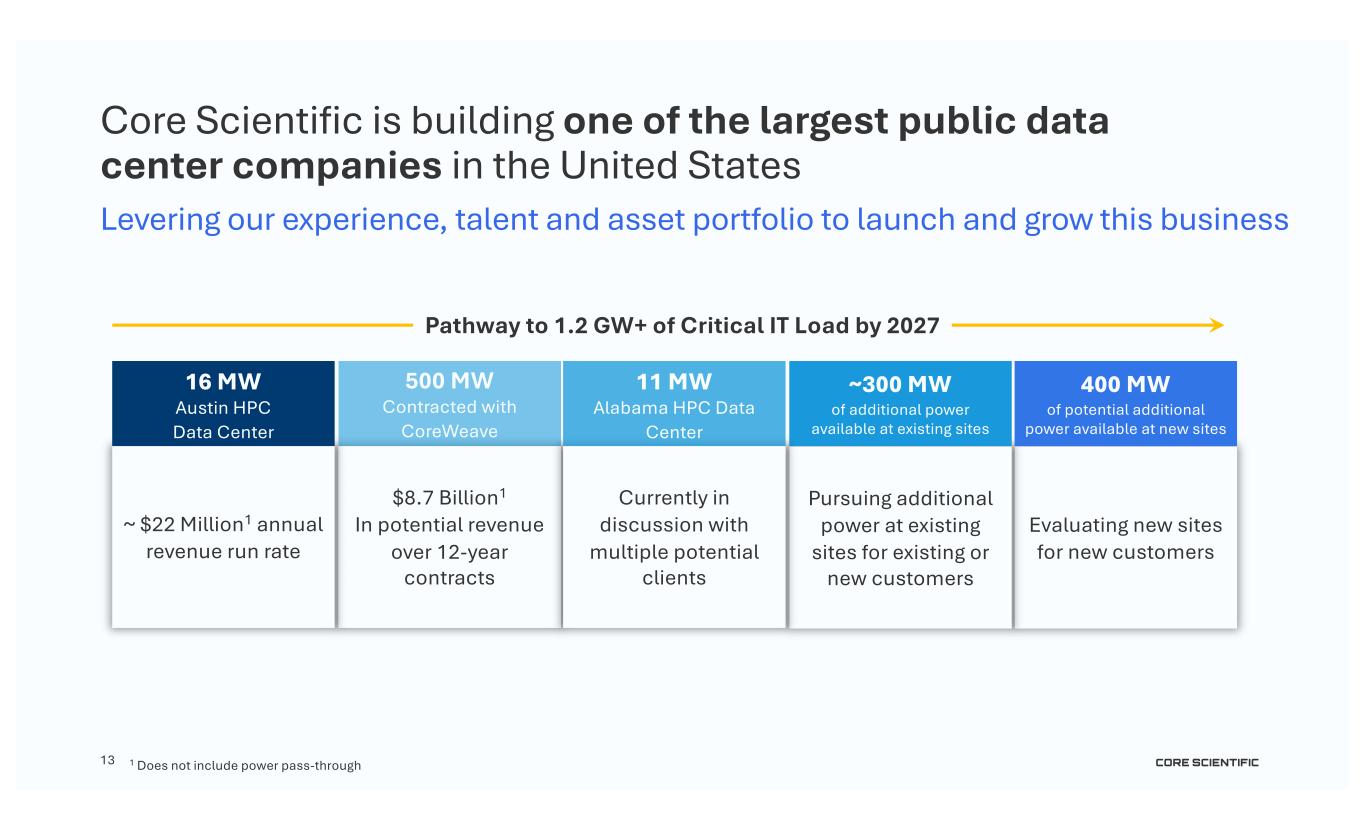 12 CoreWeave transaction summary 1. Represents the estimated average annual revenue over the 12-year contract periods 2. Expenses include facilities operations, repairs & maintenance, security, FTEs, insurance, property taxes, etc. 3. Up to $1.5 million per HPC MW (or approximately $750 million) of data center build out costs are funded by CoreWeave and credited against hosting payments at no more than 50% of monthly fees until fully repaid. The balance of modification costs relate to items purchased directly by CoreWeave and contributed for use in the facility ~500 MW HPC infrastructure (700 MW gross) $8.7 billion potential revenue over contracts’ term $725 million avg. annual run rate revenue1 1H 2025 2H 2025 1H 2026 2H 2026 200MW 270MW 382MW 500MW Cumulative infrastructure delivery timeline 75% to 80% anticipated profit margin2 12-year contracts with two 5- year options Client pays for capex3, power and utilities