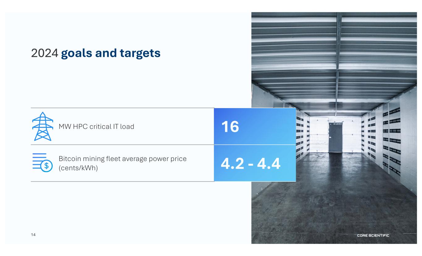 14 2024 goals and targets MW HPC critical IT load 16 Bitcoin mining fleet average power price (cents/kWh) 4.2 - 4.4