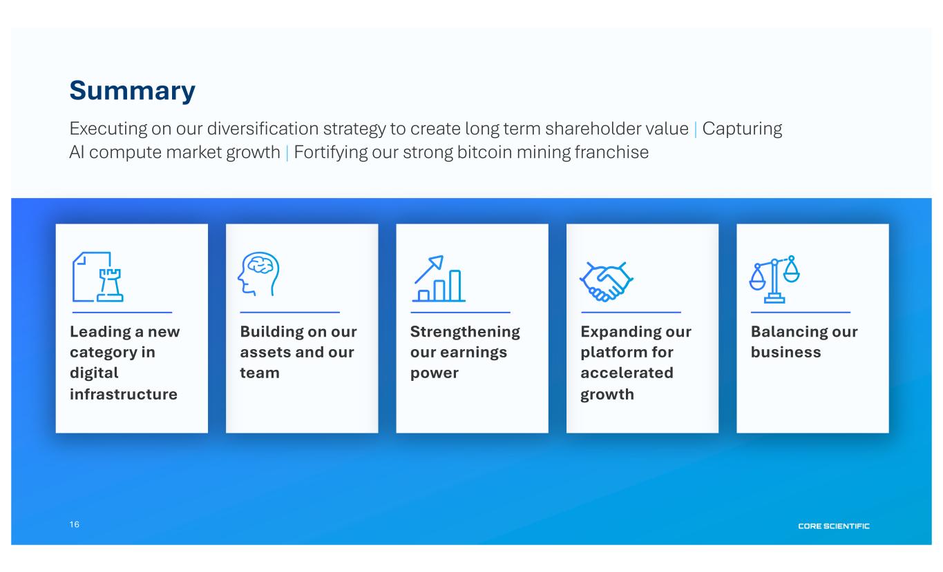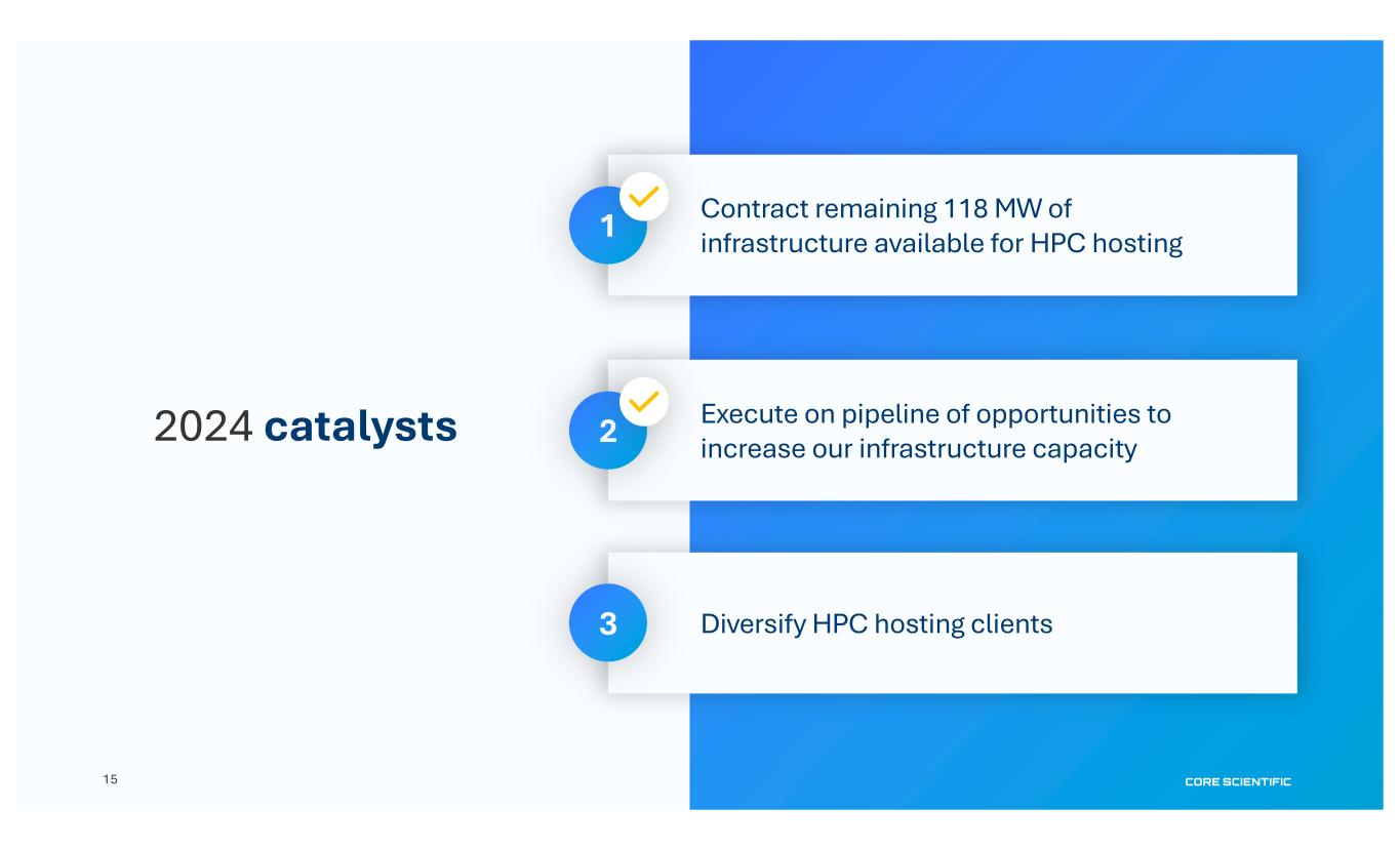 CORE SCIENTIFIC15 2024 catalysts Contract remaining 118 MW of infrastructure available for HPC hosting Execute on pipeline of opportunities to increase our infrastructure capacity Diversify HPC hosting clients 1 2 3