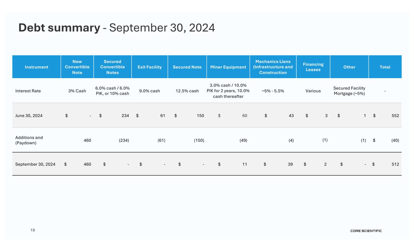 19 Debt summary - September 30, 2024 Instrument New Convertible Note Secured Convertible Notes Exit Facility Secured Note Miner Equipment Mechanics Liens (Infrastructure and Construction Financing Leases Other Total Interest Rate 3% Cash 6.0% cash / 6.0% PIK, or 10% cash 9.0% cash 12.5% cash 3.0% cash / 10.0% PIK for 2 years, 10.0% cash thereafter ~5% - 5.5% Various Secured Facility Mortgage (~5%) - June 30, 2024 $ - $ 234 $ 61 $ 150 $ 60 $ 43 $ 3 $ 1 $ 552 Additions and (Paydown) 460 (234) (61) (150) (49) (4) (1) (1) $ (40) September 30, 2024 $ 460 $ - $ - $ - $ 11 $ 39 $ 2 $ - $ 512