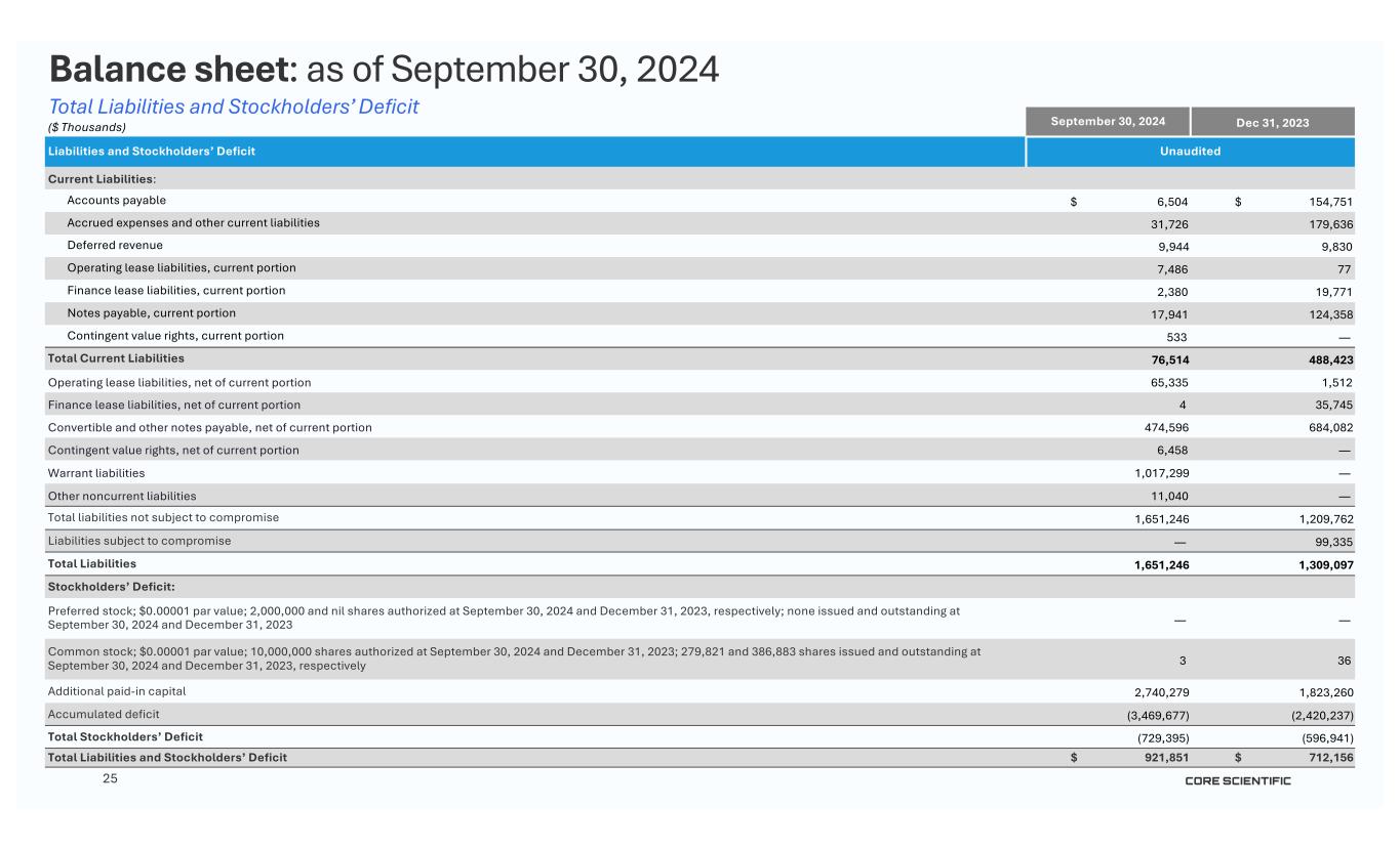 25 Balance sheet: as of September 30, 2024 Total Liabilities and Stockholders’ Deficit ($ Thousands) September 30, 2024 Dec 31, 2023 Liabilities and Stockholders’ Deficit Unaudited Current Liabilities: Accounts payable $ 6,504 $ 154,751 Accrued expenses and other current liabilities 31,726 179,636 Deferred revenue 9,944 9,830 Operating lease liabilities, current portion 7,486 77 Finance lease liabilities, current portion 2,380 19,771 Notes payable, current portion 17,941 124,358 Contingent value rights, current portion 533 — Total Current Liabilities 76,514 488,423 Operating lease liabilities, net of current portion 65,335 1,512 Finance lease liabilities, net of current portion 4 35,745 Convertible and other notes payable, net of current portion 474,596 684,082 Contingent value rights, net of current portion 6,458 — Warrant liabilities 1,017,299 — Other noncurrent liabilities 11,040 — Total liabilities not subject to compromise 1,651,246 1,209,762 Liabilities subject to compromise — 99,335 Total Liabilities 1,651,246 1,309,097 Stockholders’ Deficit: Preferred stock; $0.00001 par value; 2,000,000 and nil shares authorized at September 30, 2024 and December 31, 2023, respectively; none issued and outstanding at September 30, 2024 and December 31, 2023 — — Common stock; $0.00001 par value; 10,000,000 shares authorized at September 30, 2024 and December 31, 2023; 279,821 and 386,883 shares issued and outstanding at September 30, 2024 and December 31, 2023, respectively 3 36 Additional paid-in capital 2,740,279 1,823,260 Accumulated deficit (3,469,677) (2,420,237) Total Stockholders’ Deficit (729,395) (596,941) Total Liabilities and Stockholders’ Deficit $ 921,851 $ 712,156