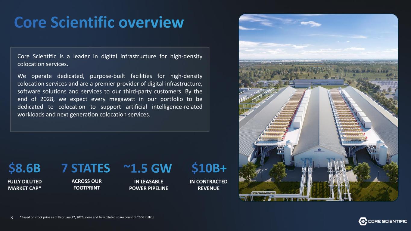 FORWARD-LOOKING STATEMENTS This presentation includes forward-looking statements within the meaning of Section 27A of the Securities Act of 1933, as amended, (the “Securities Act”) and Section 21E of the Securities Exchange Act of 1934, as amended, (the “Exchange Act”). Forward-looking statements may include words such as “aim,” “estimate,” “plan,” “project,” “forecast,” “goal,” “intend,” “will,” “expect,” “anticipate,” “believe,” “seek,” “target” or other similar expressions that predict or indicate future events or trends or that are not statements of historical matters. These forward-looking statements include, but are not limited to, statements regarding projections, estimates and forecasts of revenue and other financial and performance metrics, projections of market opportunity and expectations, the Company’s ability to scale and grow its business, successfully complete construction of its data centers, source sufficient electrical energy, necessary long lead infrastructure components, supplies and equipment, the advantages and expected growth of the Company, the Company’s ability to source and retain talent, and our ability to source and consummate acquisitions of entities holding suitable land and power. These statements are provided for illustrative purposes only and are based on various assumptions, whether or not identified in this press release, and on the current expectations of the Company’s management. These forward- looking statements are not intended to serve, and must not be relied on by any investor, as a guarantee, an assurance, a prediction or a definitive statement of fact or probability. Actual events and circumstances are difficult or impossible to predict and will differ from assumptions. Many actual events and circumstances are beyond the control of the Company.These forward-looking statements are not guarantees of future performance and are subject to risks, uncertainties and assumptions, known or unknown, that could cause actual results to vary materially from those indicated or anticipated. These risks, assumptions and uncertainties include those described in Part I. Item 1A. — “Risk Factors” of the Company’s Annual Report on Form 10-K for the year ended December 31, 2025. If one or more of these risks or uncertainties materializes, or if underlying assumptions prove incorrect, actual results may vary materially from those indicated or anticipated by such forward-looking statements. There may be additional risks that the Company could not presently know or that the Company currently believes are immaterial that could also cause actual results to differ from those contained in the forward-looking statements. In addition, forward-looking statements reflect the Company’s expectations, plans or forecasts of future events and views as of the date of this press release and should not be relied upon as representing the Company’s assessments as of any date subsequent to the date of this press release. The Company anticipates that subsequent events and developments will cause the Company’s assessments to change. However, while the Company may elect to update these forward-looking statements at some point in the future, the Company specifically disclaims any obligation to do so. Accordingly, you should not place undue reliance on these forward-looking statements, which speak only as of the date they are made. 2