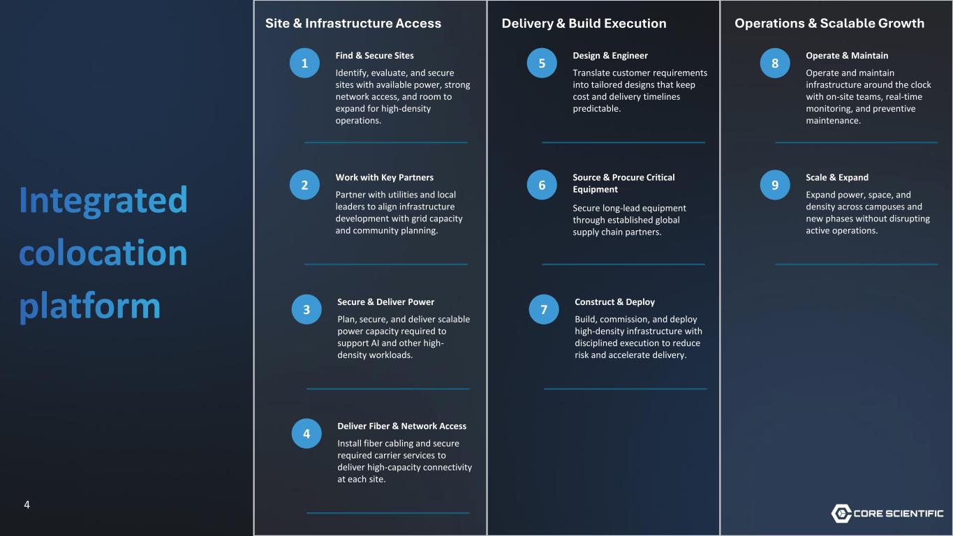 3 Core Scientific overview Core Scientific is a leader in digital infrastructure for high-density colocation services. We operate dedicated, purpose-built facilities for high-density colocation services and are a premier provider of digital infrastructure, software solutions and services to our third-party customers. By the end of 2028, we expect every megawatt in our portfolio to be dedicated to colocation to support artificial intelligence-related workloads and next generation colocation services. $8.6B FULLY DILUTED MARKET CAP* 7 STATES ~1.5 GW $10B+ IN LEASABLE POWER PIPELINE IN CONTRACTED REVENUE ACROSS OUR FOOTPRINT *Based on stock price as of February 27, 2026, close and fully diluted share count of ~506 million