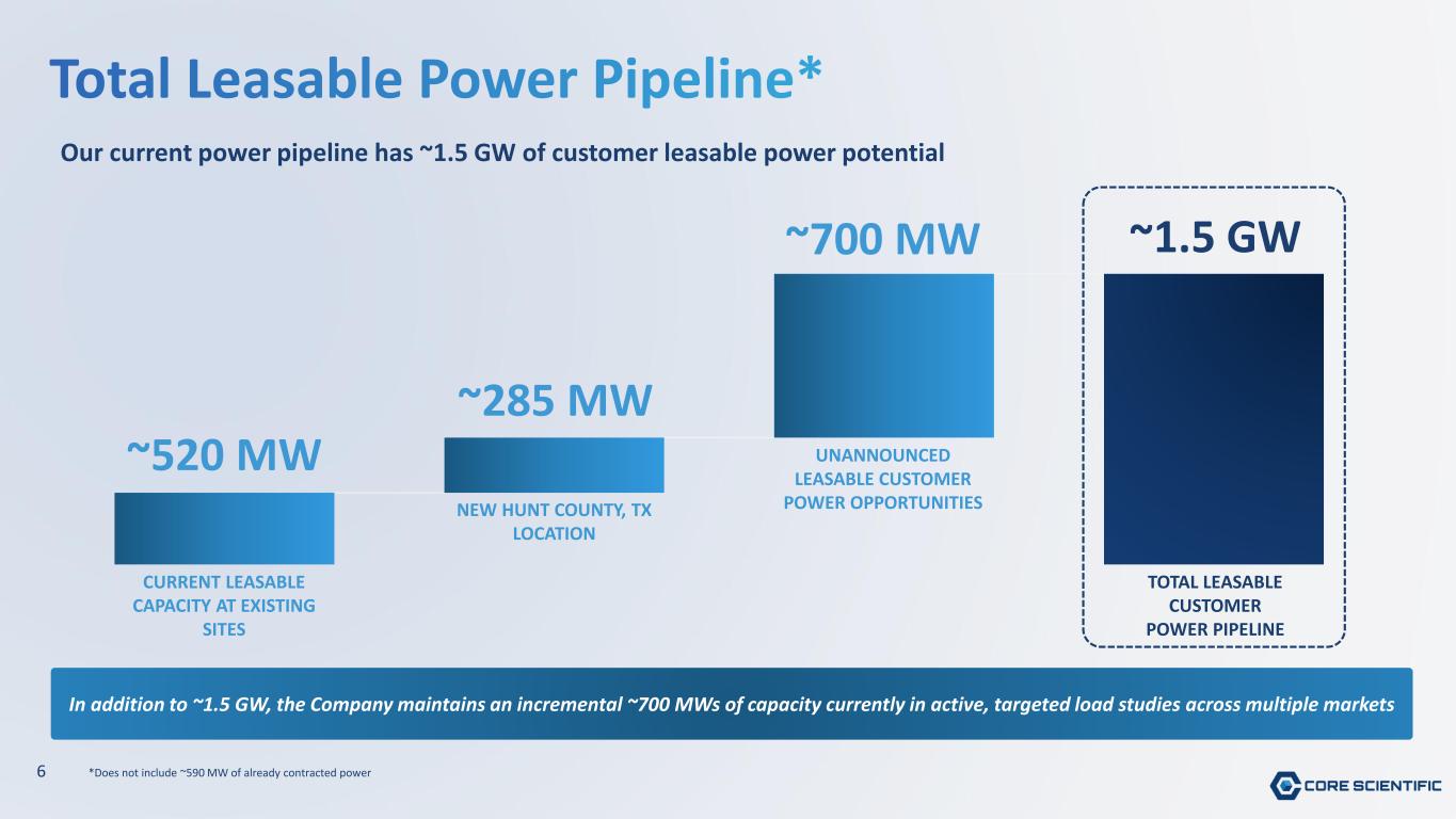 5 Over 800 MW of announced leasable power capacity Denton, TX Leased power: ~260MW Bold and underlined numbers indicate updates to leasable power disclosed on October 30, 2025 Numbers as of March 2, 2026 Dalton, GA Leased power: ~175MW Muskogee, OK Leased power: ~70MW Marble, NC Leased power: ~65MW Austin, TX Leased power: ~20MW Hunt County, TX Leasable power: ~285MW Pecos, TX Leasable power: ~200MW Dalton, GA Leasable power: ~120MW Calvert City, KY Leasable power: ~100MW Grand Forks, ND Leasable power: ~70MW Dallas Atlanta contracted sites Customer leasable sites Total leased power ~590 MW Auburn, AL Leasable power: ~30MW Leasable power ~805 MW
