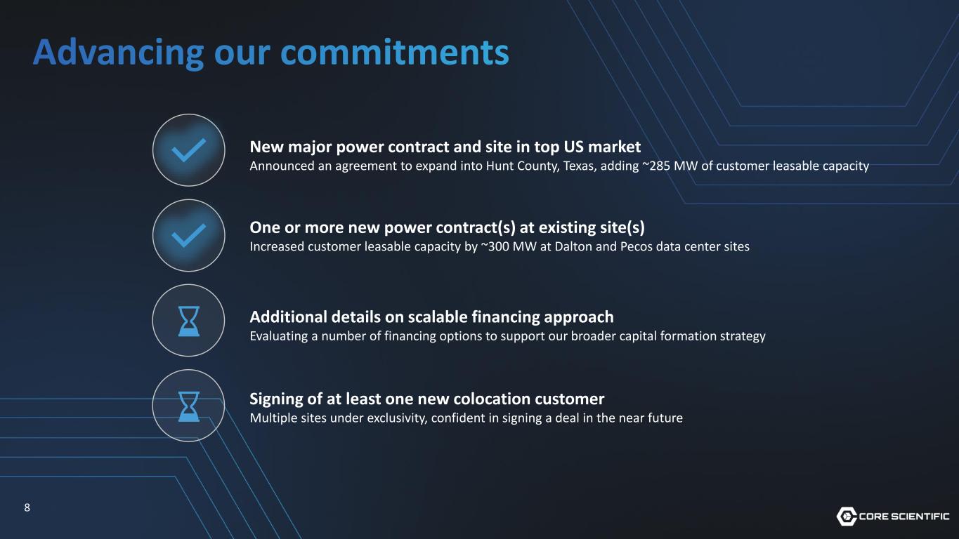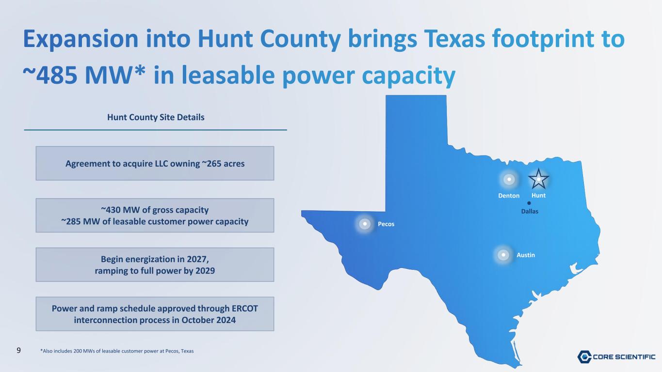 Advancing our commitments New major power contract and site in top US market Announced an agreement to expand into Hunt County, Texas, adding ~285 MW of customer leasable capacity One or more new power contract(s) at existing site(s) Increased customer leasable capacity by ~300 MW at Dalton and Pecos data center sites Additional details on scalable financing approach Evaluating a number of financing options to support our broader capital formation strategy Signing of at least one new colocation customer Multiple sites under exclusivity, confident in signing a deal in the near future 8