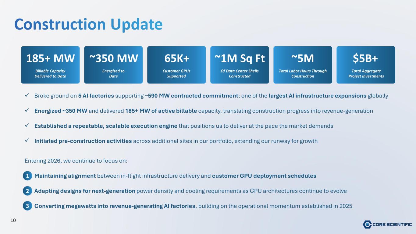 Construction Update Billable Capacity Delivered to Date Energized to Date Of Data Center Shells Constructed Total Aggregate Project Investments Customer GPUs Supported Total Labor Hours Through Construction 185+ MW ~350 MW ~1M Sq Ft $5B+65K+ ~5M 10 ✓ Broke ground on 5 AI factories supporting ~590 MW contracted commitment; one of the largest AI infrastructure expansions globally ✓ Energized ~350 MW and delivered 185+ MW of active billable capacity, translating construction progress into revenue-generation ✓ Established a repeatable, scalable execution engine that positions us to deliver at the pace the market demands ✓ Initiated pre-construction activities across additional sites in our portfolio, extending our runway for growth Entering 2026, we continue to focus on: • Maintaining alignment between in-flight infrastructure delivery and customer GPU deployment schedules • Adapting designs for next-generation power density and cooling requirements as GPU architectures continue to evolve • Converting megawatts into revenue-generating AI factories, building on the operational momentum established in 2025 1 2 3