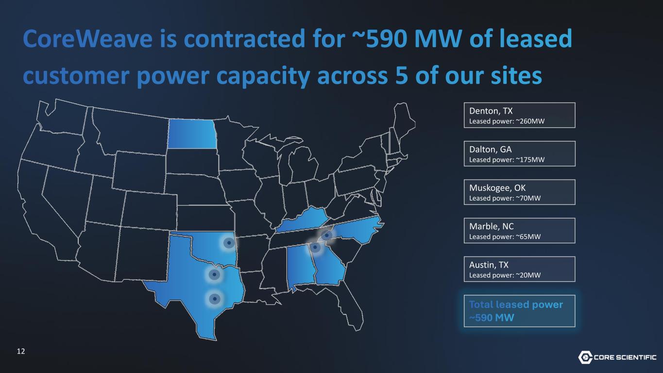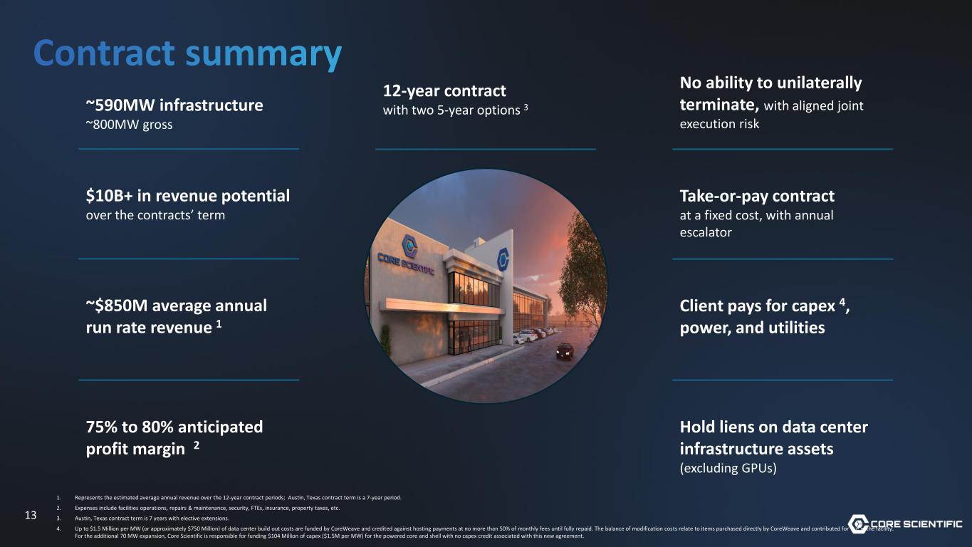 12 CoreWeave is contracted for ~590 MW of leased customer power capacity across 5 of our sites Denton, TX Leased power: ~260MW Dalton, GA Leased power: ~175MW Muskogee, OK Leased power: ~70MW Marble, NC Leased power: ~65MW Austin, TX Leased power: ~20MW Total leased power ~590 MW