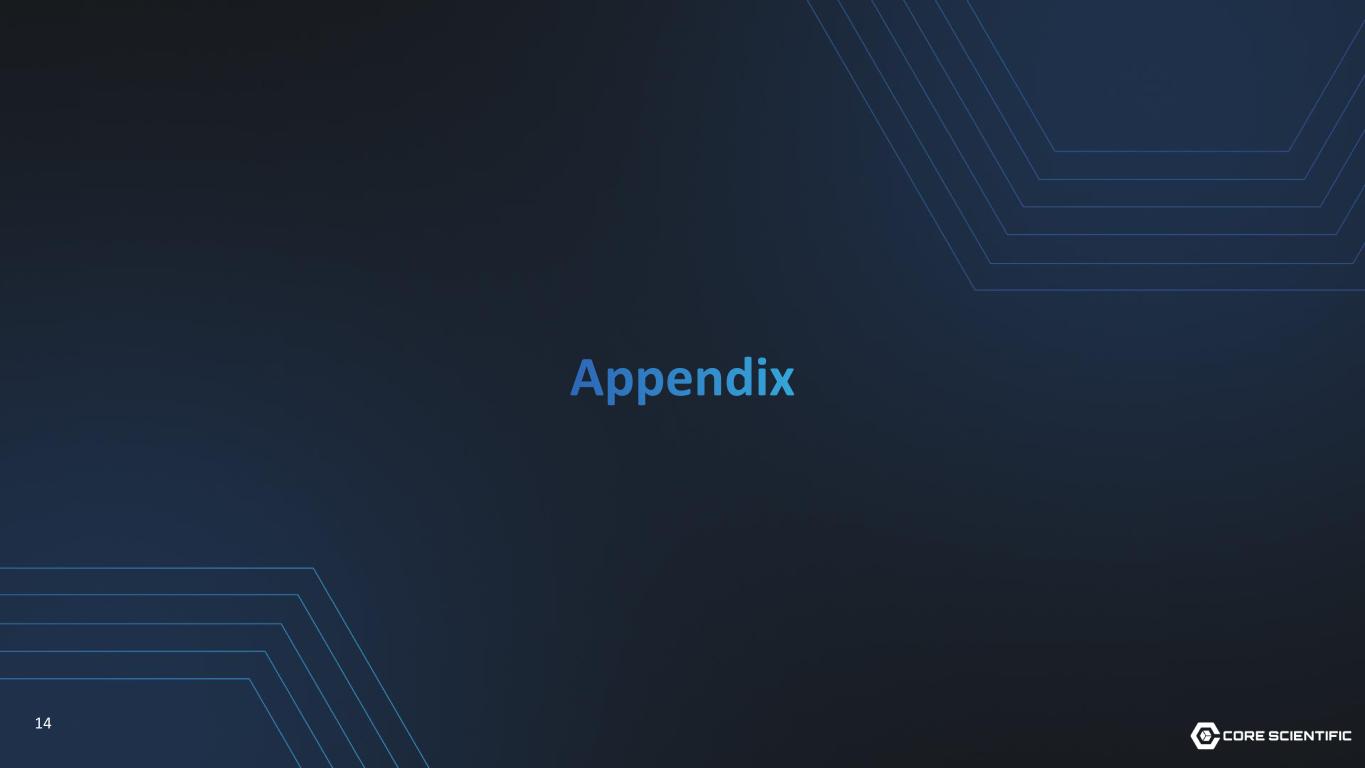 13 Contract summary ~590MW infrastructure ~800MW gross $10B+ in revenue potential over the contracts’ term ~$850M average annual run rate revenue 1 No ability to unilaterally terminate, with aligned joint execution risk Take-or-pay contract at a fixed cost, with annual escalator Client pays for capex 4, power, and utilities 1. Represents the estimated average annual revenue over the 12-year contract periods; Austin, Texas contract term is a 7-year period. 2. Expenses include facilities operations, repairs & maintenance, security, FTEs, insurance, property taxes, etc. 3. Austin, Texas contract term is 7 years with elective extensions. 4. Up to $1.5 Million per MW (or approximately $750 Million) of data center build out costs are funded by CoreWeave and credited against hosting payments at no more than 50% of monthly fees until fully repaid. The balance of modification costs relate to items purchased directly by CoreWeave and contributed for use in the facility. For the additional 70 MW expansion, Core Scientific is responsible for funding $104 Million of capex ($1.5M per MW) for the powered core and shell with no capex credit associated with this new agreement. 12-year contract with two 5-year options 3 75% to 80% anticipated profit margin 2 Hold liens on data center infrastructure assets (excluding GPUs)
