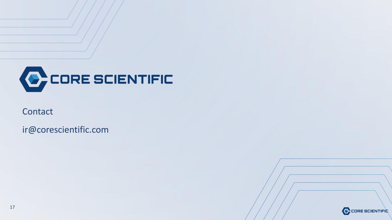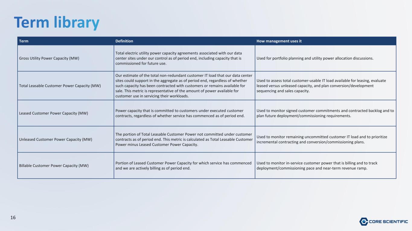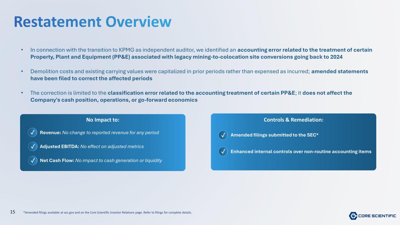 15 Restatement Overview • In connection with the transition to KPMG as independent auditor, we identified an accounting error related to the treatment of certain Property, Plant and Equipment (PP&E) associated with legacy mining-to-colocation site conversions going back to 2024 • Demolition costs and existing carrying values were capitalized in prior periods rather than expensed as incurred; amended statements have been filed to correct the affected periods • The correction is limited to the classification error related to the accounting treatment of certain PP&E; it does not affect the Company's cash position, operations, or go-forward economics No Impact to: Adjusted EBITDA: No effect on adjusted metrics Revenue: No change to reported revenue for any period Net Cash Flow: No impact to cash generation or liquidity ✓ ✓ ✓ Controls & Remediation: Enhanced internal controls over non-routine accounting items Amended filings submitted to the SEC*✓ ✓ *Amended filings available at sec.gov and on the Core Scientific Investor Relations page. Refer to filings for complete details.