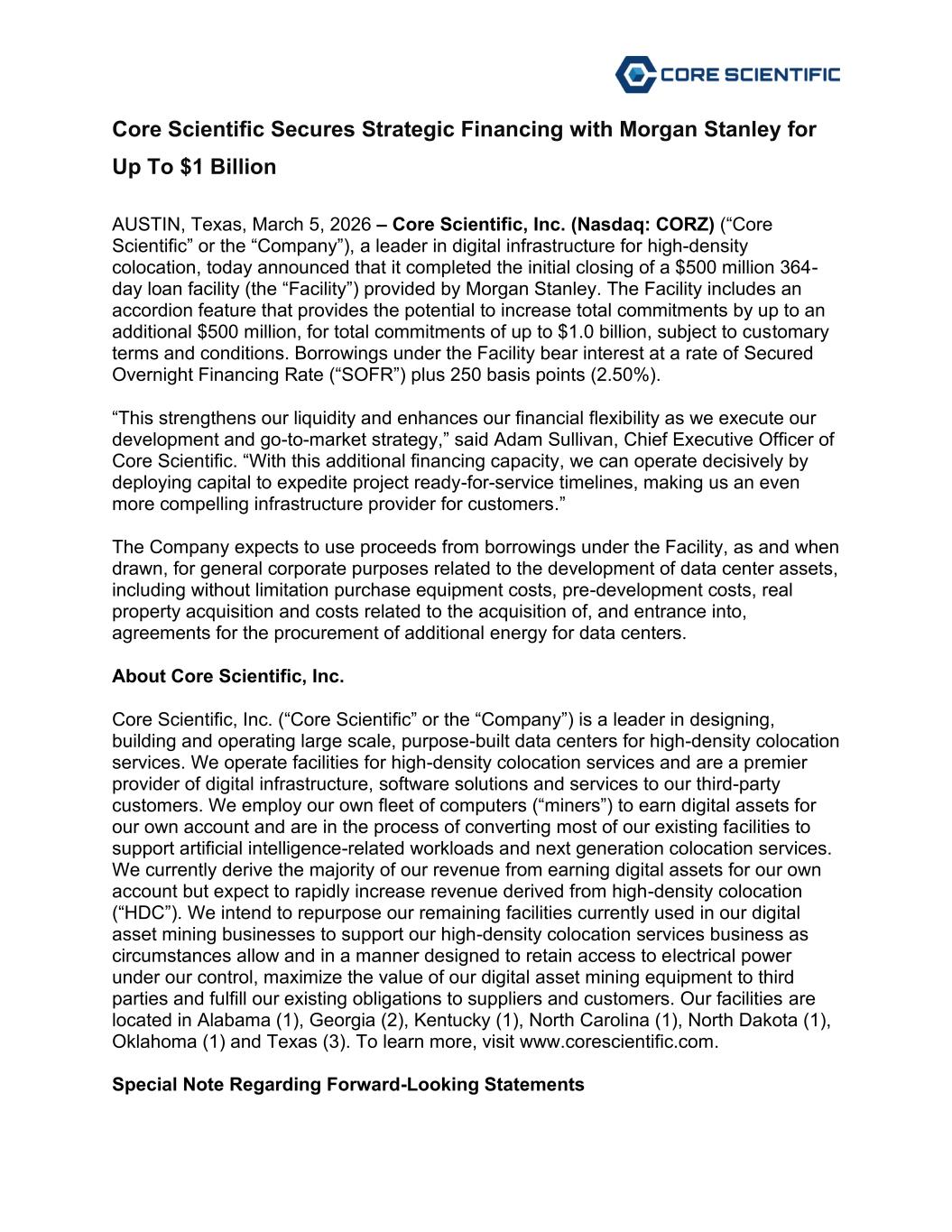 Core Scientific Secures Strategic Financing with Morgan Stanley for Up To $1 Billion AUSTIN, Texas, March 5, 2026 – Core Scientific, Inc. (Nasdaq: CORZ) (“Core Scientific” or the “Company”), a leader in digital infrastructure for high-density colocation, today announced that it completed the initial closing of a $500 million 364- day loan facility (the “Facility”) provided by Morgan Stanley. The Facility includes an accordion feature that provides the potential to increase total commitments by up to an additional $500 million, for total commitments of up to $1.0 billion, subject to customary terms and conditions. Borrowings under the Facility bear interest at a rate of Secured Overnight Financing Rate (“SOFR”) plus 250 basis points (2.50%). “This strengthens our liquidity and enhances our financial flexibility as we execute our development and go-to-market strategy,” said Adam Sullivan, Chief Executive Officer of Core Scientific. “With this additional financing capacity, we can operate decisively by deploying capital to expedite project ready-for-service timelines, making us an even more compelling infrastructure provider for customers.” The Company expects to use proceeds from borrowings under the Facility, as and when drawn, for general corporate purposes related to the development of data center assets, including without limitation purchase equipment costs, pre-development costs, real property acquisition and costs related to the acquisition of, and entrance into, agreements for the procurement of additional energy for data centers. About Core Scientific, Inc. Core Scientific, Inc. (“Core Scientific” or the “Company”) is a leader in designing, building and operating large scale, purpose-built data centers for high-density colocation services. We operate facilities for high-density colocation services and are a premier provider of digital infrastructure, software solutions and services to our third-party customers. We employ our own fleet of computers (“miners”) to earn digital assets for our own account and are in the process of converting most of our existing facilities to support artificial intelligence-related workloads and next generation colocation services. We currently derive the majority of our revenue from earning digital assets for our own account but expect to rapidly increase revenue derived from high-density colocation (“HDC”). We intend to repurpose our remaining facilities currently used in our digital asset mining businesses to support our high-density colocation services business as circumstances allow and in a manner designed to retain access to electrical power under our control, maximize the value of our digital asset mining equipment to third parties and fulfill our existing obligations to suppliers and customers. Our facilities are located in Alabama (1), Georgia (2), Kentucky (1), North Carolina (1), North Dakota (1), Oklahoma (1) and Texas (3). To learn more, visit www.corescientific.com. Special Note Regarding Forward-Looking Statements