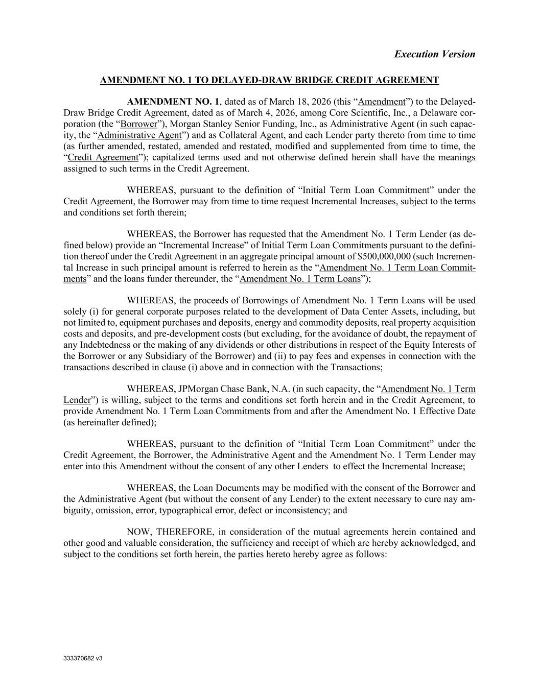 333370682 v3 Execution Version AMENDMENT NO. 1 TO DELAYED-DRAW BRIDGE CREDIT AGREEMENT AMENDMENT NO. 1, dated as of March 18, 2026 (this “Amendment”) to the Delayed- Draw Bridge Credit Agreement, dated as of March 4, 2026, among Core Scientific, Inc., a Delaware cor- poration (the “Borrower”), Morgan Stanley Senior Funding, Inc., as Administrative Agent (in such capac- ity, the “Administrative Agent”) and as Collateral Agent, and each Lender party thereto from time to time (as further amended, restated, amended and restated, modified and supplemented from time to time, the “Credit Agreement”); capitalized terms used and not otherwise defined herein shall have the meanings assigned to such terms in the Credit Agreement. WHEREAS, pursuant to the definition of “Initial Term Loan Commitment” under the Credit Agreement, the Borrower may from time to time request Incremental Increases, subject to the terms and conditions set forth therein; WHEREAS, the Borrower has requested that the Amendment No. 1 Term Lender (as de- fined below) provide an “Incremental Increase” of Initial Term Loan Commitments pursuant to the defini- tion thereof under the Credit Agreement in an aggregate principal amount of $500,000,000 (such Incremen- tal Increase in such principal amount is referred to herein as the “Amendment No. 1 Term Loan Commit- ments” and the loans funder thereunder, the “Amendment No. 1 Term Loans”); WHEREAS, the proceeds of Borrowings of Amendment No. 1 Term Loans will be used solely (i) for general corporate purposes related to the development of Data Center Assets, including, but not limited to, equipment purchases and deposits, energy and commodity deposits, real property acquisition costs and deposits, and pre-development costs (but excluding, for the avoidance of doubt, the repayment of any Indebtedness or the making of any dividends or other distributions in respect of the Equity Interests of the Borrower or any Subsidiary of the Borrower) and (ii) to pay fees and expenses in connection with the transactions described in clause (i) above and in connection with the Transactions; WHEREAS, JPMorgan Chase Bank, N.A. (in such capacity, the “Amendment No. 1 Term Lender”) is willing, subject to the terms and conditions set forth herein and in the Credit Agreement, to provide Amendment No. 1 Term Loan Commitments from and after the Amendment No. 1 Effective Date (as hereinafter defined); WHEREAS, pursuant to the definition of “Initial Term Loan Commitment” under the Credit Agreement, the Borrower, the Administrative Agent and the Amendment No. 1 Term Lender may enter into this Amendment without the consent of any other Lenders to effect the Incremental Increase; WHEREAS, the Loan Documents may be modified with the consent of the Borrower and the Administrative Agent (but without the consent of any Lender) to the extent necessary to cure nay am- biguity, omission, error, typographical error, defect or inconsistency; and NOW, THEREFORE, in consideration of the mutual agreements herein contained and other good and valuable consideration, the sufficiency and receipt of which are hereby acknowledged, and subject to the conditions set forth herein, the parties hereto hereby agree as follows: