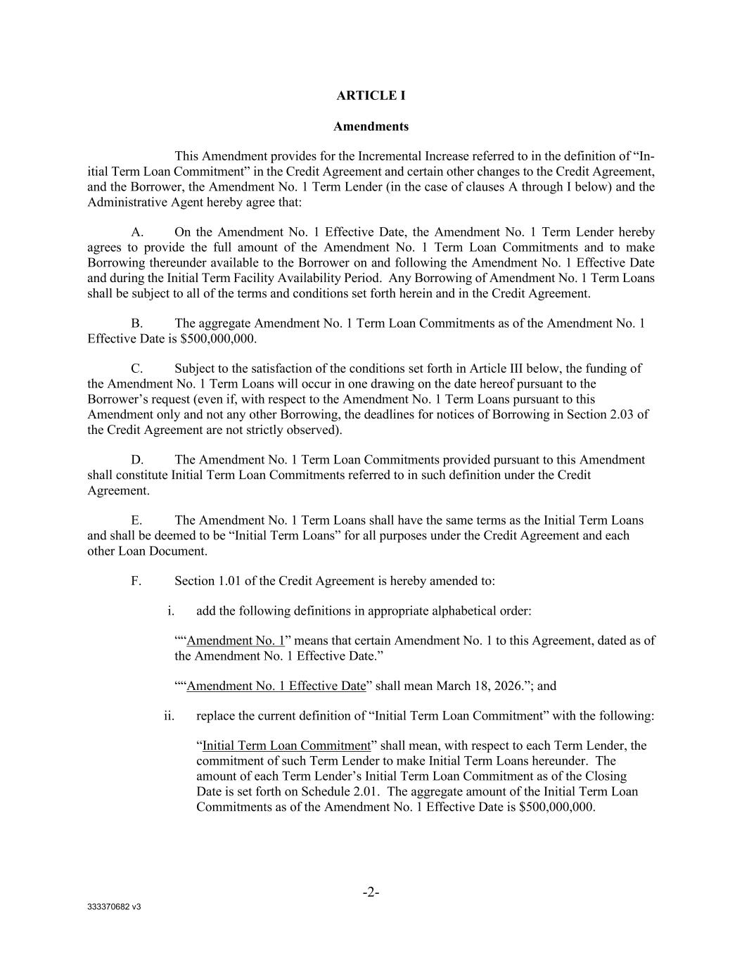 333370682 v3 -2- ARTICLE I Amendments This Amendment provides for the Incremental Increase referred to in the definition of “In- itial Term Loan Commitment” in the Credit Agreement and certain other changes to the Credit Agreement, and the Borrower, the Amendment No. 1 Term Lender (in the case of clauses A through I below) and the Administrative Agent hereby agree that: A. On the Amendment No. 1 Effective Date, the Amendment No. 1 Term Lender hereby agrees to provide the full amount of the Amendment No. 1 Term Loan Commitments and to make Borrowing thereunder available to the Borrower on and following the Amendment No. 1 Effective Date and during the Initial Term Facility Availability Period. Any Borrowing of Amendment No. 1 Term Loans shall be subject to all of the terms and conditions set forth herein and in the Credit Agreement. B. The aggregate Amendment No. 1 Term Loan Commitments as of the Amendment No. 1 Effective Date is $500,000,000. C. Subject to the satisfaction of the conditions set forth in Article III below, the funding of the Amendment No. 1 Term Loans will occur in one drawing on the date hereof pursuant to the Borrower’s request (even if, with respect to the Amendment No. 1 Term Loans pursuant to this Amendment only and not any other Borrowing, the deadlines for notices of Borrowing in Section 2.03 of the Credit Agreement are not strictly observed). D. The Amendment No. 1 Term Loan Commitments provided pursuant to this Amendment shall constitute Initial Term Loan Commitments referred to in such definition under the Credit Agreement. E. The Amendment No. 1 Term Loans shall have the same terms as the Initial Term Loans and shall be deemed to be “Initial Term Loans” for all purposes under the Credit Agreement and each other Loan Document. F. Section 1.01 of the Credit Agreement is hereby amended to: i. add the following definitions in appropriate alphabetical order: ““Amendment No. 1” means that certain Amendment No. 1 to this Agreement, dated as of the Amendment No. 1 Effective Date.” ““Amendment No. 1 Effective Date” shall mean March 18, 2026.”; and ii. replace the current definition of “Initial Term Loan Commitment” with the following: “Initial Term Loan Commitment” shall mean, with respect to each Term Lender, the commitment of such Term Lender to make Initial Term Loans hereunder. The amount of each Term Lender’s Initial Term Loan Commitment as of the Closing Date is set forth on Schedule 2.01. The aggregate amount of the Initial Term Loan Commitments as of the Amendment No. 1 Effective Date is $500,000,000.