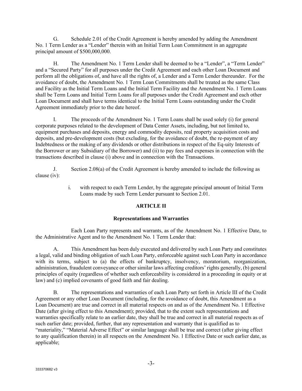 333370682 v3 -3- G. Schedule 2.01 of the Credit Agreement is hereby amended by adding the Amendment No. 1 Term Lender as a “Lender” therein with an Initial Term Loan Commitment in an aggregate principal amount of $500,000,000. H. The Amendment No. 1 Term Lender shall be deemed to be a “Lender”, a “Term Lender” and a “Secured Party” for all purposes under the Credit Agreement and each other Loan Document and perform all the obligations of, and have all the rights of, a Lender and a Term Lender thereunder. For the avoidance of doubt, the Amendment No. 1 Term Loan Commitments shall be treated as the same Class and Facility as the Initial Term Loans and the Initial Term Facility and the Amendment No. 1 Term Loans shall be Term Loans and Initial Term Loans for all purposes under the Credit Agreement and each other Loan Document and shall have terms identical to the Initial Term Loans outstanding under the Credit Agreement immediately prior to the date hereof. I. The proceeds of the Amendment No. 1 Term Loans shall be used solely (i) for general corporate purposes related to the development of Data Center Assets, including, but not limited to, equipment purchases and deposits, energy and commodity deposits, real property acquisition costs and deposits, and pre-development costs (but excluding, for the avoidance of doubt, the re-payment of any Indebtedness or the making of any dividends or other distributions in respect of the Eq-uity Interests of the Borrower or any Subsidiary of the Borrower) and (ii) to pay fees and expenses in connection with the transactions described in clause (i) above and in connection with the Transactions. J. Section 2.08(a) of the Credit Agreement is hereby amended to include the following as clause (iv): i. with respect to each Term Lender, by the aggregate principal amount of Initial Term Loans made by such Term Lender pursuant to Section 2.01. ARTICLE II Representations and Warranties Each Loan Party represents and warrants, as of the Amendment No. 1 Effective Date, to the Administrative Agent and to the Amendment No. 1 Term Lender that: A. This Amendment has been duly executed and delivered by such Loan Party and constitutes a legal, valid and binding obligation of such Loan Party, enforceable against such Loan Party in accordance with its terms, subject to (a) the effects of bankruptcy, insolvency, moratorium, reorganization, administration, fraudulent conveyance or other similar laws affecting creditors’ rights generally, (b) general principles of equity (regardless of whether such enforceability is considered in a proceeding in equity or at law) and (c) implied covenants of good faith and fair dealing. B. The representations and warranties of each Loan Party set forth in Article III of the Credit Agreement or any other Loan Document (including, for the avoidance of doubt, this Amendment as a Loan Document) are true and correct in all material respects on and as of the Amendment No. 1 Effective Date (after giving effect to this Amendment); provided, that to the extent such representations and warranties specifically relate to an earlier date, they shall be true and correct in all material respects as of such earlier date; provided, further, that any representation and warranty that is qualified as to “materiality,” “Material Adverse Effect” or similar language shall be true and correct (after giving effect to any qualification therein) in all respects on the Amendment No. 1 Effective Date or such earlier date, as applicable;