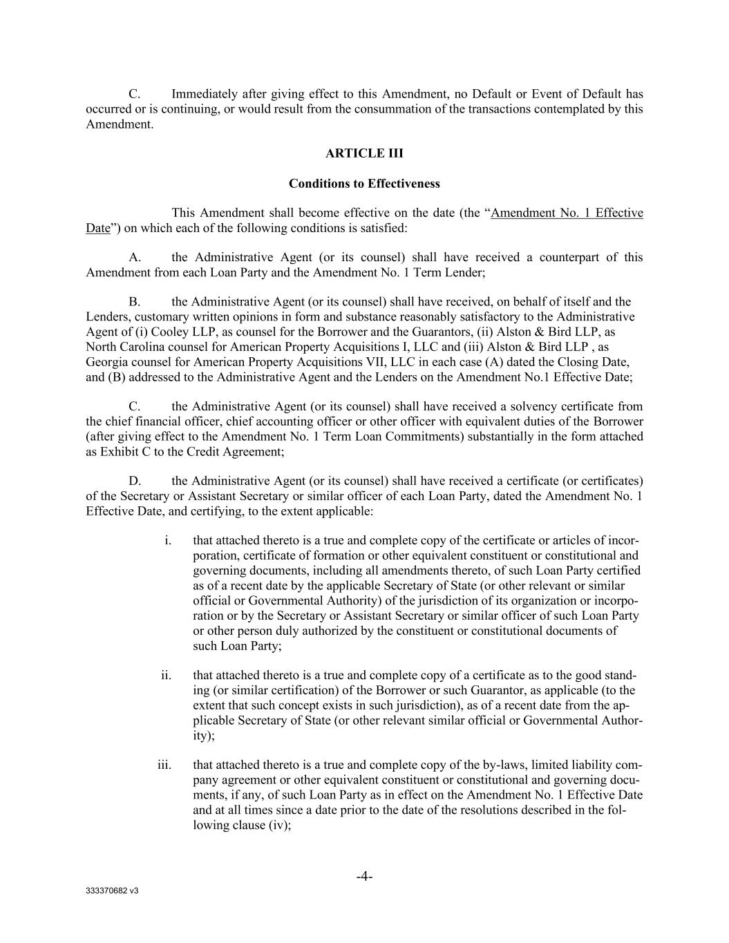 333370682 v3 -4- C. Immediately after giving effect to this Amendment, no Default or Event of Default has occurred or is continuing, or would result from the consummation of the transactions contemplated by this Amendment. ARTICLE III Conditions to Effectiveness This Amendment shall become effective on the date (the “Amendment No. 1 Effective Date”) on which each of the following conditions is satisfied: A. the Administrative Agent (or its counsel) shall have received a counterpart of this Amendment from each Loan Party and the Amendment No. 1 Term Lender; B. the Administrative Agent (or its counsel) shall have received, on behalf of itself and the Lenders, customary written opinions in form and substance reasonably satisfactory to the Administrative Agent of (i) Cooley LLP, as counsel for the Borrower and the Guarantors, (ii) Alston & Bird LLP, as North Carolina counsel for American Property Acquisitions I, LLC and (iii) Alston & Bird LLP , as Georgia counsel for American Property Acquisitions VII, LLC in each case (A) dated the Closing Date, and (B) addressed to the Administrative Agent and the Lenders on the Amendment No.1 Effective Date; C. the Administrative Agent (or its counsel) shall have received a solvency certificate from the chief financial officer, chief accounting officer or other officer with equivalent duties of the Borrower (after giving effect to the Amendment No. 1 Term Loan Commitments) substantially in the form attached as Exhibit C to the Credit Agreement; D. the Administrative Agent (or its counsel) shall have received a certificate (or certificates) of the Secretary or Assistant Secretary or similar officer of each Loan Party, dated the Amendment No. 1 Effective Date, and certifying, to the extent applicable: i. that attached thereto is a true and complete copy of the certificate or articles of incor- poration, certificate of formation or other equivalent constituent or constitutional and governing documents, including all amendments thereto, of such Loan Party certified as of a recent date by the applicable Secretary of State (or other relevant or similar official or Governmental Authority) of the jurisdiction of its organization or incorpo- ration or by the Secretary or Assistant Secretary or similar officer of such Loan Party or other person duly authorized by the constituent or constitutional documents of such Loan Party; ii. that attached thereto is a true and complete copy of a certificate as to the good stand- ing (or similar certification) of the Borrower or such Guarantor, as applicable (to the extent that such concept exists in such jurisdiction), as of a recent date from the ap- plicable Secretary of State (or other relevant similar official or Governmental Author- ity); iii. that attached thereto is a true and complete copy of the by-laws, limited liability com- pany agreement or other equivalent constituent or constitutional and governing docu- ments, if any, of such Loan Party as in effect on the Amendment No. 1 Effective Date and at all times since a date prior to the date of the resolutions described in the fol- lowing clause (iv);