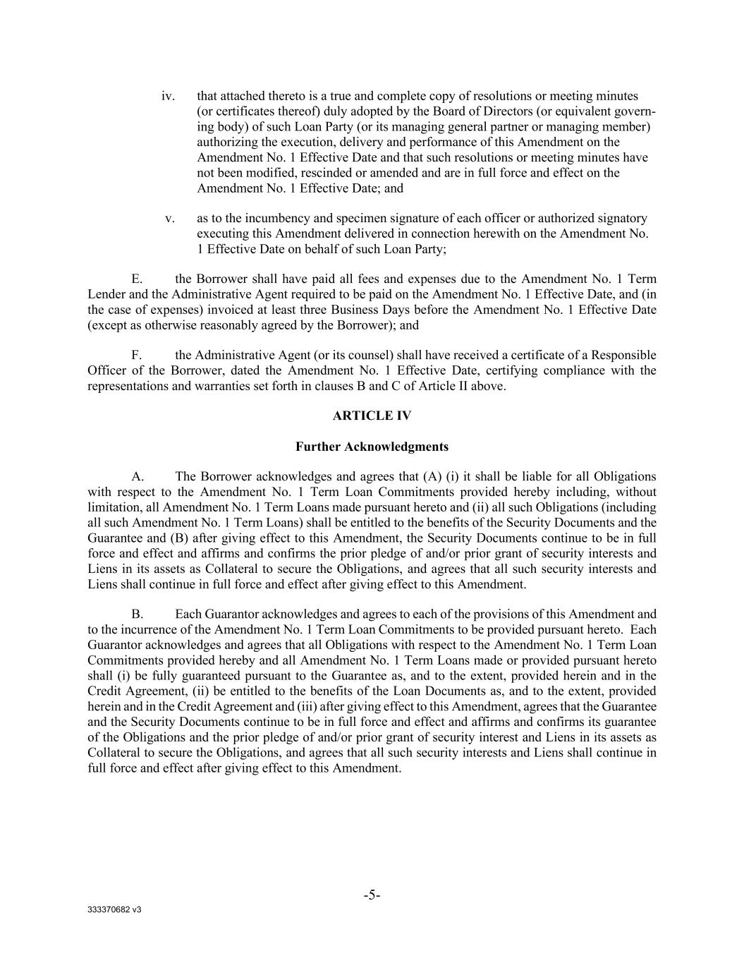 333370682 v3 -5- iv. that attached thereto is a true and complete copy of resolutions or meeting minutes (or certificates thereof) duly adopted by the Board of Directors (or equivalent govern- ing body) of such Loan Party (or its managing general partner or managing member) authorizing the execution, delivery and performance of this Amendment on the Amendment No. 1 Effective Date and that such resolutions or meeting minutes have not been modified, rescinded or amended and are in full force and effect on the Amendment No. 1 Effective Date; and v. as to the incumbency and specimen signature of each officer or authorized signatory executing this Amendment delivered in connection herewith on the Amendment No. 1 Effective Date on behalf of such Loan Party; E. the Borrower shall have paid all fees and expenses due to the Amendment No. 1 Term Lender and the Administrative Agent required to be paid on the Amendment No. 1 Effective Date, and (in the case of expenses) invoiced at least three Business Days before the Amendment No. 1 Effective Date (except as otherwise reasonably agreed by the Borrower); and F. the Administrative Agent (or its counsel) shall have received a certificate of a Responsible Officer of the Borrower, dated the Amendment No. 1 Effective Date, certifying compliance with the representations and warranties set forth in clauses B and C of Article II above. ARTICLE IV Further Acknowledgments A. The Borrower acknowledges and agrees that (A) (i) it shall be liable for all Obligations with respect to the Amendment No. 1 Term Loan Commitments provided hereby including, without limitation, all Amendment No. 1 Term Loans made pursuant hereto and (ii) all such Obligations (including all such Amendment No. 1 Term Loans) shall be entitled to the benefits of the Security Documents and the Guarantee and (B) after giving effect to this Amendment, the Security Documents continue to be in full force and effect and affirms and confirms the prior pledge of and/or prior grant of security interests and Liens in its assets as Collateral to secure the Obligations, and agrees that all such security interests and Liens shall continue in full force and effect after giving effect to this Amendment. B. Each Guarantor acknowledges and agrees to each of the provisions of this Amendment and to the incurrence of the Amendment No. 1 Term Loan Commitments to be provided pursuant hereto. Each Guarantor acknowledges and agrees that all Obligations with respect to the Amendment No. 1 Term Loan Commitments provided hereby and all Amendment No. 1 Term Loans made or provided pursuant hereto shall (i) be fully guaranteed pursuant to the Guarantee as, and to the extent, provided herein and in the Credit Agreement, (ii) be entitled to the benefits of the Loan Documents as, and to the extent, provided herein and in the Credit Agreement and (iii) after giving effect to this Amendment, agrees that the Guarantee and the Security Documents continue to be in full force and effect and affirms and confirms its guarantee of the Obligations and the prior pledge of and/or prior grant of security interest and Liens in its assets as Collateral to secure the Obligations, and agrees that all such security interests and Liens shall continue in full force and effect after giving effect to this Amendment.