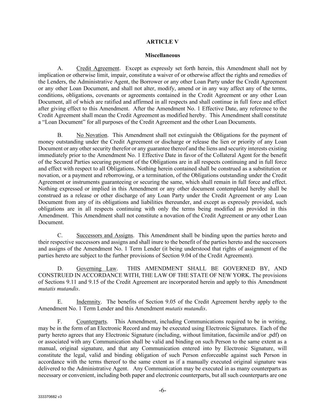333370682 v3 -6- ARTICLE V Miscellaneous A. Credit Agreement. Except as expressly set forth herein, this Amendment shall not by implication or otherwise limit, impair, constitute a waiver of or otherwise affect the rights and remedies of the Lenders, the Administrative Agent, the Borrower or any other Loan Party under the Credit Agreement or any other Loan Document, and shall not alter, modify, amend or in any way affect any of the terms, conditions, obligations, covenants or agreements contained in the Credit Agreement or any other Loan Document, all of which are ratified and affirmed in all respects and shall continue in full force and effect after giving effect to this Amendment. After the Amendment No. 1 Effective Date, any reference to the Credit Agreement shall mean the Credit Agreement as modified hereby. This Amendment shall constitute a “Loan Document” for all purposes of the Credit Agreement and the other Loan Documents. B. No Novation. This Amendment shall not extinguish the Obligations for the payment of money outstanding under the Credit Agreement or discharge or release the lien or priority of any Loan Document or any other security therefor or any guarantee thereof and the liens and security interests existing immediately prior to the Amendment No. 1 Effective Date in favor of the Collateral Agent for the benefit of the Secured Parties securing payment of the Obligations are in all respects continuing and in full force and effect with respect to all Obligations. Nothing herein contained shall be construed as a substitution or novation, or a payment and reborrowing, or a termination, of the Obligations outstanding under the Credit Agreement or instruments guaranteeing or securing the same, which shall remain in full force and effect. Nothing expressed or implied in this Amendment or any other document contemplated hereby shall be construed as a release or other discharge of any Loan Party under the Credit Agreement or any Loan Document from any of its obligations and liabilities thereunder, and except as expressly provided, such obligations are in all respects continuing with only the terms being modified as provided in this Amendment. This Amendment shall not constitute a novation of the Credit Agreement or any other Loan Document. C. Successors and Assigns. This Amendment shall be binding upon the parties hereto and their respective successors and assigns and shall inure to the benefit of the parties hereto and the successors and assigns of the Amendment No. 1 Term Lender (it being understood that rights of assignment of the parties hereto are subject to the further provisions of Section 9.04 of the Credit Agreement). D. Governing Law. THIS AMENDMENT SHALL BE GOVERNED BY, AND CONSTRUED IN ACCORDANCE WITH, THE LAW OF THE STATE OF NEW YORK. The provisions of Sections 9.11 and 9.15 of the Credit Agreement are incorporated herein and apply to this Amendment mutatis mutandis. E. Indemnity. The benefits of Section 9.05 of the Credit Agreement hereby apply to the Amendment No. 1 Term Lender and this Amendment mutatis mutandis. F. Counterparts. This Amendment, including Communications required to be in writing, may be in the form of an Electronic Record and may be executed using Electronic Signatures. Each of the party hereto agrees that any Electronic Signature (including, without limitation, facsimile and/or .pdf) on or associated with any Communication shall be valid and binding on such Person to the same extent as a manual, original signature, and that any Communication entered into by Electronic Signature, will constitute the legal, valid and binding obligation of such Person enforceable against such Person in accordance with the terms thereof to the same extent as if a manually executed original signature was delivered to the Administrative Agent. Any Communication may be executed in as many counterparts as necessary or convenient, including both paper and electronic counterparts, but all such counterparts are one