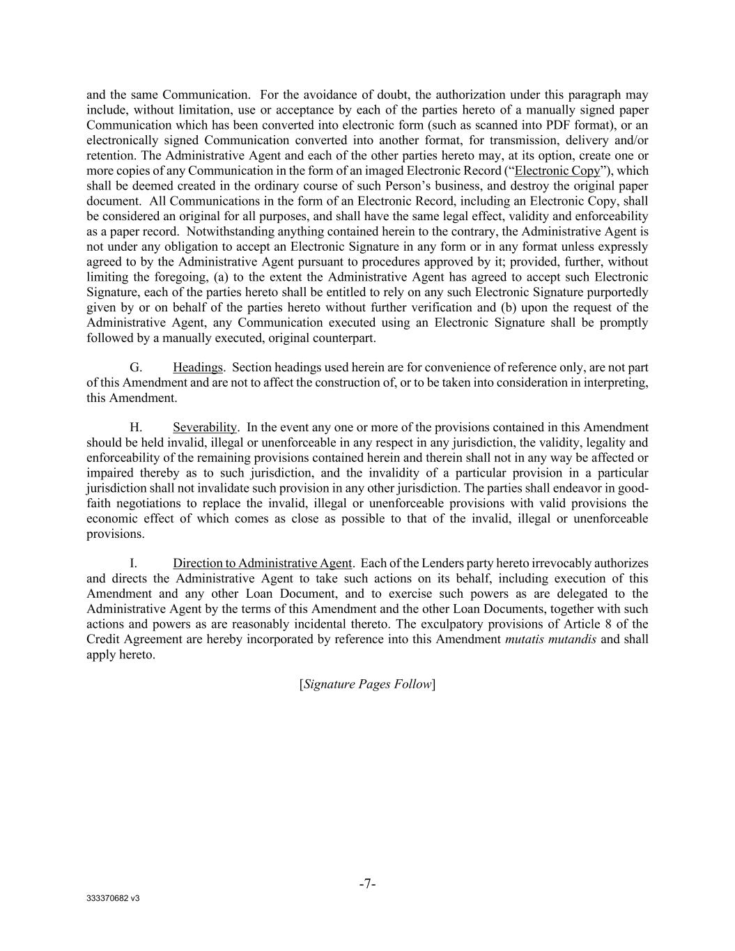 333370682 v3 -7- and the same Communication. For the avoidance of doubt, the authorization under this paragraph may include, without limitation, use or acceptance by each of the parties hereto of a manually signed paper Communication which has been converted into electronic form (such as scanned into PDF format), or an electronically signed Communication converted into another format, for transmission, delivery and/or retention. The Administrative Agent and each of the other parties hereto may, at its option, create one or more copies of any Communication in the form of an imaged Electronic Record (“Electronic Copy”), which shall be deemed created in the ordinary course of such Person’s business, and destroy the original paper document. All Communications in the form of an Electronic Record, including an Electronic Copy, shall be considered an original for all purposes, and shall have the same legal effect, validity and enforceability as a paper record. Notwithstanding anything contained herein to the contrary, the Administrative Agent is not under any obligation to accept an Electronic Signature in any form or in any format unless expressly agreed to by the Administrative Agent pursuant to procedures approved by it; provided, further, without limiting the foregoing, (a) to the extent the Administrative Agent has agreed to accept such Electronic Signature, each of the parties hereto shall be entitled to rely on any such Electronic Signature purportedly given by or on behalf of the parties hereto without further verification and (b) upon the request of the Administrative Agent, any Communication executed using an Electronic Signature shall be promptly followed by a manually executed, original counterpart. G. Headings. Section headings used herein are for convenience of reference only, are not part of this Amendment and are not to affect the construction of, or to be taken into consideration in interpreting, this Amendment. H. Severability. In the event any one or more of the provisions contained in this Amendment should be held invalid, illegal or unenforceable in any respect in any jurisdiction, the validity, legality and enforceability of the remaining provisions contained herein and therein shall not in any way be affected or impaired thereby as to such jurisdiction, and the invalidity of a particular provision in a particular jurisdiction shall not invalidate such provision in any other jurisdiction. The parties shall endeavor in good- faith negotiations to replace the invalid, illegal or unenforceable provisions with valid provisions the economic effect of which comes as close as possible to that of the invalid, illegal or unenforceable provisions. I. Direction to Administrative Agent. Each of the Lenders party hereto irrevocably authorizes and directs the Administrative Agent to take such actions on its behalf, including execution of this Amendment and any other Loan Document, and to exercise such powers as are delegated to the Administrative Agent by the terms of this Amendment and the other Loan Documents, together with such actions and powers as are reasonably incidental thereto. The exculpatory provisions of Article 8 of the Credit Agreement are hereby incorporated by reference into this Amendment mutatis mutandis and shall apply hereto. [Signature Pages Follow]