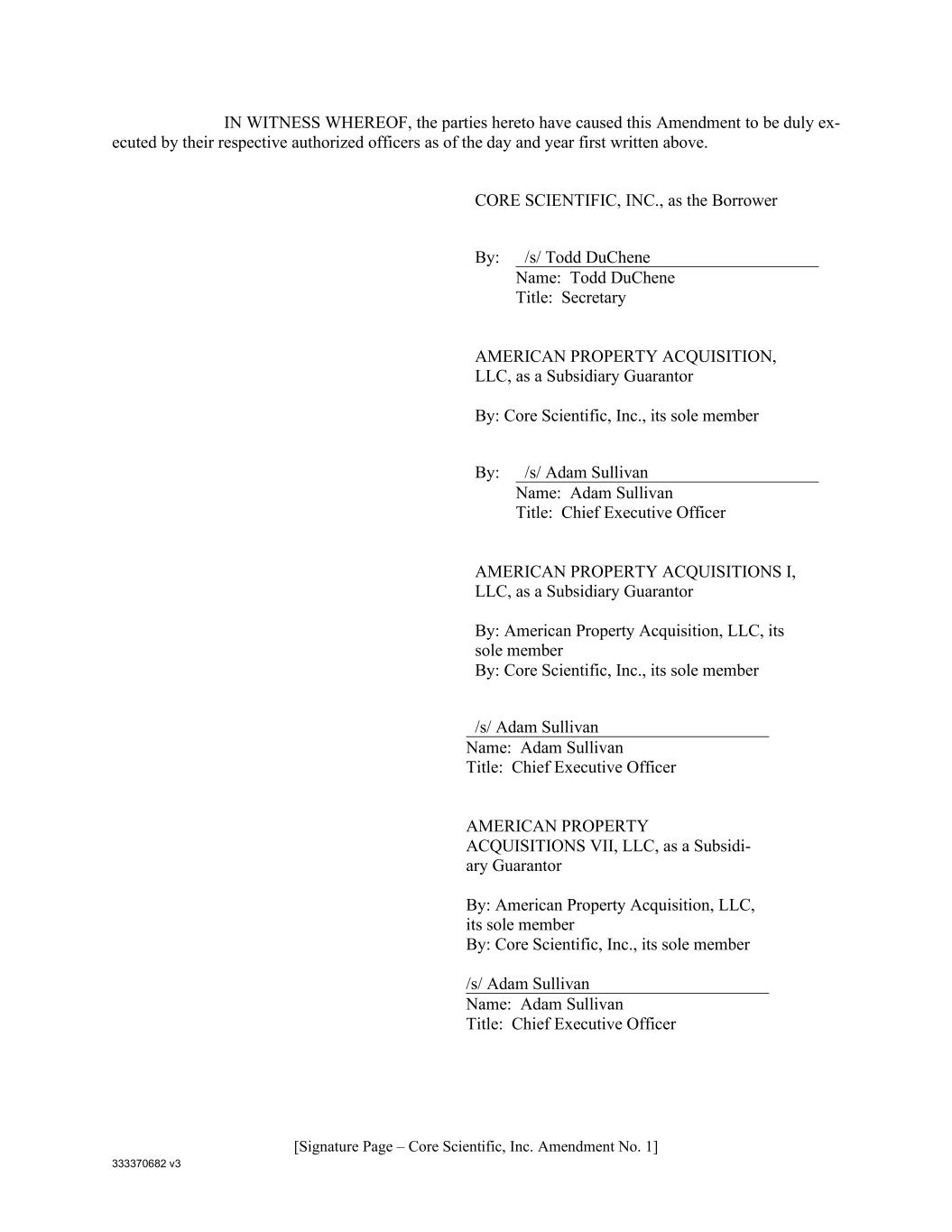 333370682 v3 [Signature Page – Core Scientific, Inc. Amendment No. 1] IN WITNESS WHEREOF, the parties hereto have caused this Amendment to be duly ex- ecuted by their respective authorized officers as of the day and year first written above. CORE SCIENTIFIC, INC., as the Borrower By: /s/ Todd DuChene Name: Todd DuChene Title: Secretary AMERICAN PROPERTY ACQUISITION, LLC, as a Subsidiary Guarantor By: Core Scientific, Inc., its sole member By: /s/ Adam Sullivan Name: Adam Sullivan Title: Chief Executive Officer AMERICAN PROPERTY ACQUISITIONS I, LLC, as a Subsidiary Guarantor By: American Property Acquisition, LLC, its sole member By: Core Scientific, Inc., its sole member /s/ Adam Sullivan Name: Adam Sullivan Title: Chief Executive Officer AMERICAN PROPERTY ACQUISITIONS VII, LLC, as a Subsidi- ary Guarantor By: American Property Acquisition, LLC, its sole member By: Core Scientific, Inc., its sole member /s/ Adam Sullivan Name: Adam Sullivan Title: Chief Executive Officer