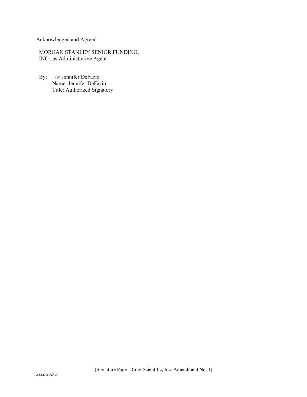 333370682 v3 [Signature Page – Core Scientific, Inc. Amendment No. 1] Acknowledged and Agreed: MORGAN STANLEY SENIOR FUNDING, INC., as Administrative Agent By: /s/ Jennifer DeFazio Name: Jennifer DeFazio Title: Authorized Signatory