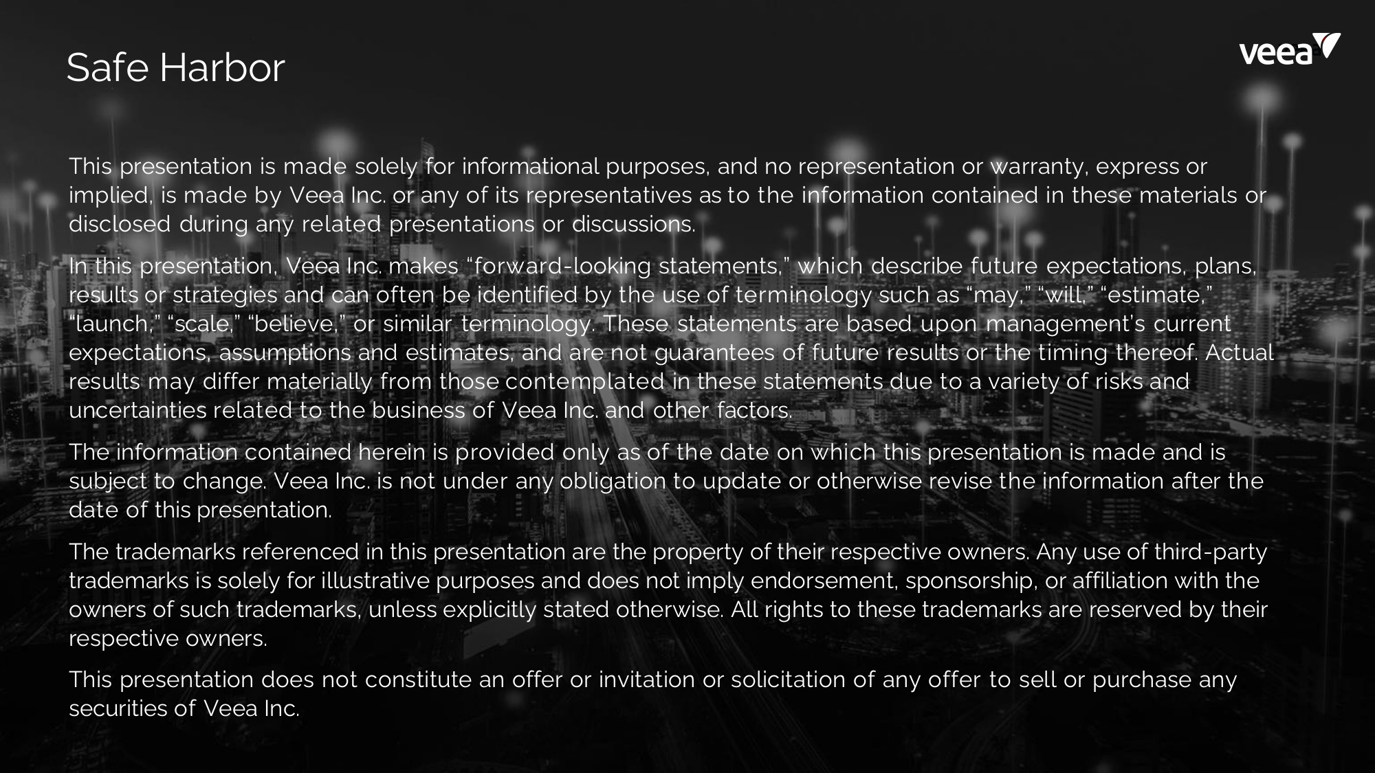 This presentation is made solely for informational purposes, and no representation or warranty, express or implied, is made by Veea Inc. or any of its representatives as to the information contained in these materials or disclosed during any related presentations or discussions. In this presentation, Veea Inc. makes “forward - looking statements,” which describe future expectations, plans, results or strategies and can often be identified by the use of terminology such as “may,” “will,” “estimate,” “launch,” “scale,” “believe,” or similar terminology. These statements are based upon management’s current expectations, assumptions and estimates, and are not guarantees of future results or the timing thereof. Actual results may differ materially from those contemplated in these statements due to a variety of risks and uncertainties related to the business of Veea Inc. and other factors. The information contained herein is provided only as of the date on which this presentation is made and is subject to change. Veea Inc. is not under any obligation to update or otherwise revise the information after the date of this presentation. The trademarks referenced in this presentation are the property of their respective owners. Any use of third - party trademarks is solely for illustrative purposes and does not imply endorsement, sponsorship, or affiliation with the owners of such trademarks, unless explicitly stated otherwise. All rights to these trademarks are reserved by their respective owners. This presentation does not constitute an offer or invitation or solicitation of any offer to sell or purchase any securities of Veea Inc. Safe H a r bo r