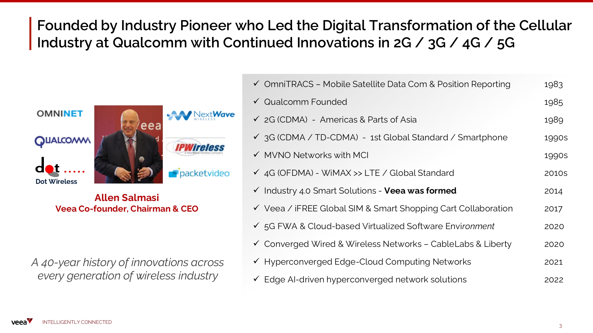 Founded by Industry Pioneer who Led the Digital Transformation of the Cellular Industry at Qualcomm with Continued Innovations in 2G / 3G / 4G / 5G Allen Salmasi Veea C o - fo unde r , Chairman & C E O Dot W i r e l e s s A 40 - year history of innovations across ever y gene r ation of wir e less i nd u s t r y x OmniTRACS – Mobile Satellite Data Com & Position Reporting x Q u al co m m Fo u nded x 2G ( CDM A) - Am er i cas & Pa rts o f As i a x 3G (CDMA / TD - CDMA) - 1st Global Standard / Smartphone x M V NO Networks wi th M CI x 4G (OFDMA) - WiMAX >> LTE / Global Standard x Industry 4.0 Smart Solutions - Veea was formed x V e e a / i FR E E Gl o bal SIM & S m art Shopping Cart C o ll abo rati o n x 5G FWA & Cloud - based Virtualized Software Envi ronment x Con v erged W i red & Wire le ss Networks – CableLabs & Li berty x Hyperconverged Edge - Cloud Computing Networks x Edge AI - driven hyperconverged network solutions 1983 1985 1989 19 9 0 s 19 9 0 s 2010s 2014 2017 2020 2020 2021 2022 I N TE LLI G E N T L Y C O NN EC T E D 3