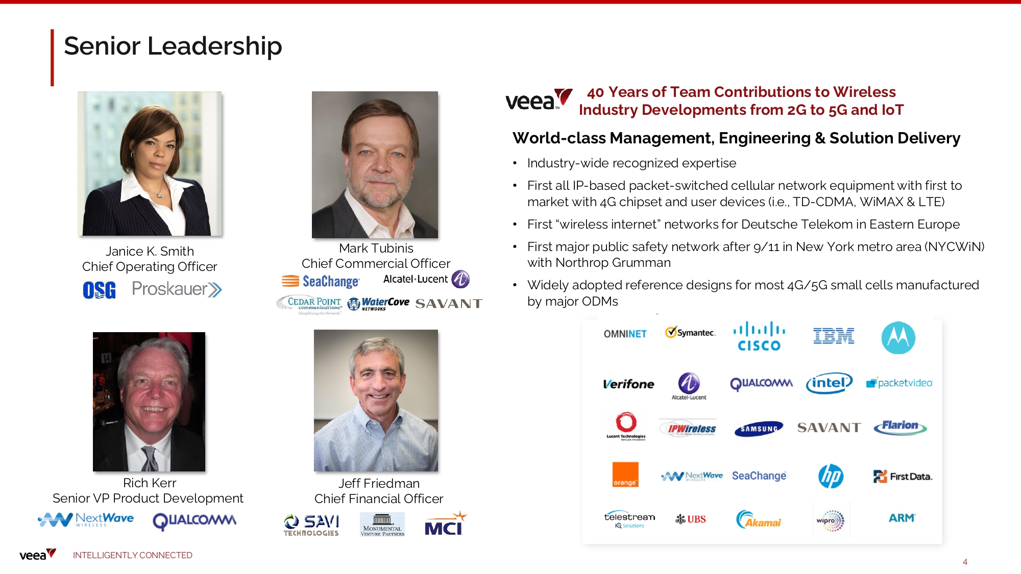 Sen i o r Leadersh i p M a rk T u b inis C h ie f C o mme rcia l Office r Jeff Frie dma n Chief Finan cia l O f ficer Ja n ice K. S mi t h C h ie f Ope ra t ing Office r Rich Kerr S e n io r VP Produ ct D eve lo p m e n t 40 Y e a r s of T e a m Contribu tio n s to Wire l ess Industry Developments from 2G to 5G and IoT World - class Management, Engineering & Solution Delivery I N TE LLI G E N T L Y C O NN EC T E D 4 • Industry - wide recognized expertise • First all IP - based packet - switched cellular network equipment with first to market with 4G chipset and user devices (i.e., TD - CDMA, WiMAX & LTE) • First “wireless internet” networks for Deutsche Telekom in Eastern Europe • First major public safety network after 9/11 in New York metro area (NYCWiN) with Northrop Grumman • Widely adopted reference designs for most 4G/5G small cells manufactured by major ODMs